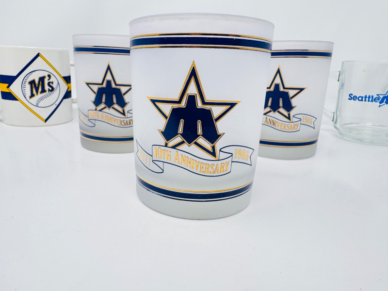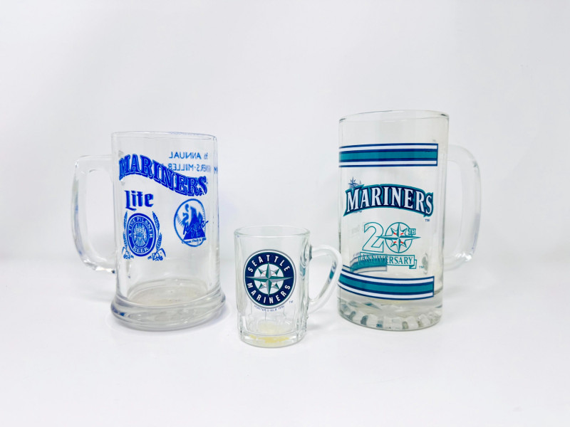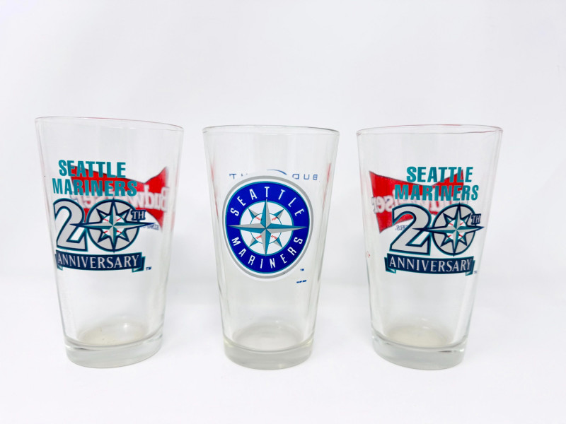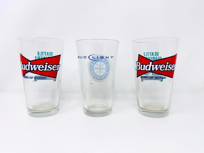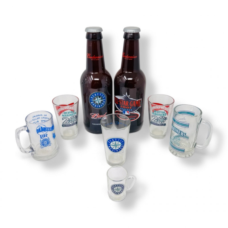 Seattle Mariners Beer Glasses & Budweiser Commemorative Bottles.