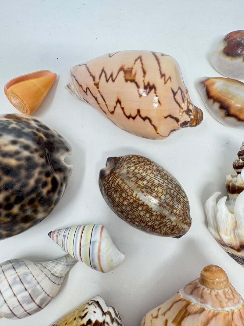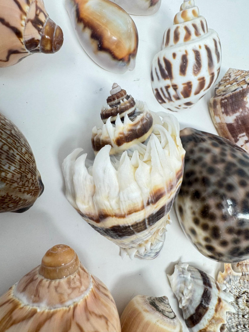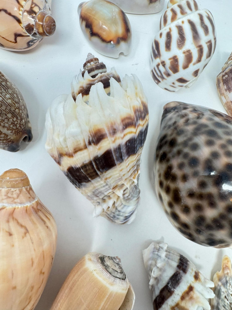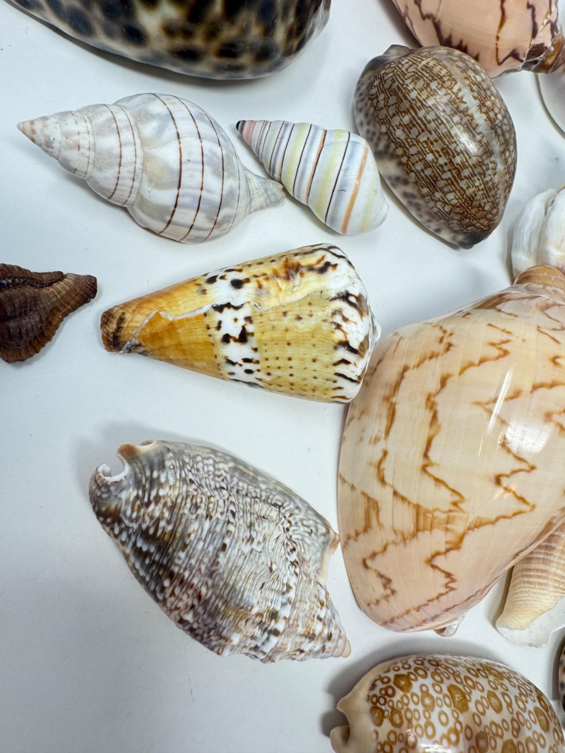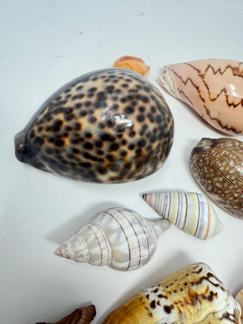 Assorted Sea Shells – Tiger Cowry (Tigris), Arabic Volutes & More. Includes a large speckled Tiger Cowry shell (Cypraea tigris), approx. 3–3.25” One carved cowry shell featuring a tiger scene, approx. 2” Variety of collectible named shells, potentially including: Spotted Cowry / Money Cowry Cymbiola nobilis (Noble Volute / Arabic Volute) Conus species (cone shells) King Crown Conch–type shells Babylonia / whelk–type patterned shells Additional assorted patterned and glossy seashell varieties Good mix of patterns, colors, and sizes.