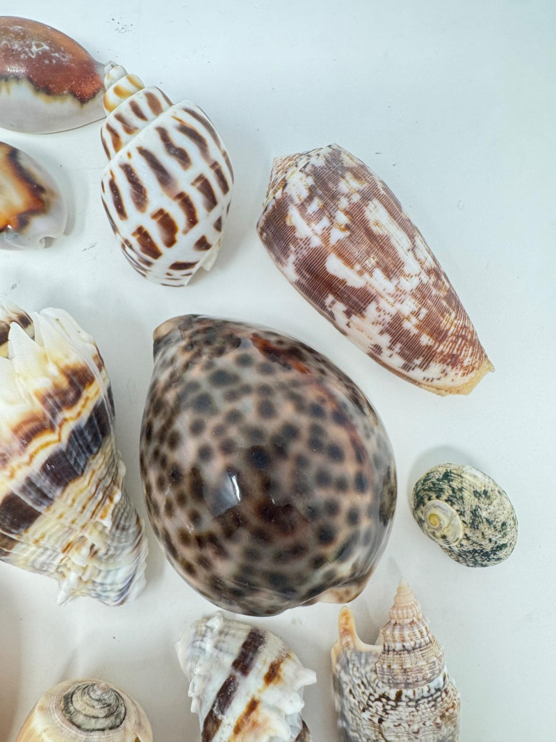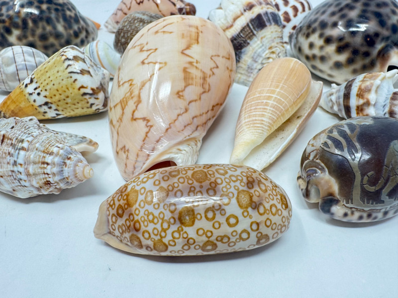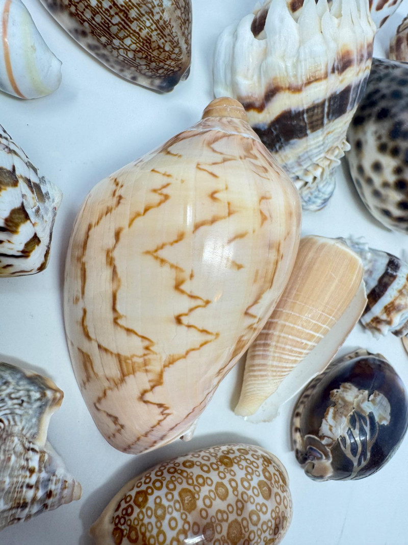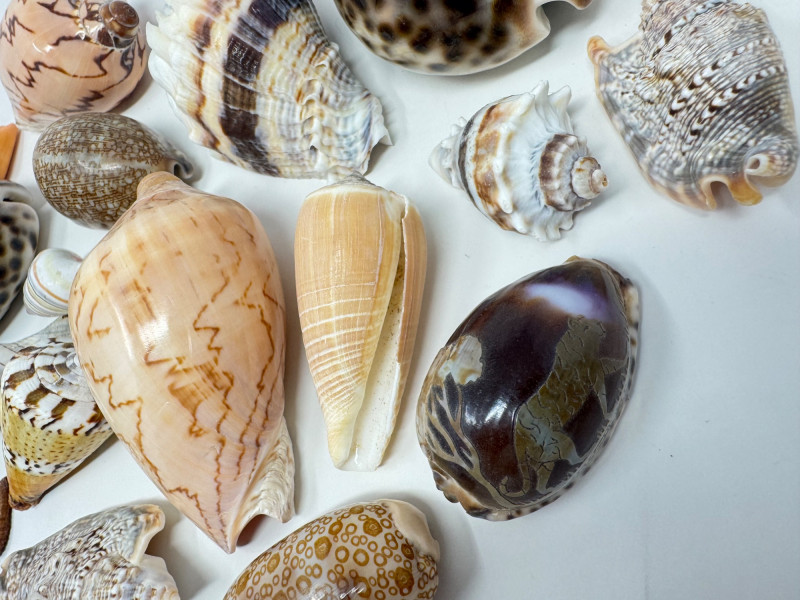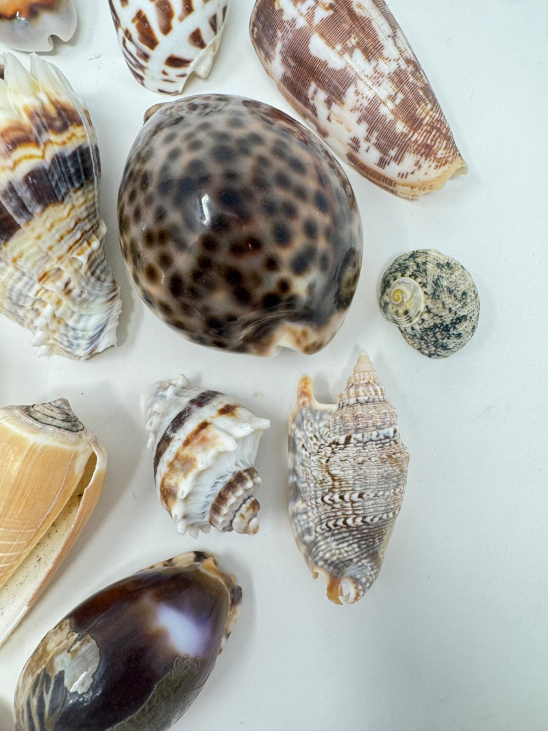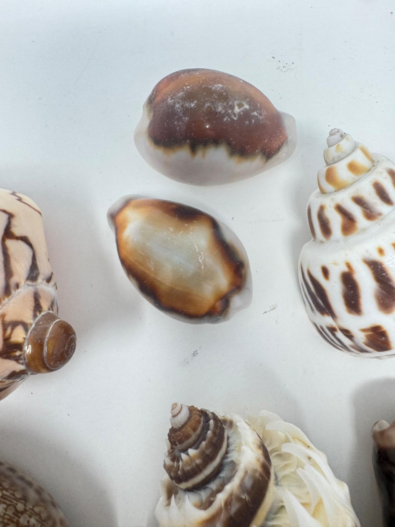Assorted Sea Shells – Tiger Cowry (Tigris), Arabic Volutes & More. Includes a large speckled Tiger Cowry shell (Cypraea tigris), approx. 3–3.25” One carved cowry shell featuring a tiger scene, approx. 2” Variety of collectible named shells, potentially including: Spotted Cowry / Money Cowry Cymbiola nobilis (Noble Volute / Arabic Volute) Conus species (cone shells) King Crown Conch–type shells Babylonia / whelk–type patterned shells Additional assorted patterned and glossy seashell varieties Good mix of patterns, colors, and sizes.