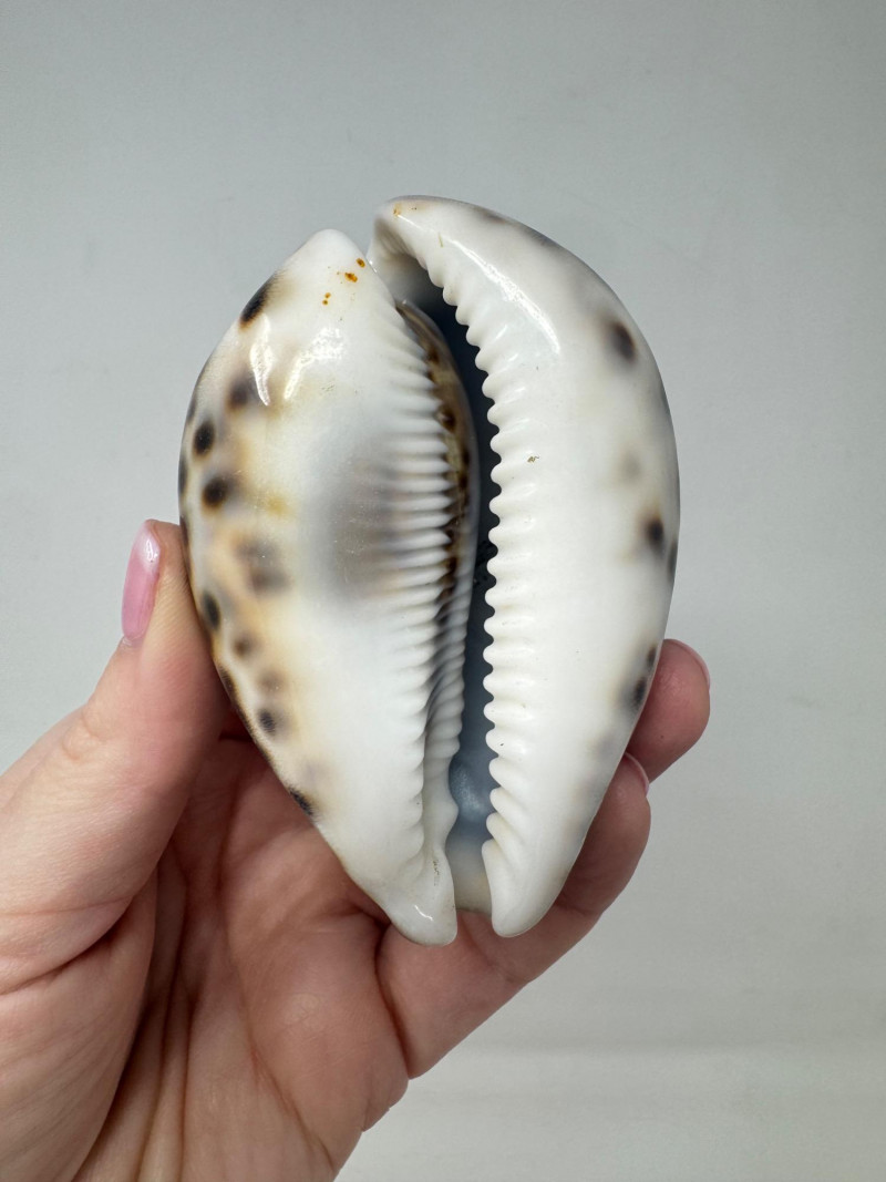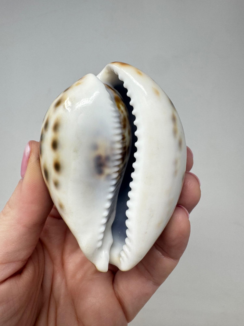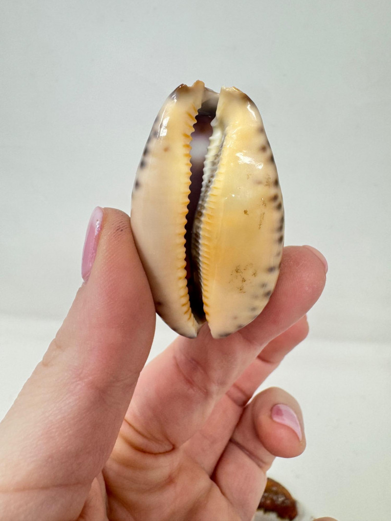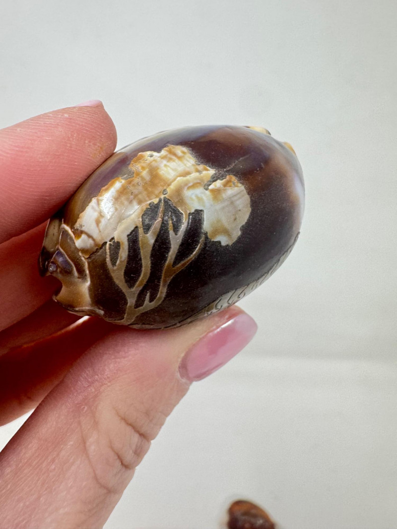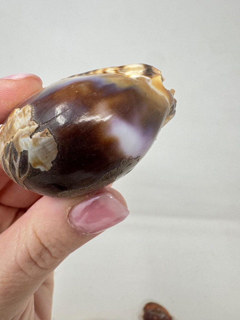 Assorted Sea Shells – Tiger Cowry (Tigris), Arabic Volutes & More. Includes a large speckled Tiger Cowry shell (Cypraea tigris), approx. 3–3.25” One carved cowry shell featuring a tiger scene, approx. 2” Variety of collectible named shells, potentially including: Spotted Cowry / Money Cowry Cymbiola nobilis (Noble Volute / Arabic Volute) Conus species (cone shells) King Crown Conch–type shells Babylonia / whelk–type patterned shells Additional assorted patterned and glossy seashell varieties Good mix of patterns, colors, and sizes.