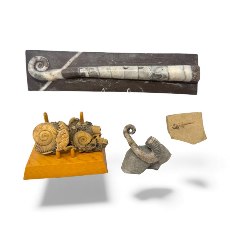 Mixed Fossil Lot – Ammonites, Orthoceras, Curled Ammonite & Small Fish Fossil.