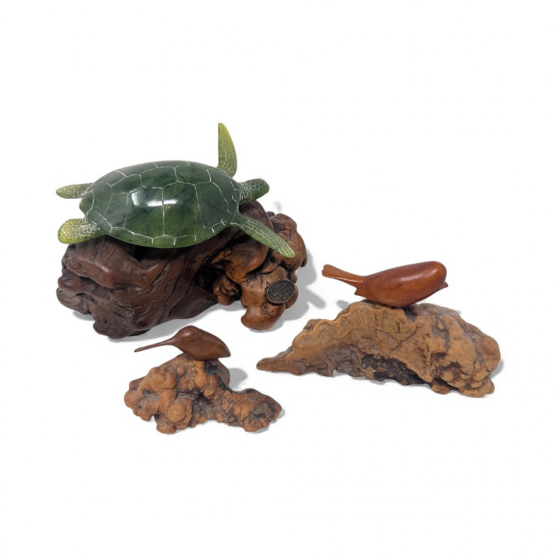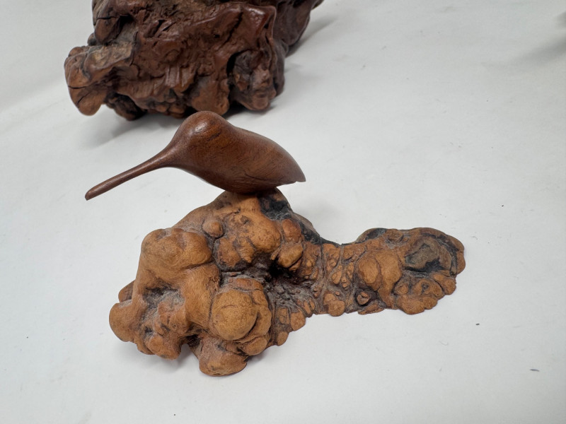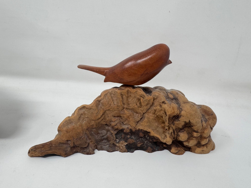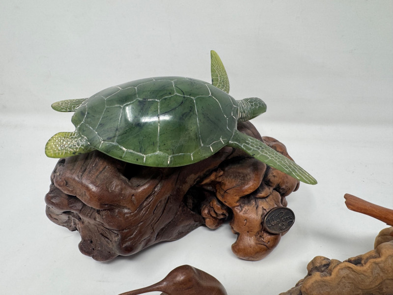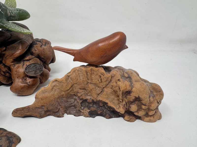 Lot # 7 - Carved Burlwood Sculptures – John Perry Turtle & 2 Signed Bird Figures