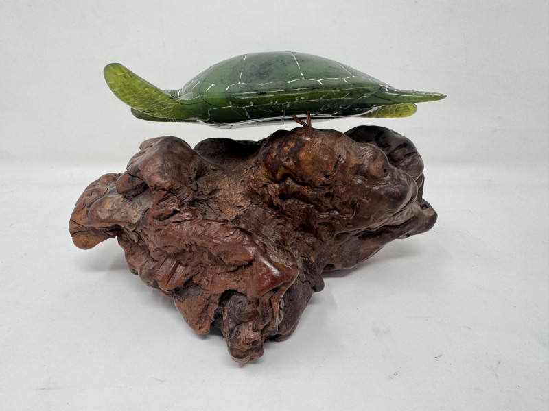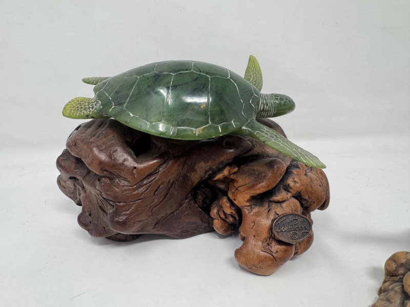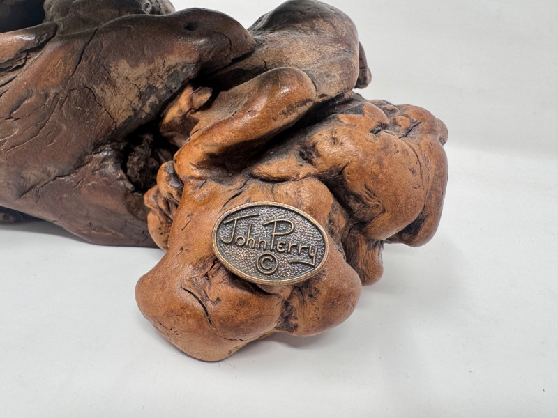 Carved Burlwood Sculptures – John Perry Turtle & 2 Signed Bird Figures. John Perry Sea Turtle Sculpture Resin turtle on natural burlwood base Signed with original John Perry medallion Approx. 7” wide x 4.5” tall Carved Bird #1 Signed underside: “Tigerswood on Manzanita Burl – B. Neely” Mounted on a beautiful manzanita burl base Approx. 6” long Carved Bird #2 Hand-carved walnut bird mounted on a manzanita burl base Signed on underside: “Walnut on Manzanita Burl – B. Neely” Approx. 3.5” long