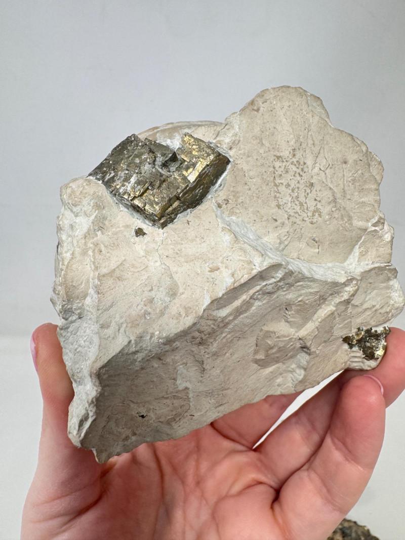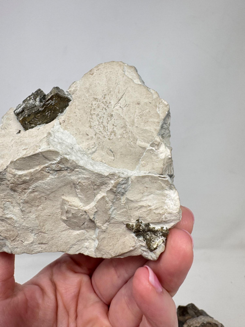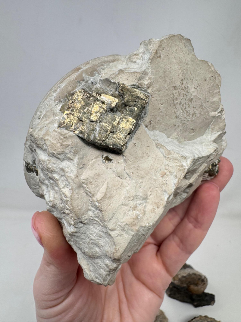 *** One specimen features large exposed pyrite cubes embedded throughout the matrix