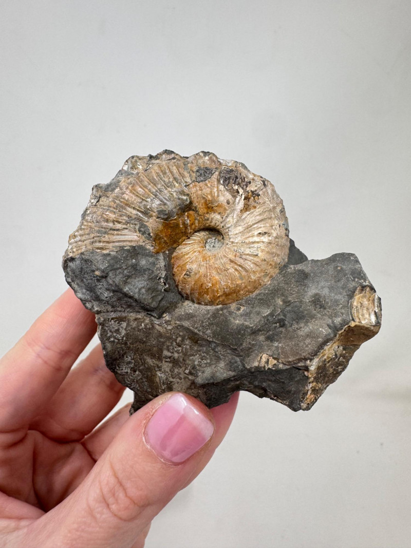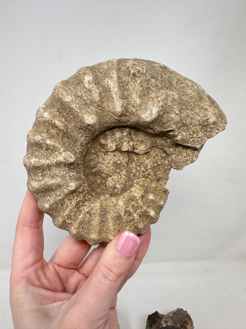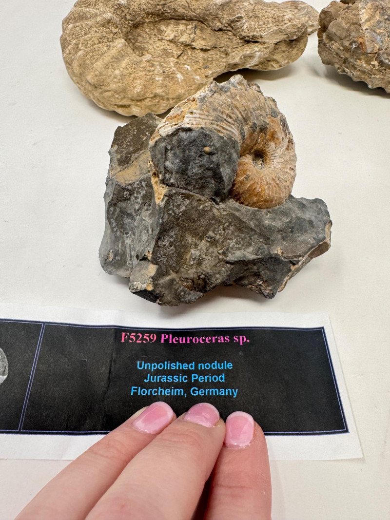 • Includes an unpolished Pleuroceras ammonite labeled from Flörsheim, Germany – Jurassic Period