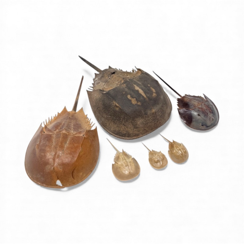 Assorted Preserved Horseshoe Crabs – Extremely Delicate. • Lot includes seven preserved horseshoe crab specimens, ranging from very large to juvenile sizes