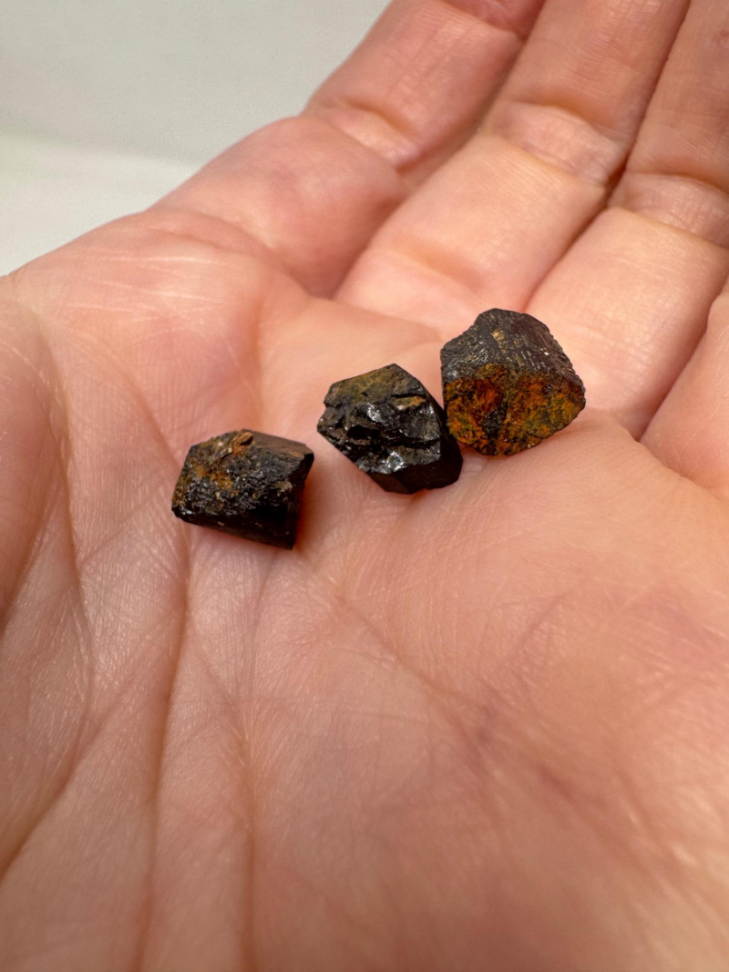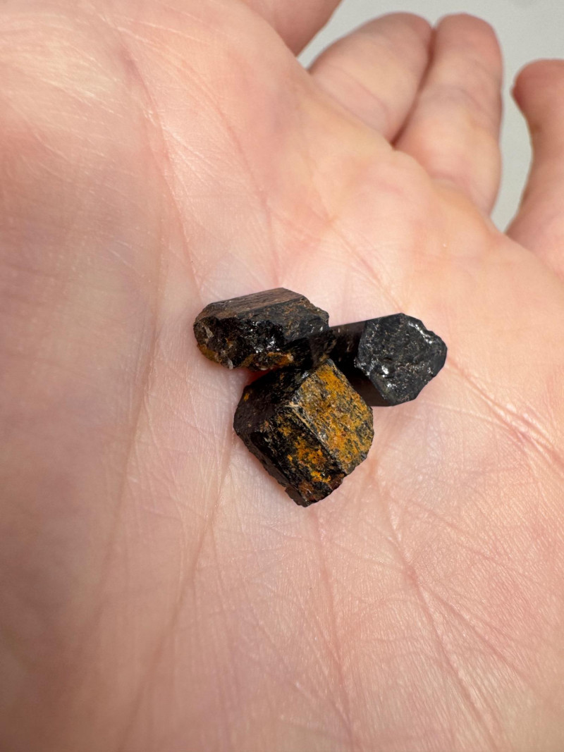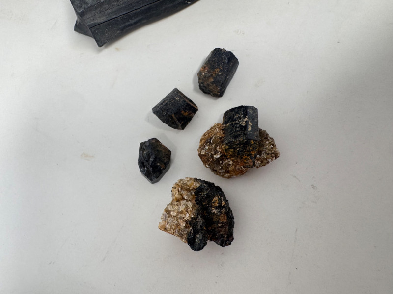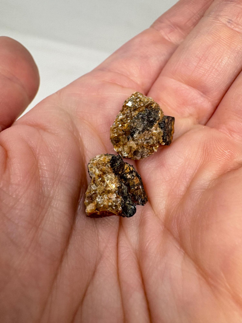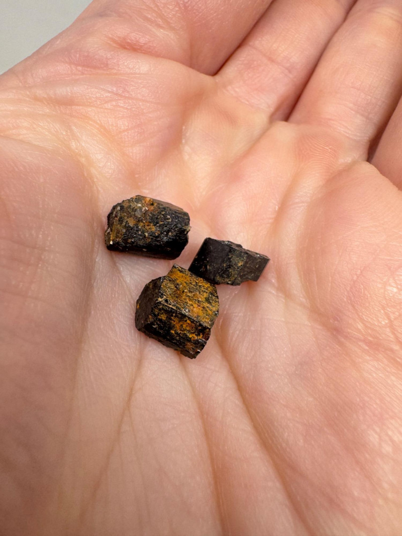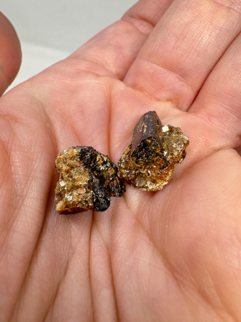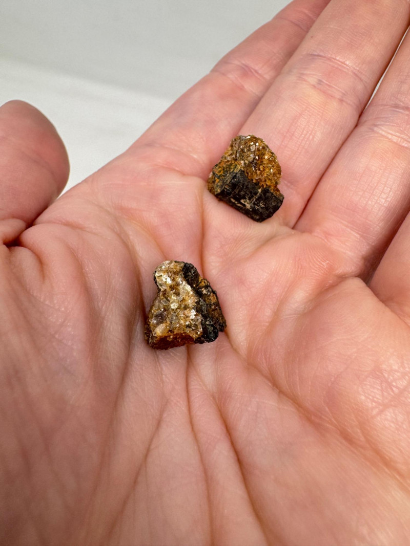 • Several small black/gold pyrite chunks with metallic flecks