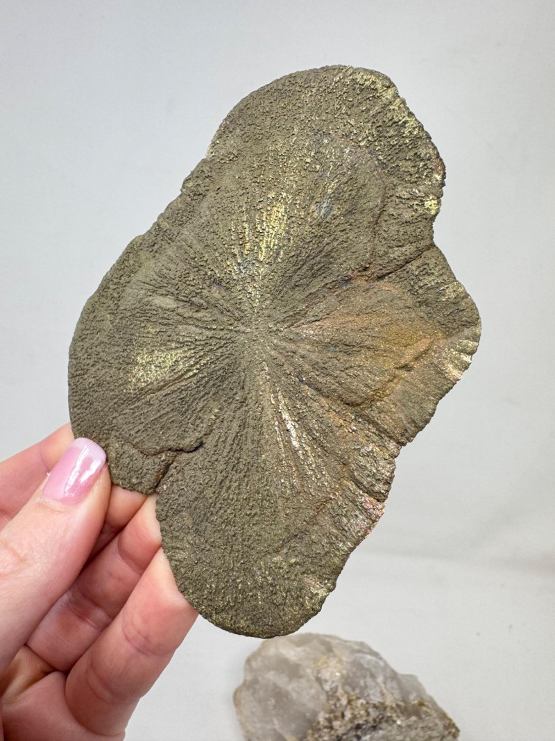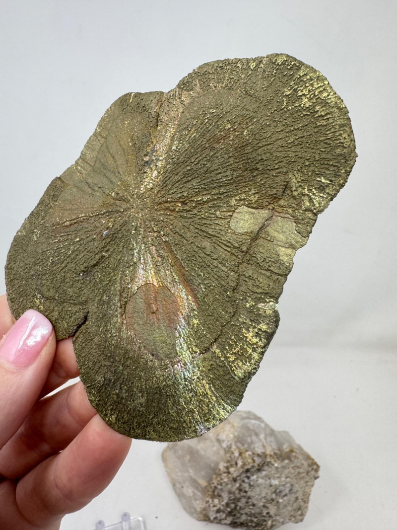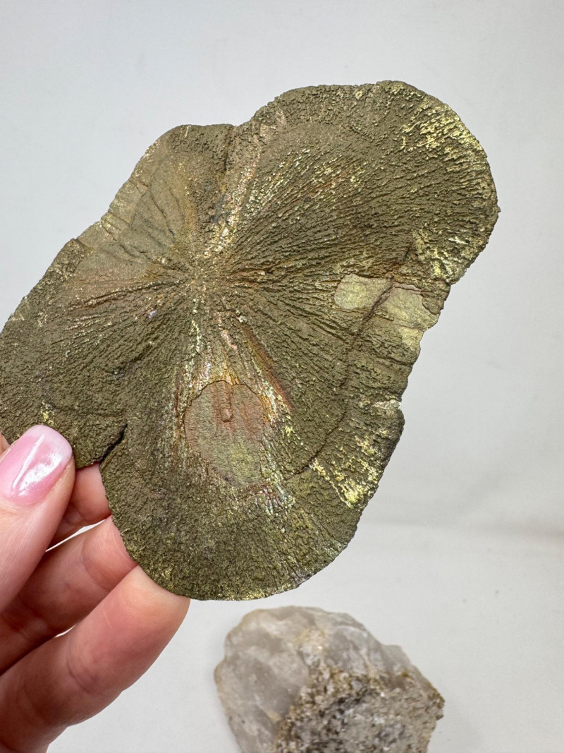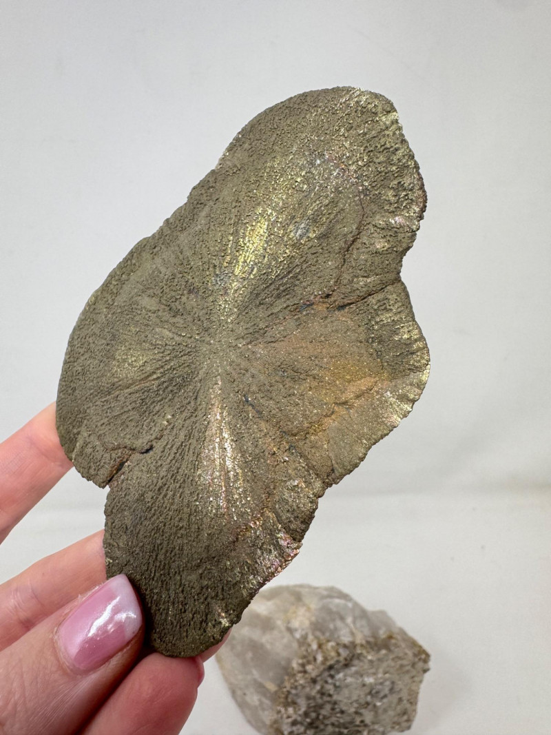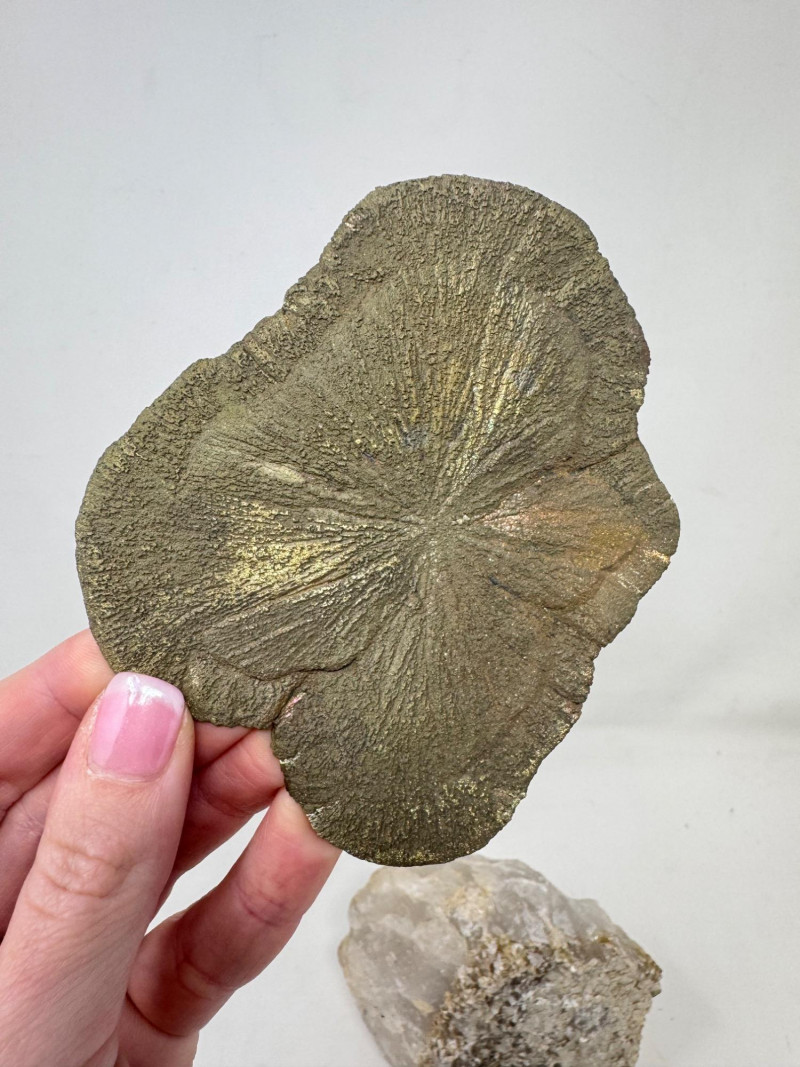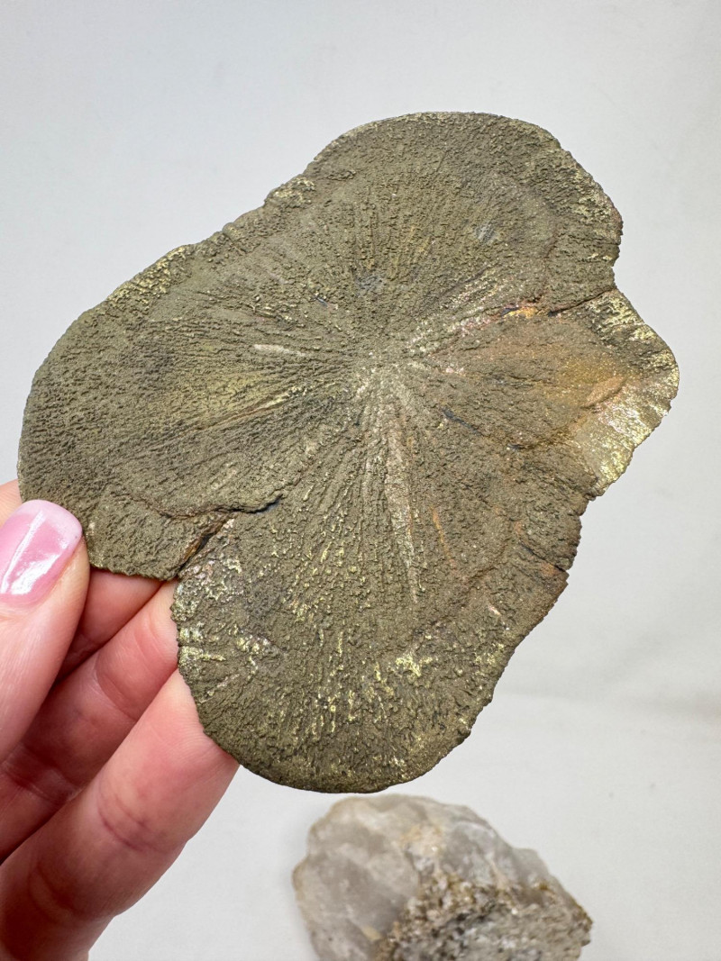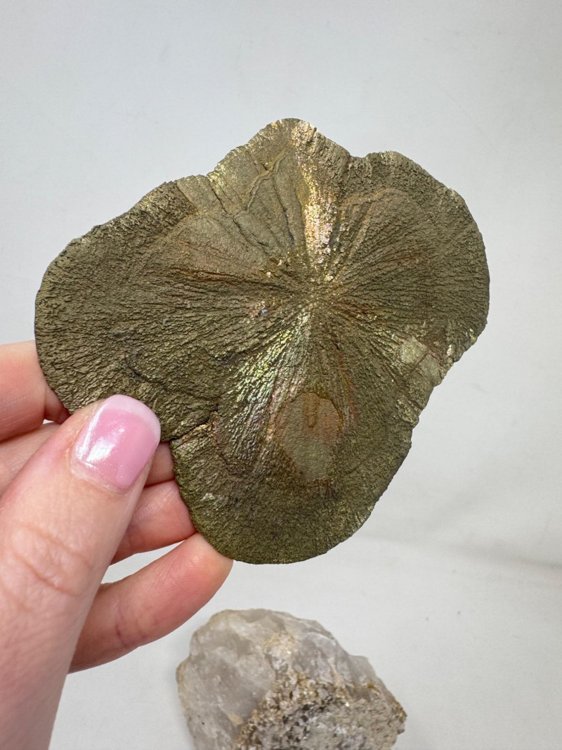 • Flat “sunburst” pyrite (pyrite sun) – approx. 4.5” long with gold/rainbow iridescence