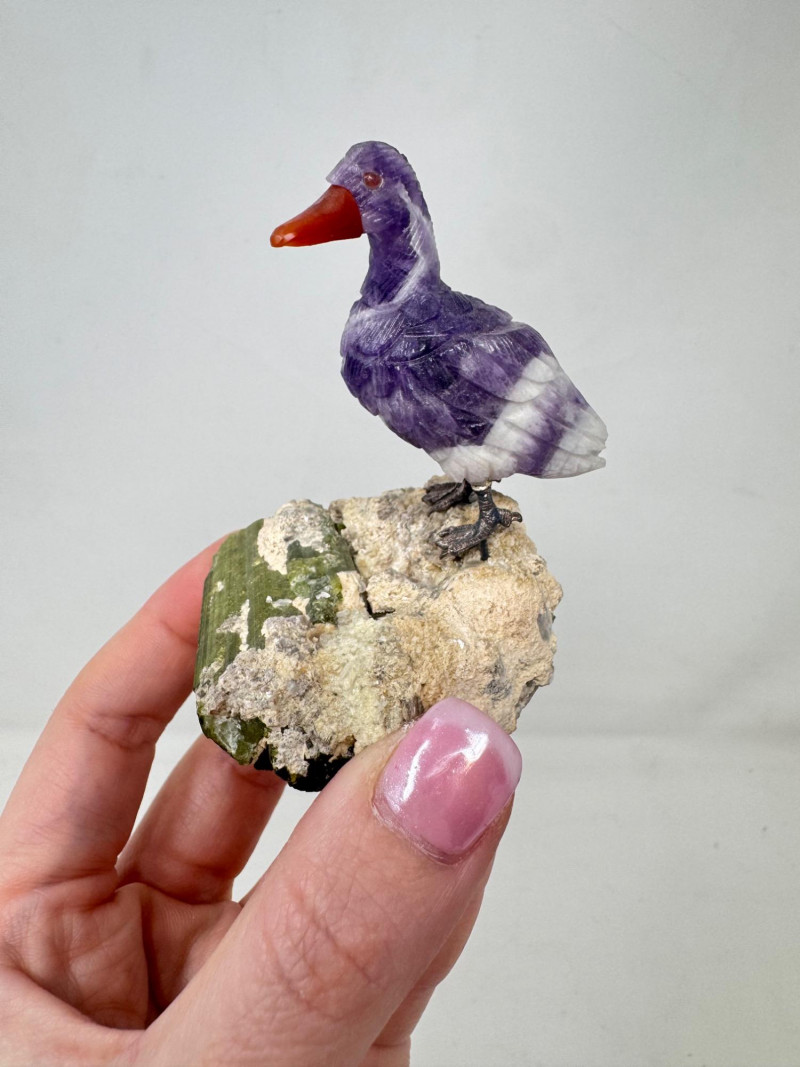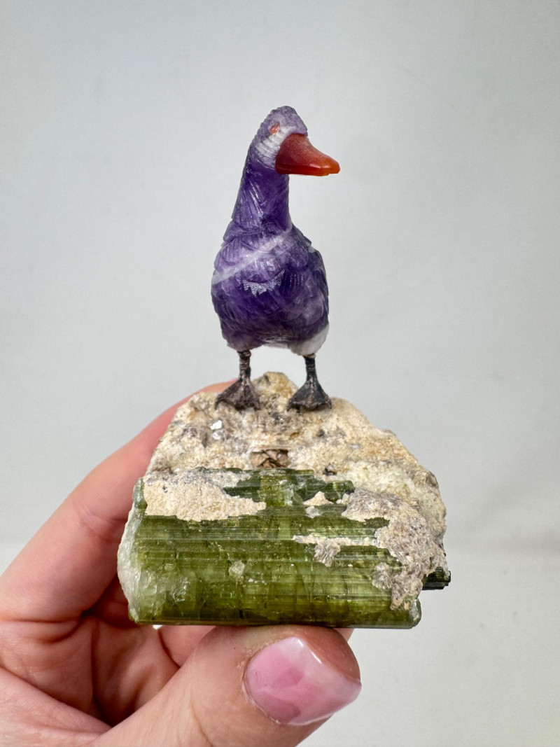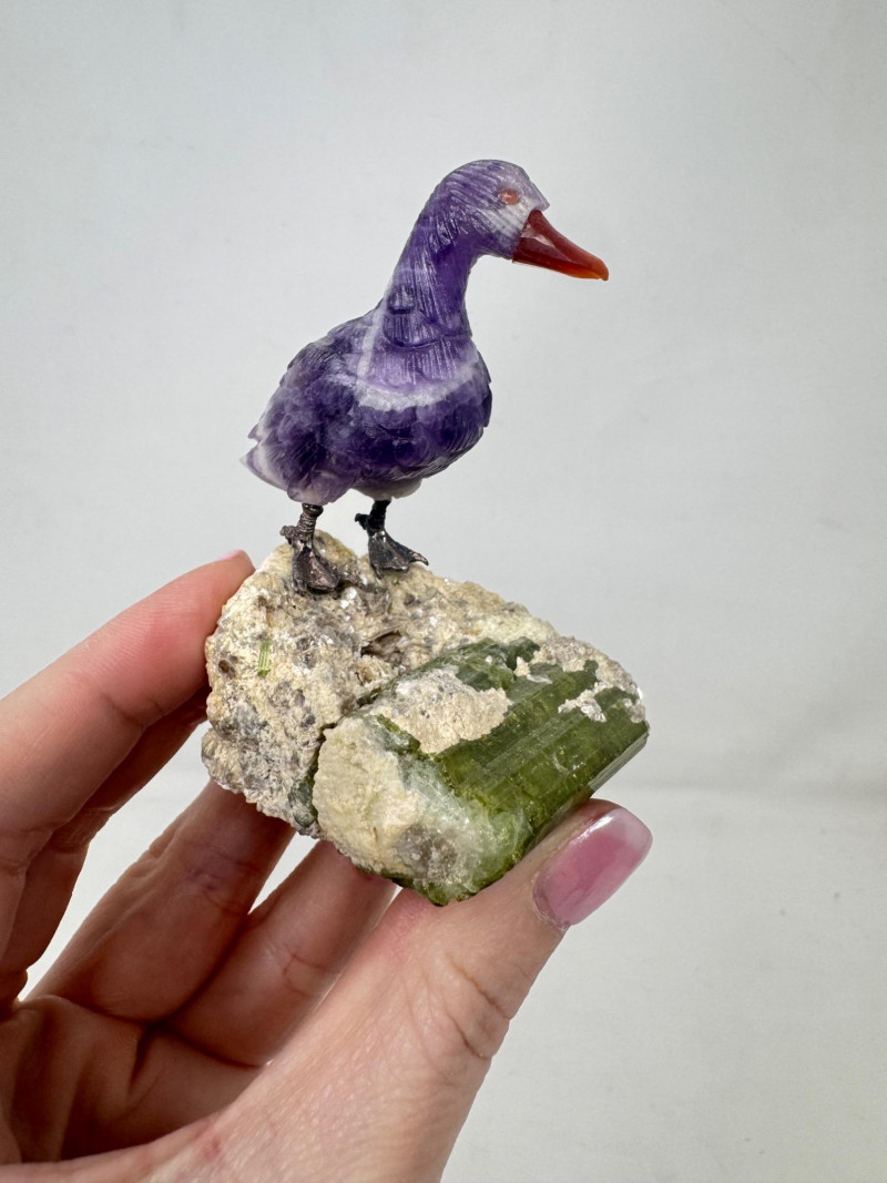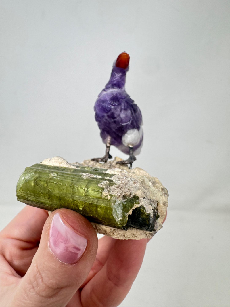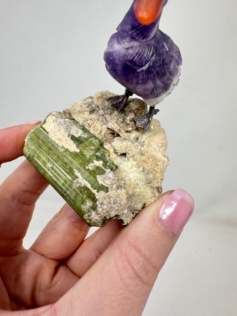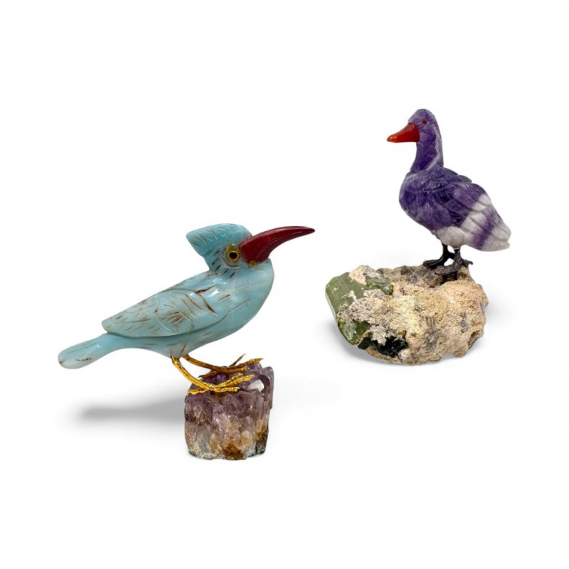 Carved Stone Birds on Amethyst and Green Tourmaline Stands.