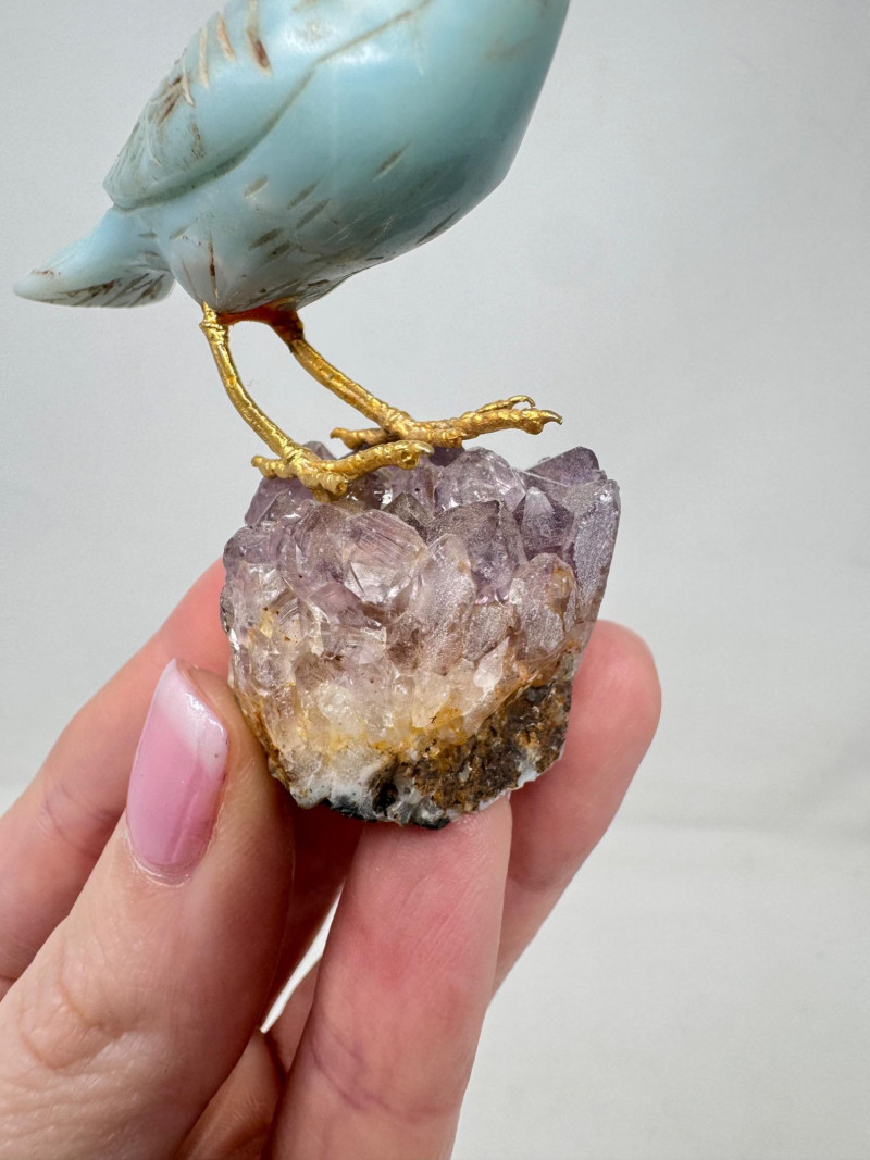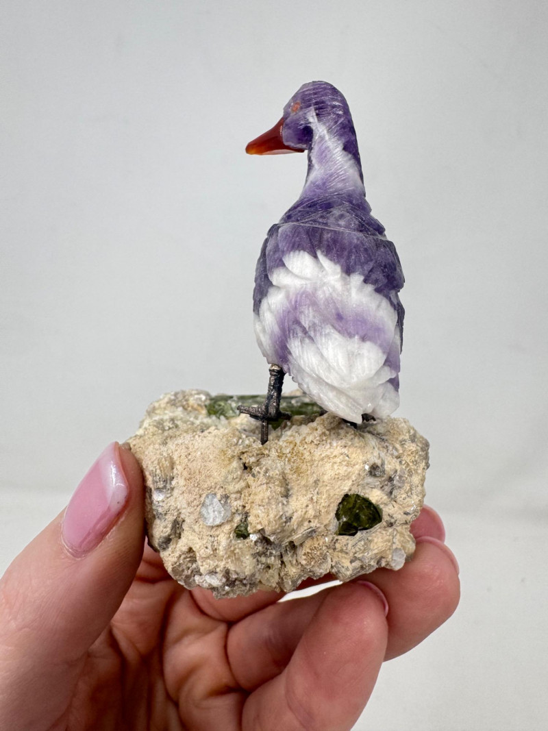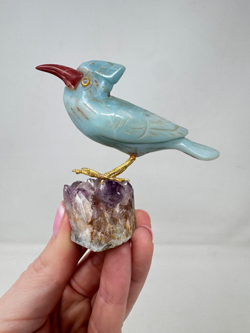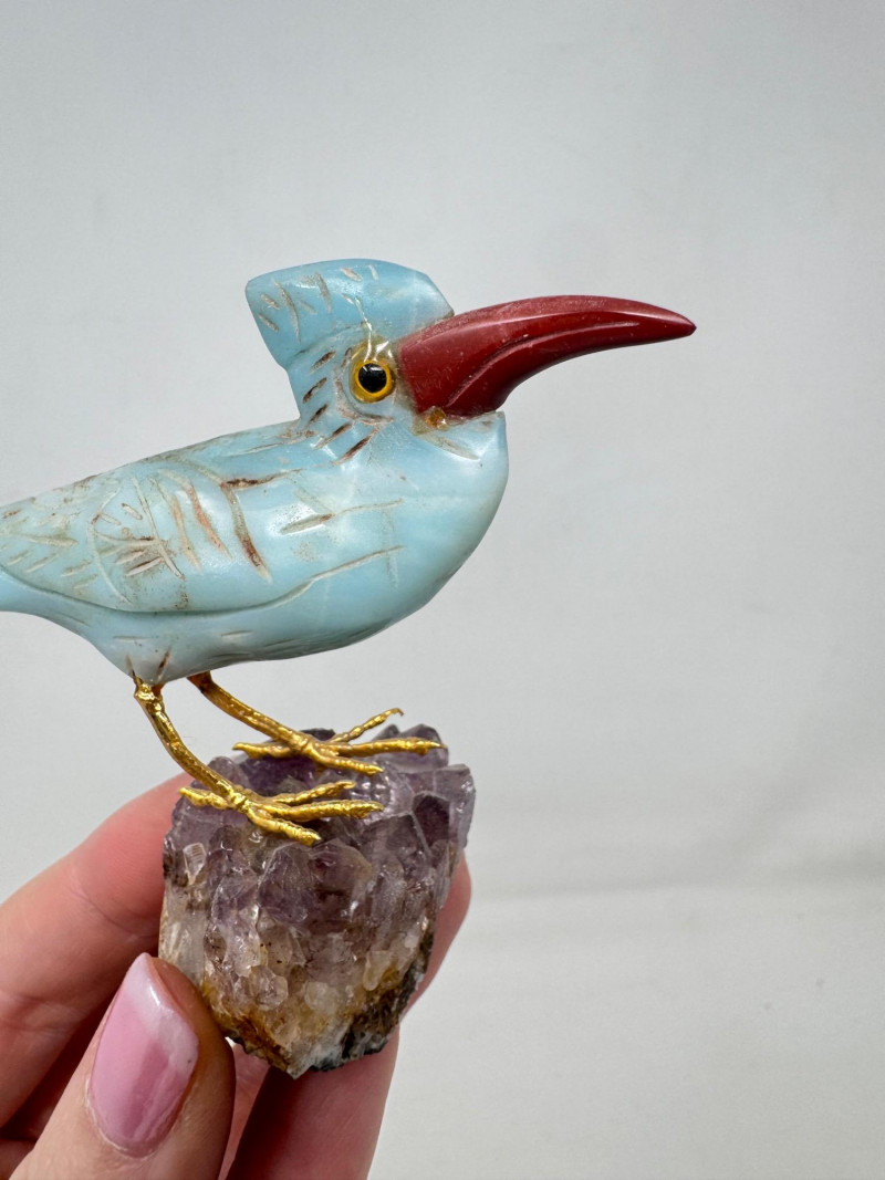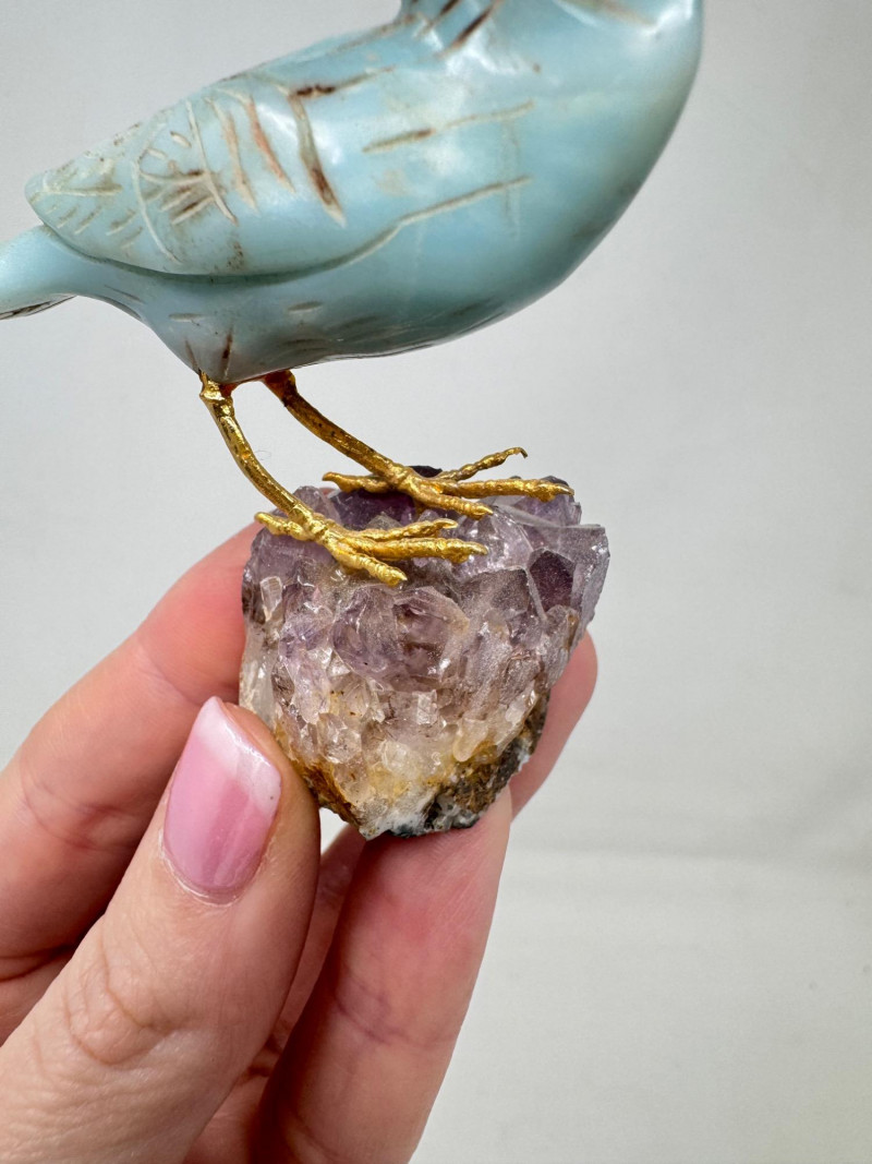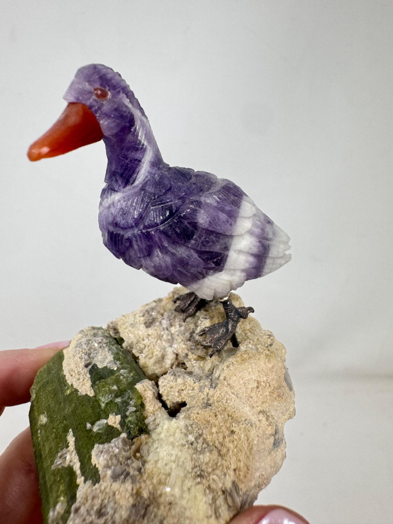 Carved Stone Birds on Amethyst and Green Tourmaline Stands.