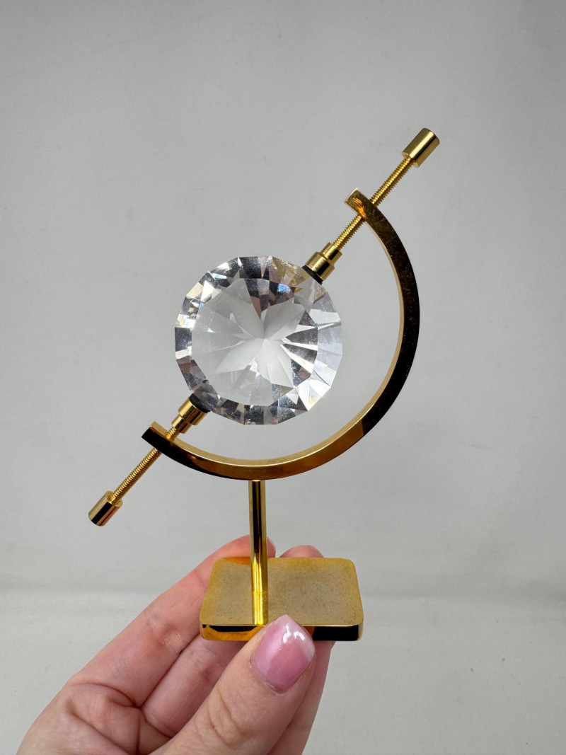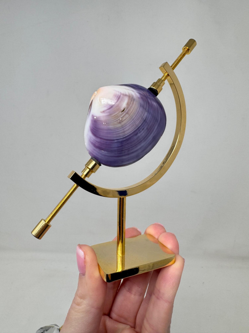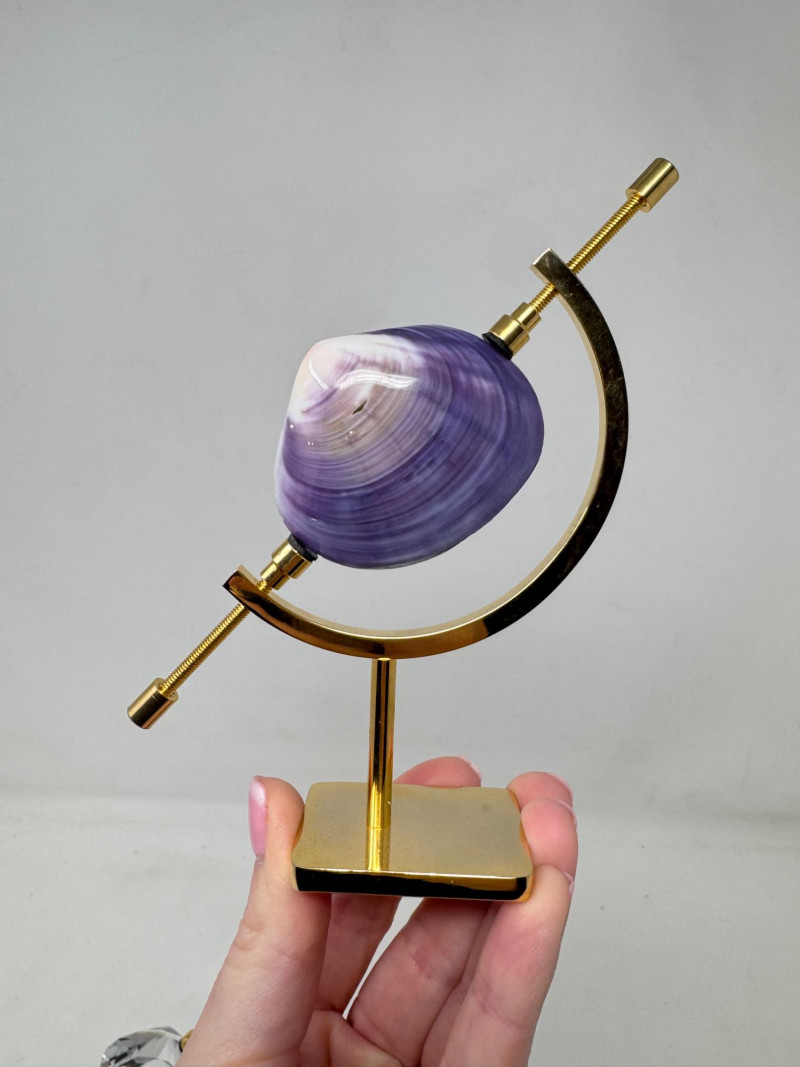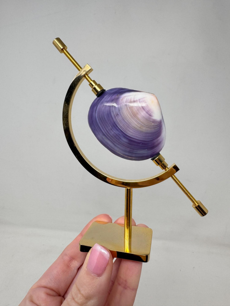 Pair of Gold Caliper Display Stands w/ Shell & Crystal Specimens. Pair of gold-tone caliper display stands, each 5" tall Includes two removable specimens: Polished purple clam shell Faceted clear crystal accent Tension screws secure and hold objects in place. Stands can display any small specimen/object that fits within the arms.