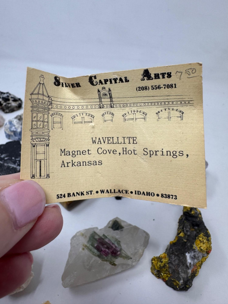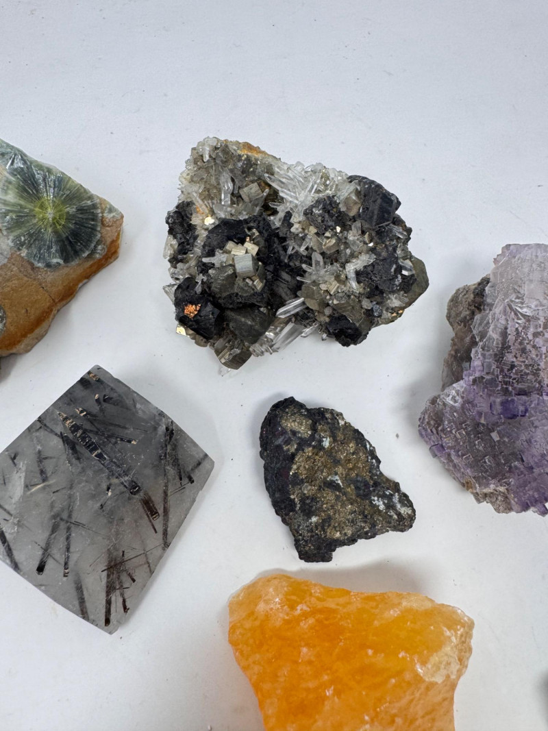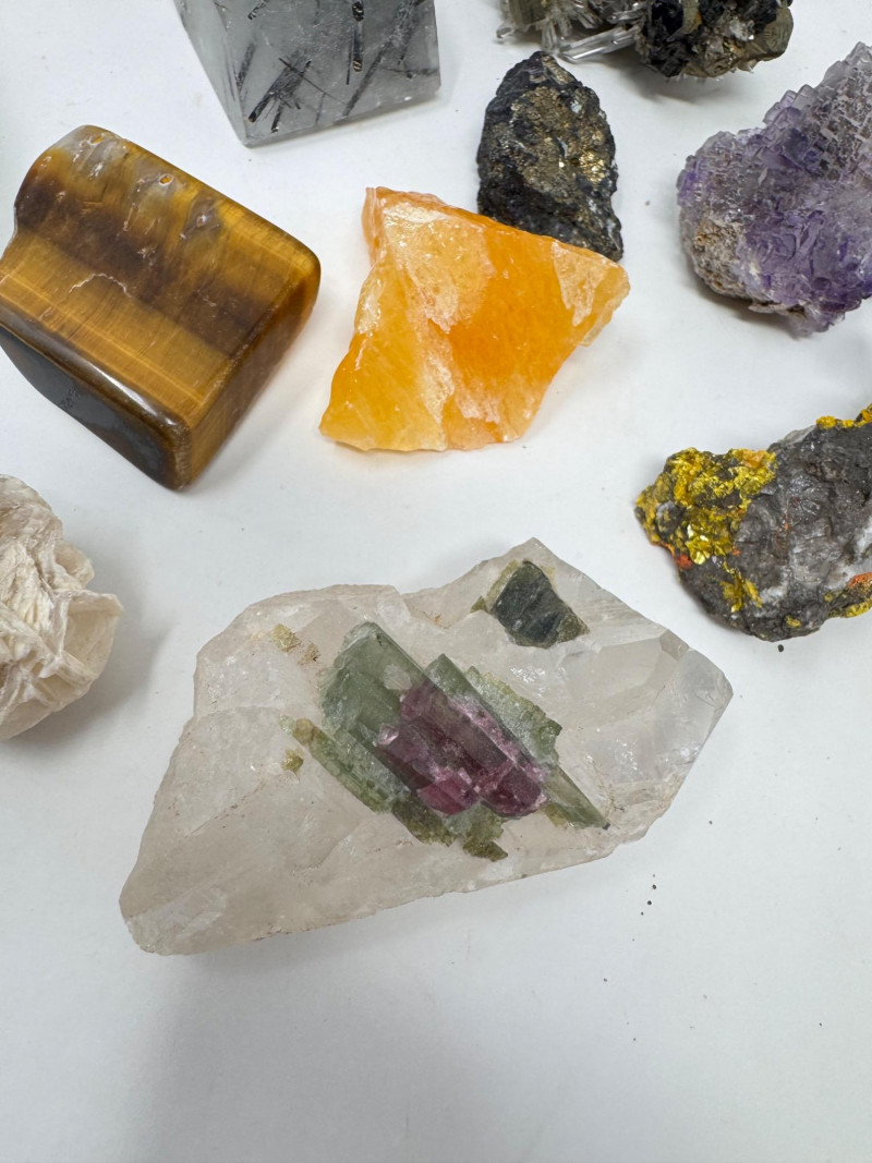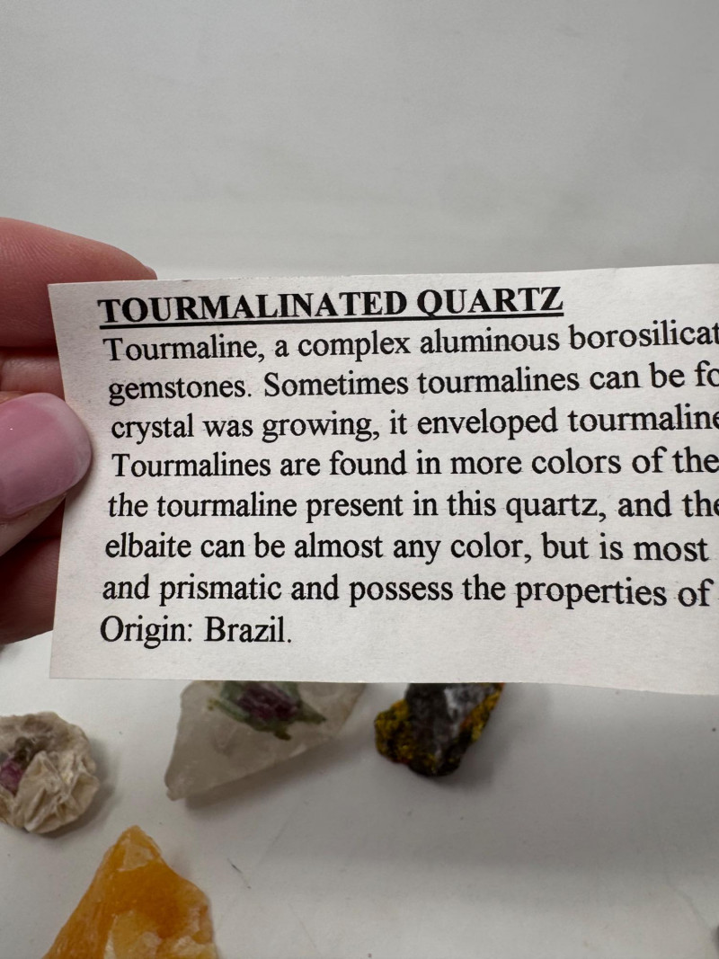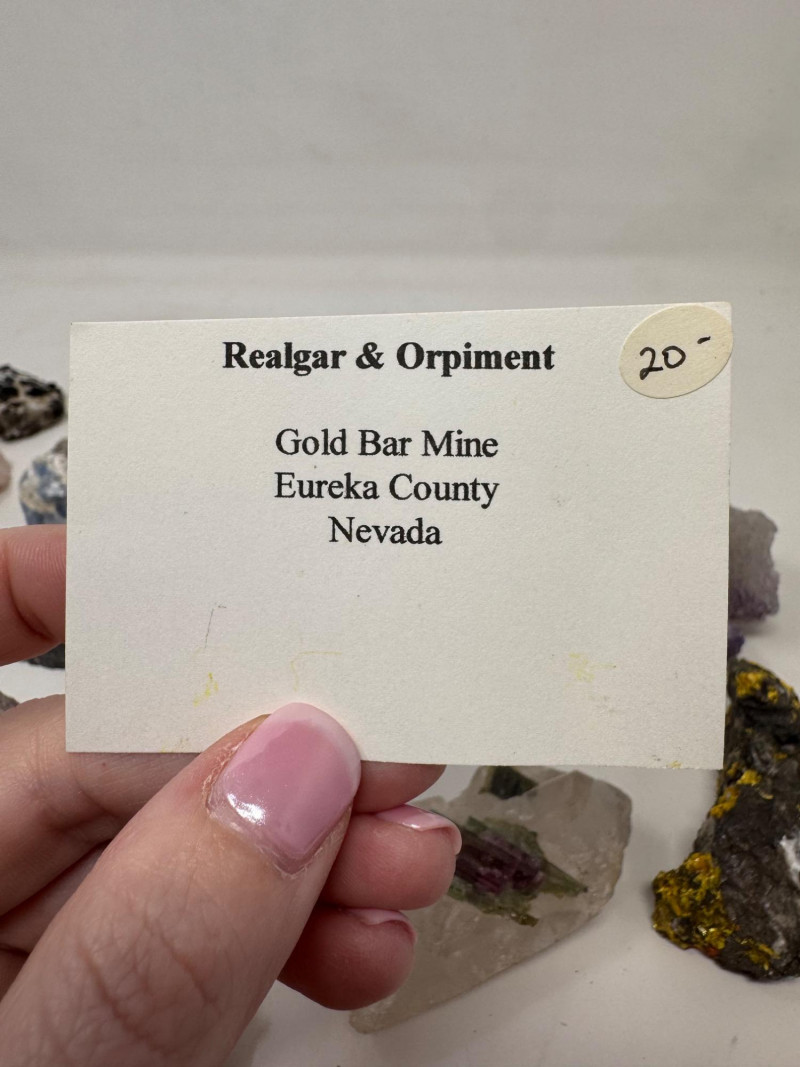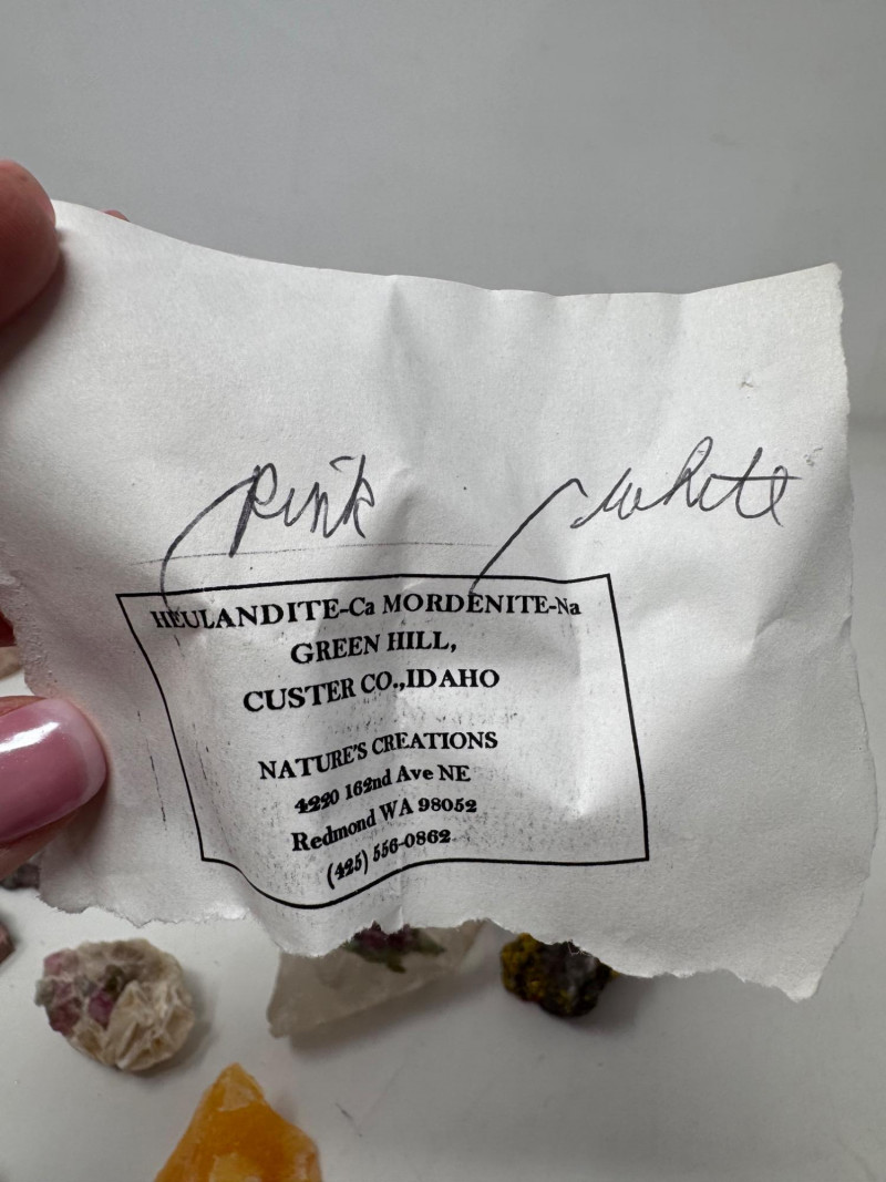 Mixed Mineral & Crystal Collection in Display Case – 1–3" Specimens. Collection of 20+ natural mineral and crystal specimens Includes varieties such as: Heulandite–Ca & Mordenite–Na (Green Hill, Custer Co., Idaho) Tourmalinated Quartz (Brazil) Realgar & Orpiment (Gold Bar Mine, Eureka County, Nevada) Wavellite (Magnet Cove, Hot Springs, Arkansas) Additional pieces including amethyst clusters, fluorite, tourmaline in matrix, calcite, feldspar, tiger’s eye, garnet, and more Each specimen is 1–3 inches in size. Comes with a glass-front display case, approx. 12" x 8" Includes multiple mine labels and ID cards.