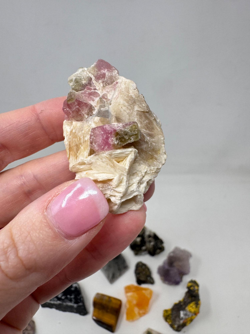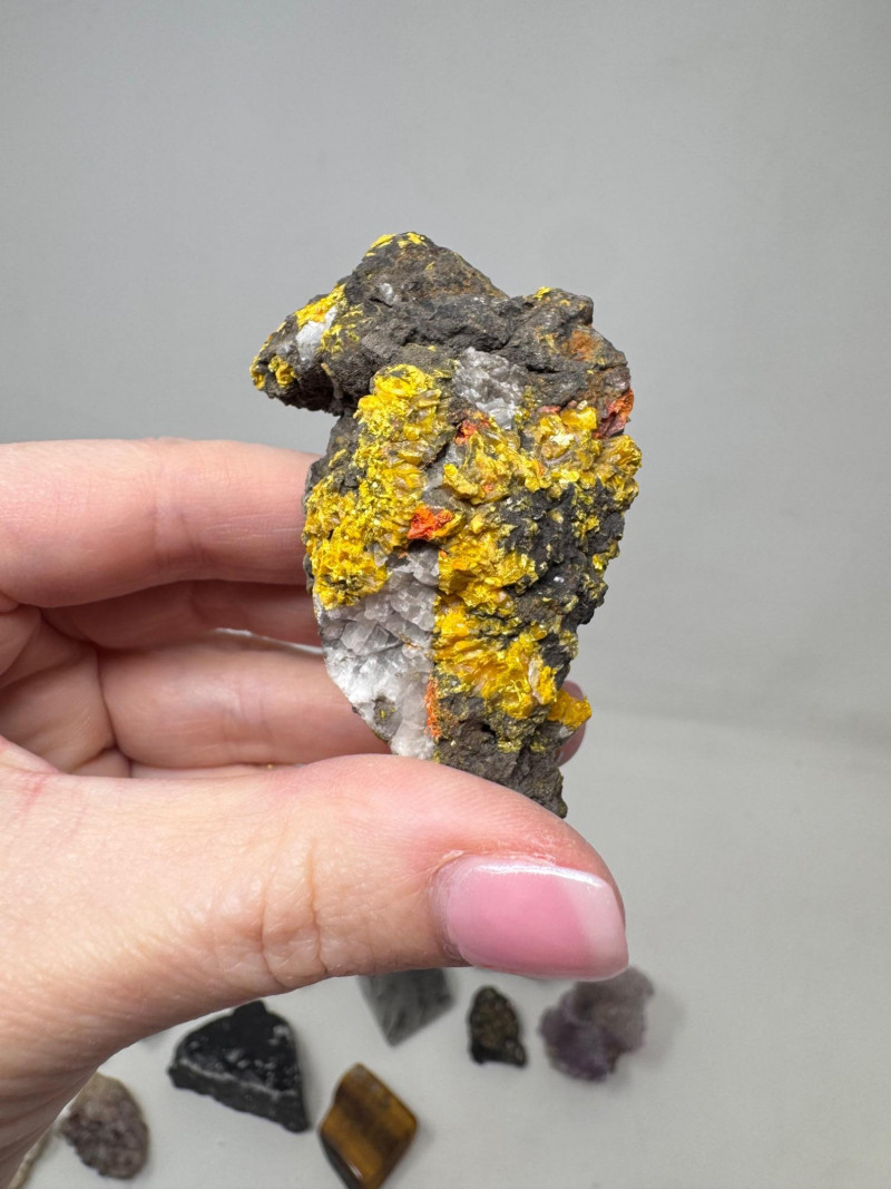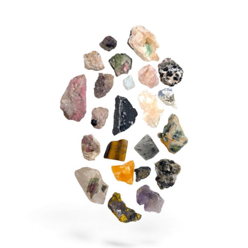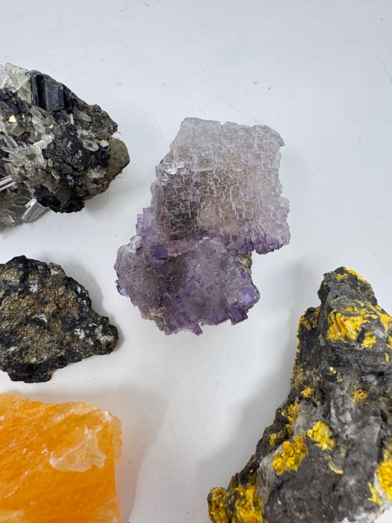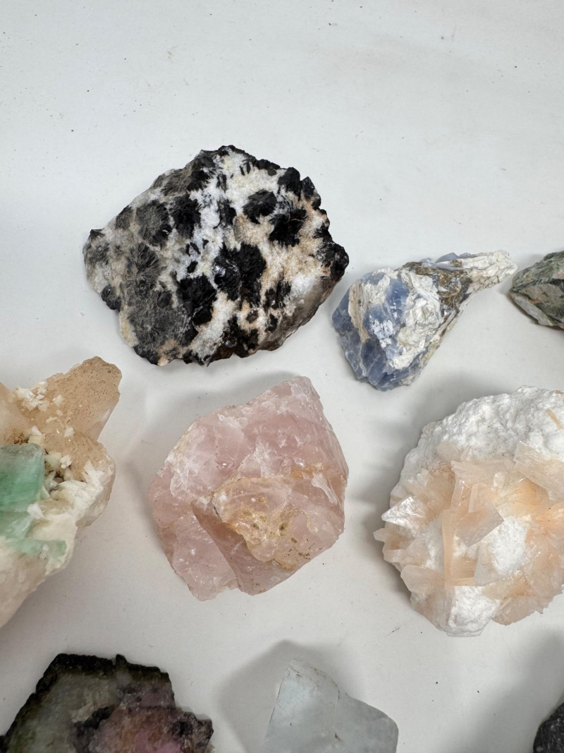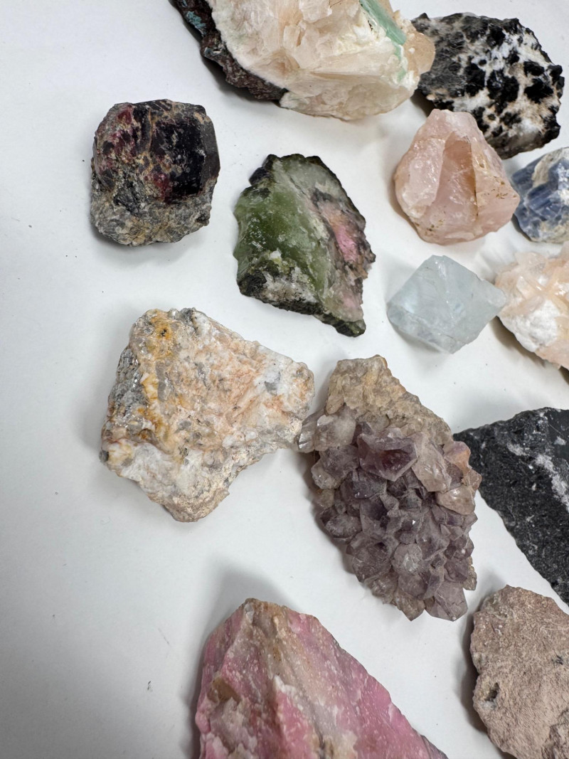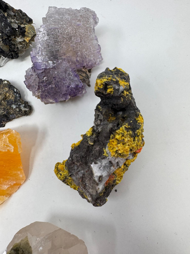 Mixed Mineral & Crystal Collection in Display Case – 1–3" Specimens. Collection of 20+ natural mineral and crystal specimens Includes varieties such as: Heulandite–Ca & Mordenite–Na (Green Hill, Custer Co., Idaho) Tourmalinated Quartz (Brazil) Realgar & Orpiment (Gold Bar Mine, Eureka County, Nevada) Wavellite (Magnet Cove, Hot Springs, Arkansas) Additional pieces including amethyst clusters, fluorite, tourmaline in matrix, calcite, feldspar, tiger’s eye, garnet, and more Each specimen is 1–3 inches in size. Comes with a glass-front display case, approx. 12" x 8" Includes multiple mine labels and ID cards.
