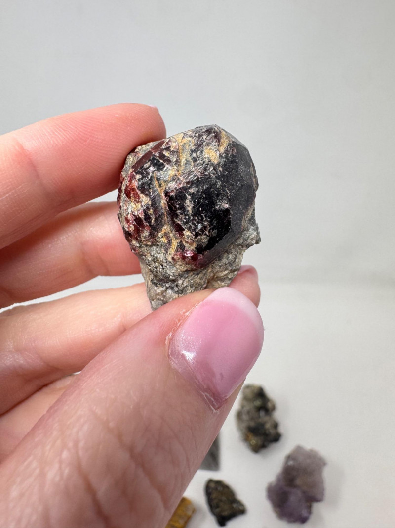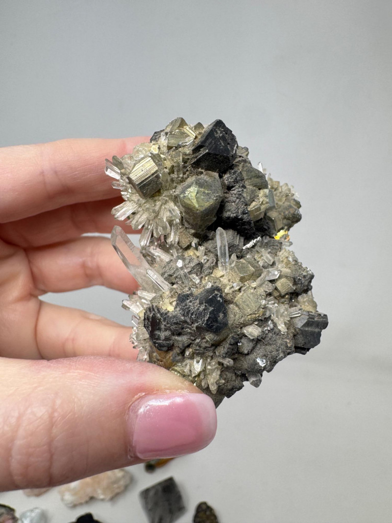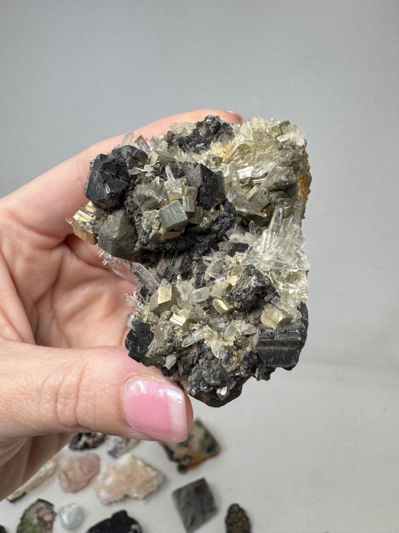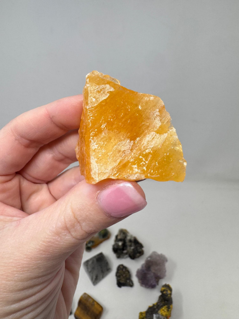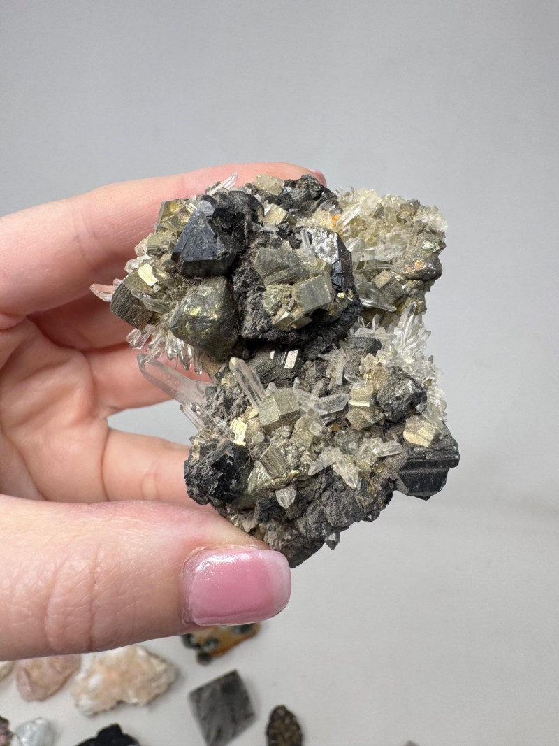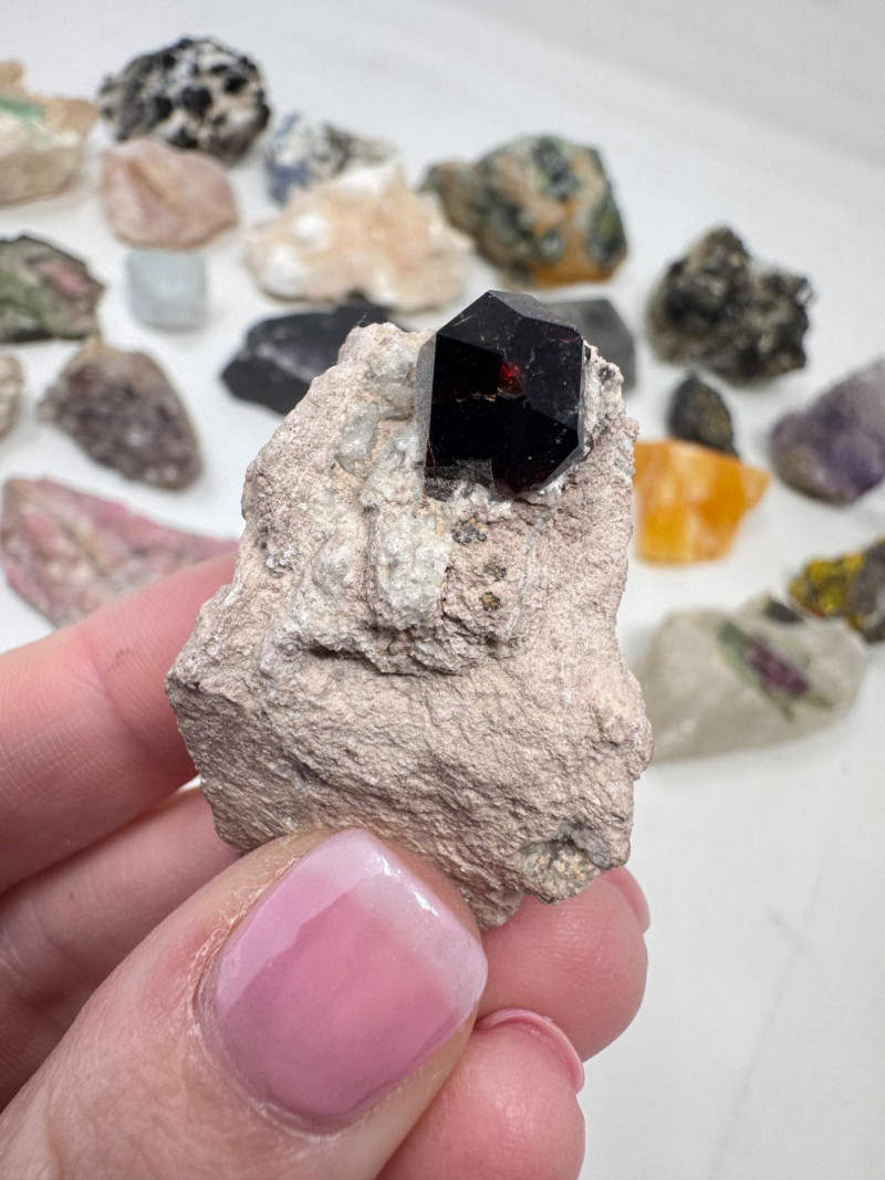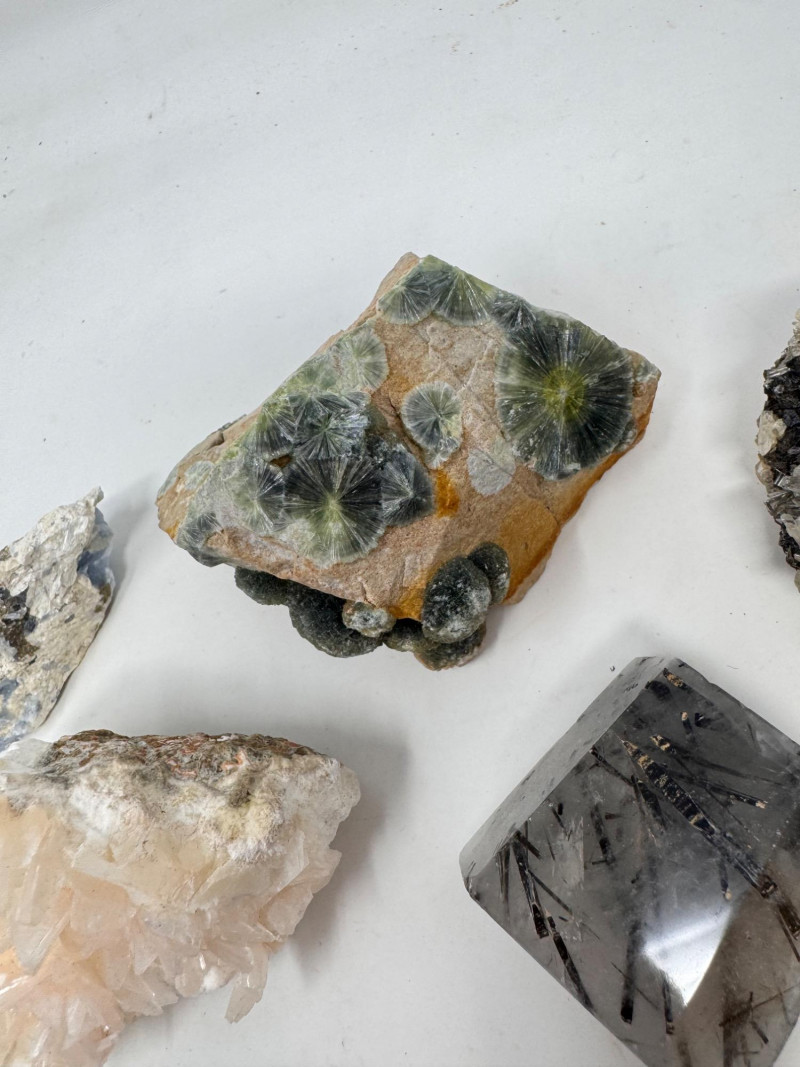 Mixed Mineral & Crystal Collection in Display Case – 1–3" Specimens. Collection of 20+ natural mineral and crystal specimens Includes varieties such as: Heulandite–Ca & Mordenite–Na (Green Hill, Custer Co., Idaho) Tourmalinated Quartz (Brazil) Realgar & Orpiment (Gold Bar Mine, Eureka County, Nevada) Wavellite (Magnet Cove, Hot Springs, Arkansas) Additional pieces including amethyst clusters, fluorite, tourmaline in matrix, calcite, feldspar, tiger’s eye, garnet, and more Each specimen is 1–3 inches in size. Comes with a glass-front display case, approx. 12" x 8" Includes multiple mine labels and ID cards.