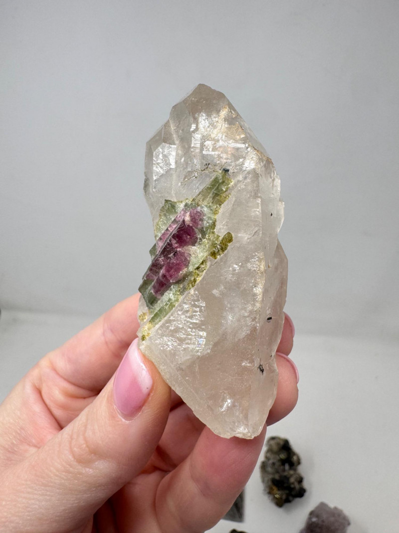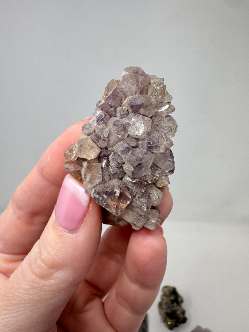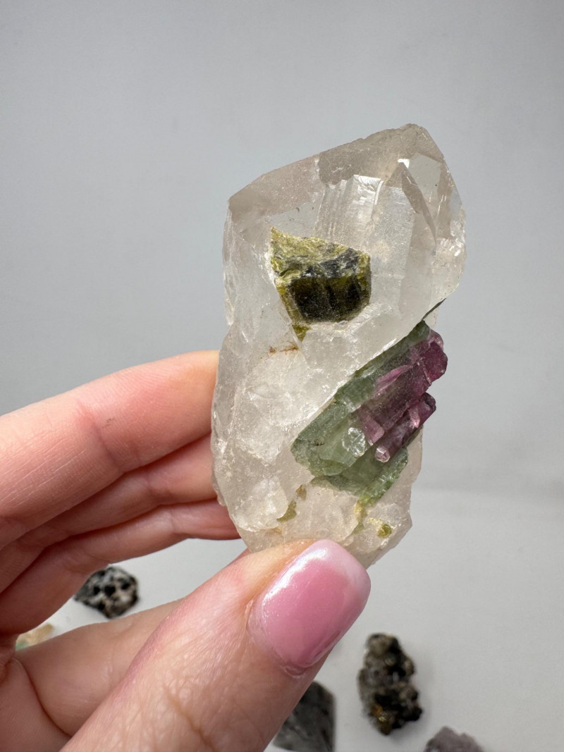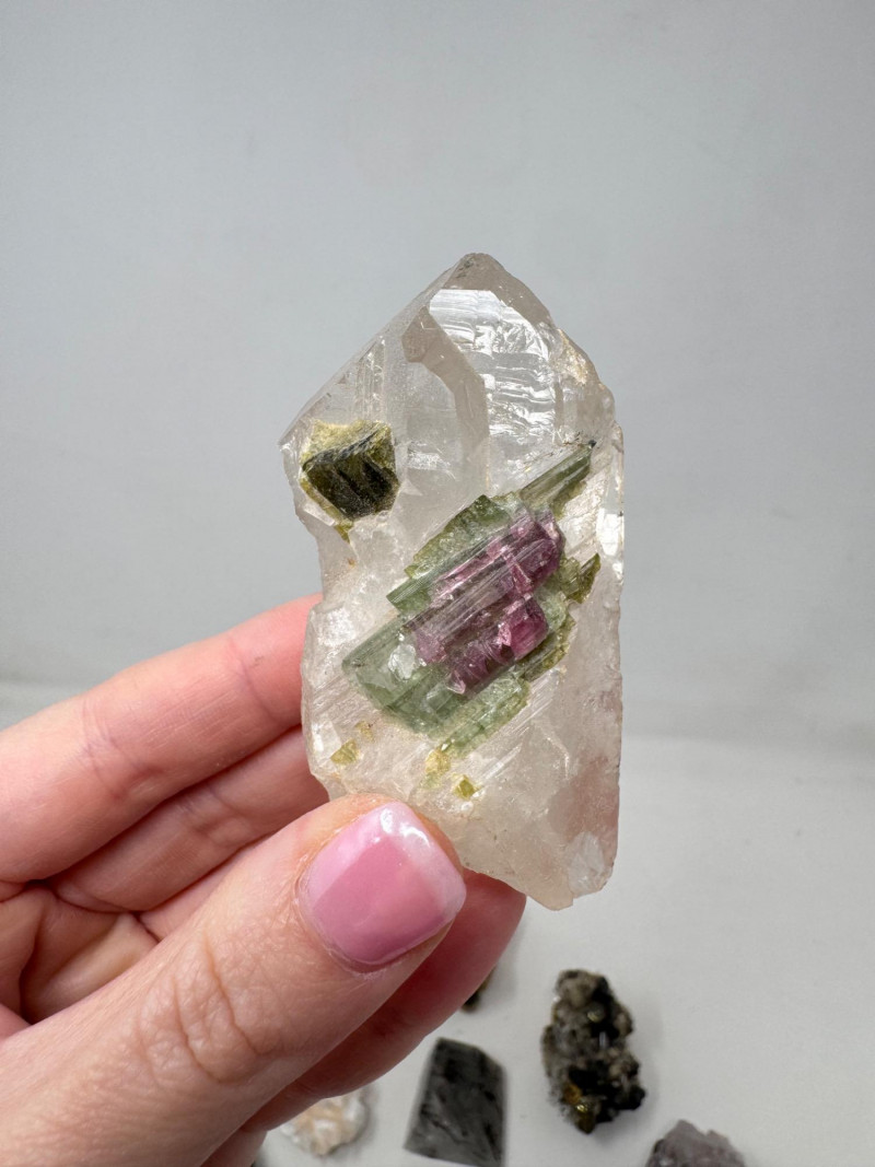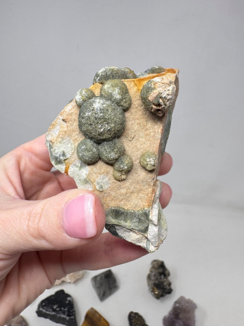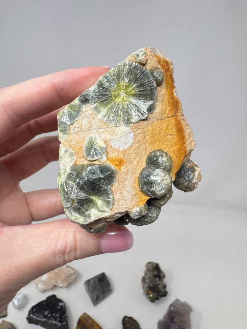 Mixed Mineral & Crystal Collection in Display Case – 1–3" Specimens. Collection of 20+ natural mineral and crystal specimens Includes varieties such as: Heulandite–Ca & Mordenite–Na (Green Hill, Custer Co., Idaho) Tourmalinated Quartz (Brazil) Realgar & Orpiment (Gold Bar Mine, Eureka County, Nevada) Wavellite (Magnet Cove, Hot Springs, Arkansas) Additional pieces including amethyst clusters, fluorite, tourmaline in matrix, calcite, feldspar, tiger’s eye, garnet, and more Each specimen is 1–3 inches in size. Comes with a glass-front display case, approx. 12" x 8" Includes multiple mine labels and ID cards.