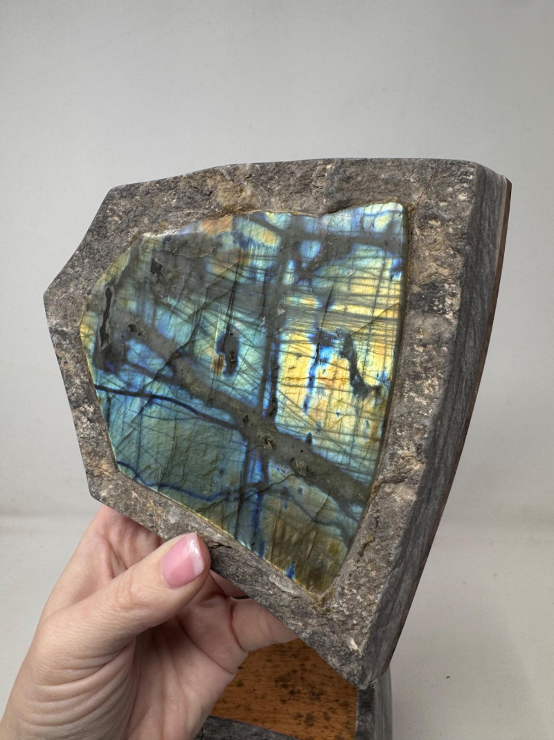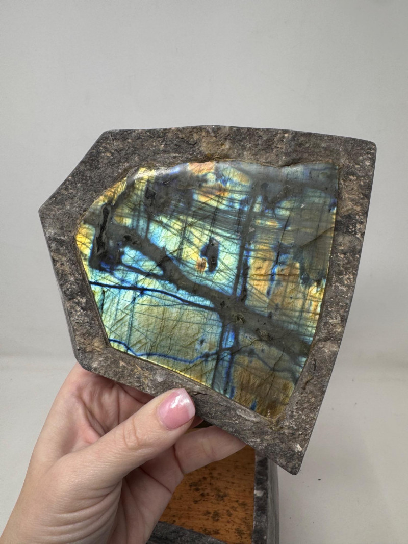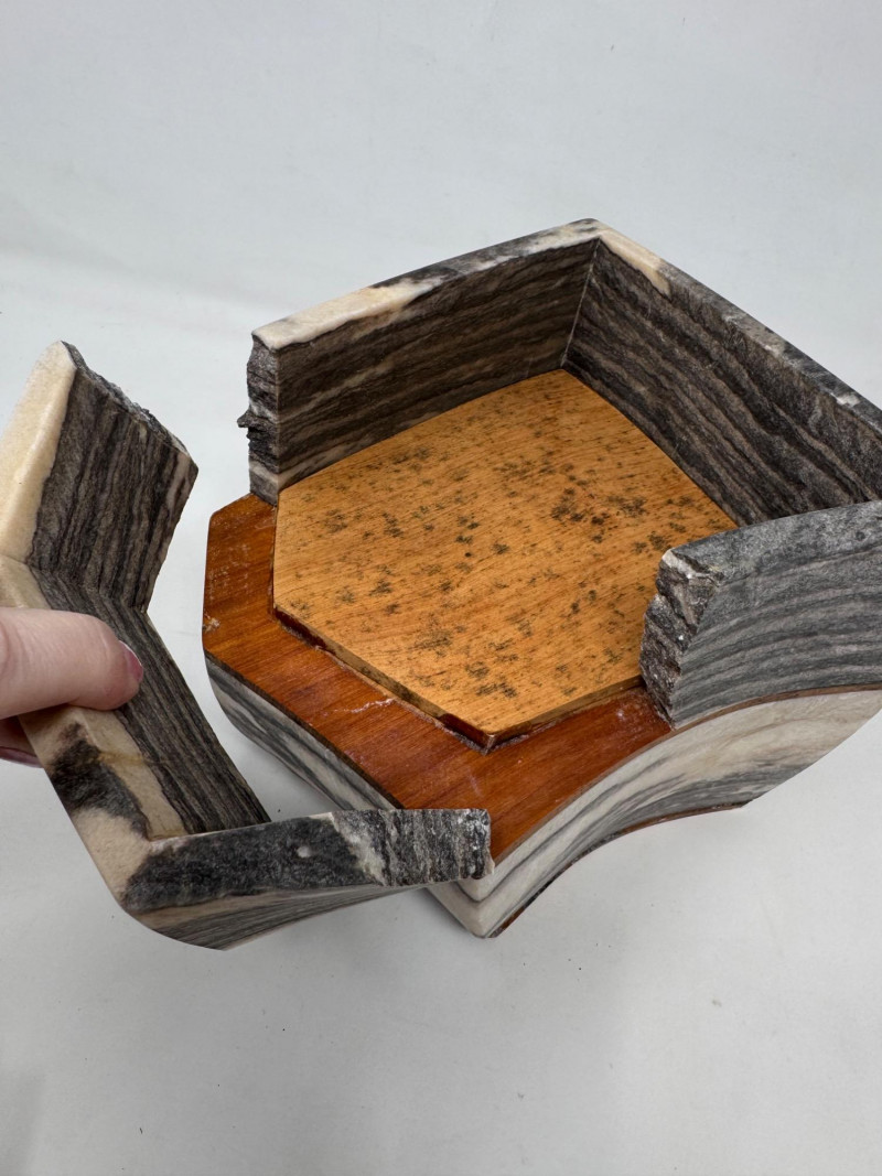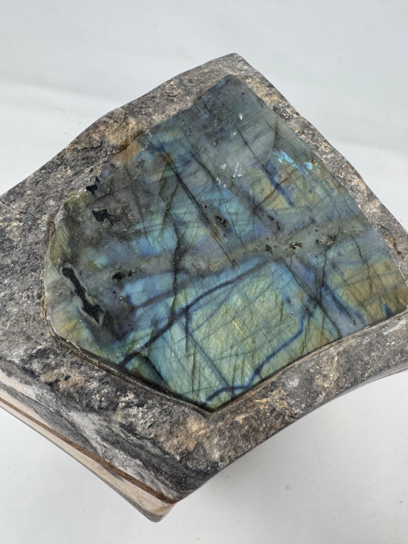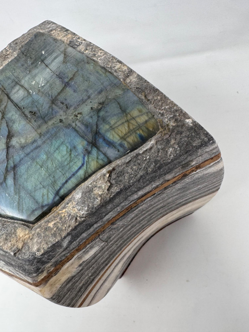 Handcrafted Labradorite & Alabaster Hidden Trinket Box – Large. This is a one-of-a-kind handcrafted trinket box made from Madagascar labradorite and California alabaster, signed and dated ’98 on the underside of the lid.