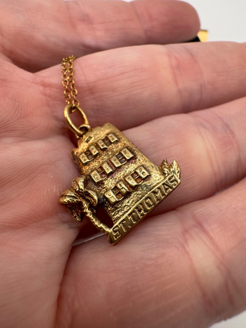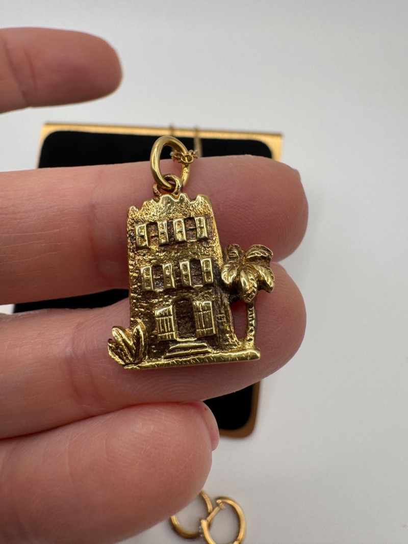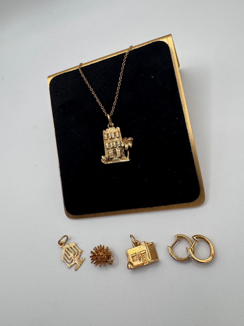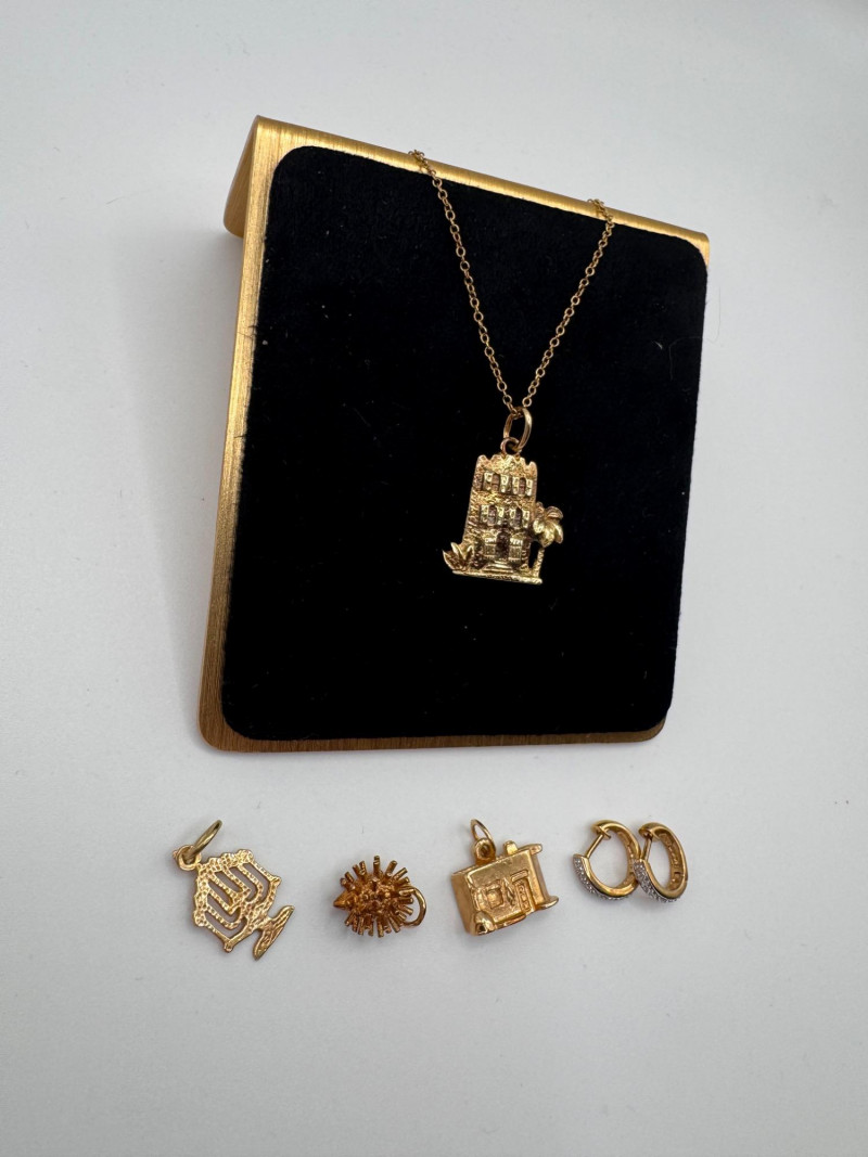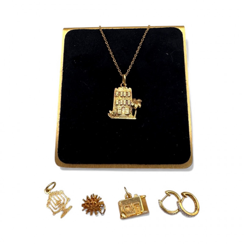 Mixed Gold Jewelry Lot – 9k/10k/14k Charms & Earrings, 11.28g. Includes: 9k Gold Hoop Earrings – accented with small diamonds 10k Gold Porcupine Pendant – tested 14k Gold Menorah Charm – tested 14k Gold Building Pendant – tested 14k Gold St. Thomas Pendant – tested Gold-tone .925 Silver Chain (not counted in weight) Total Weight of Gold Pieces: 11.28 grams (chain excluded) General Disclaimer: