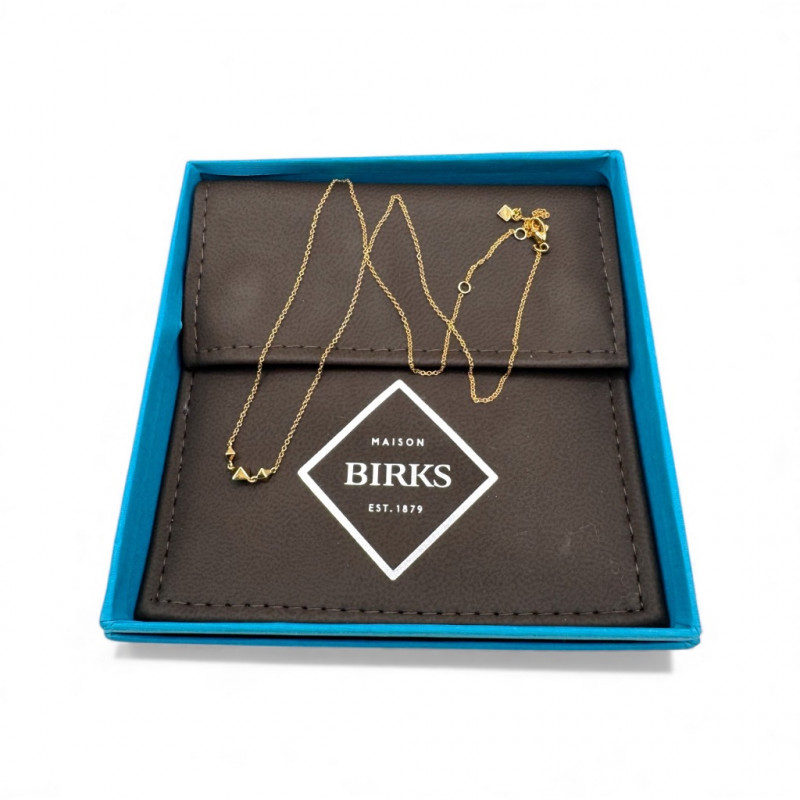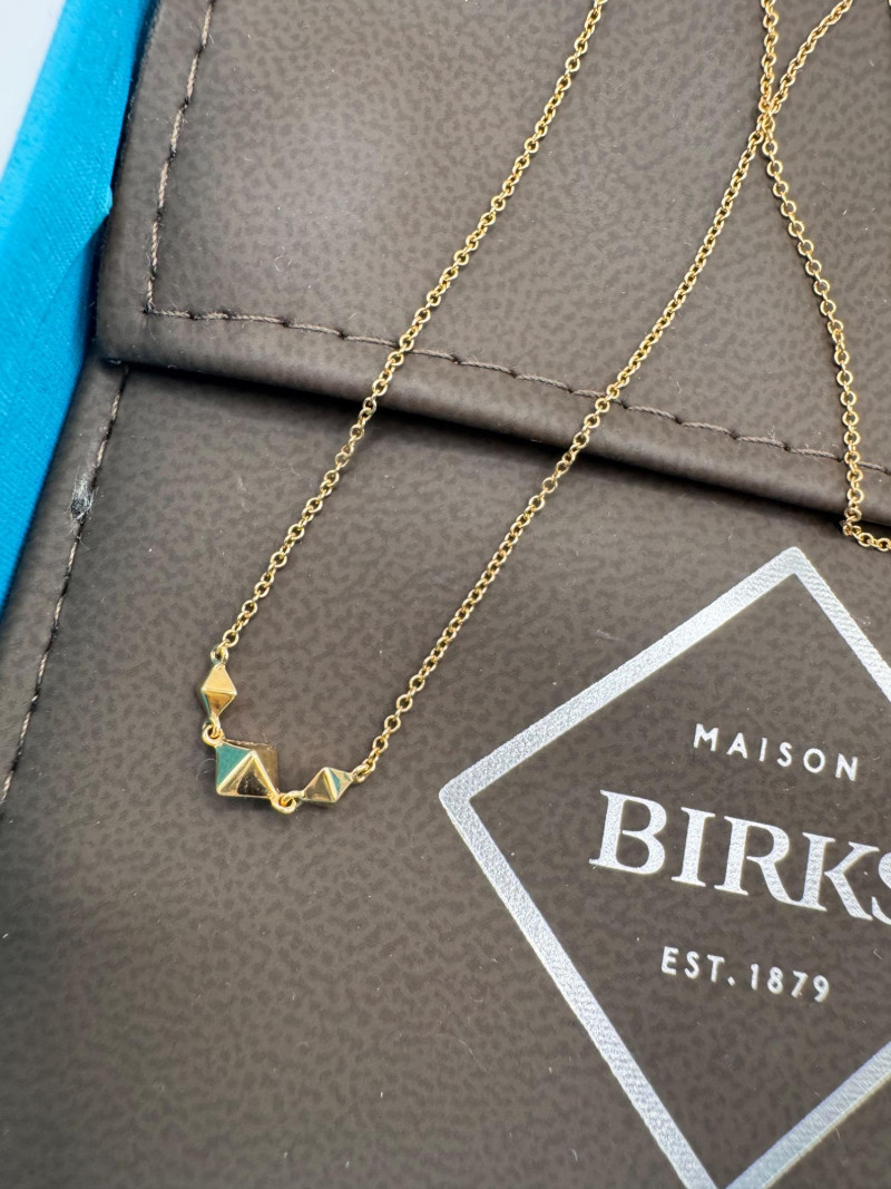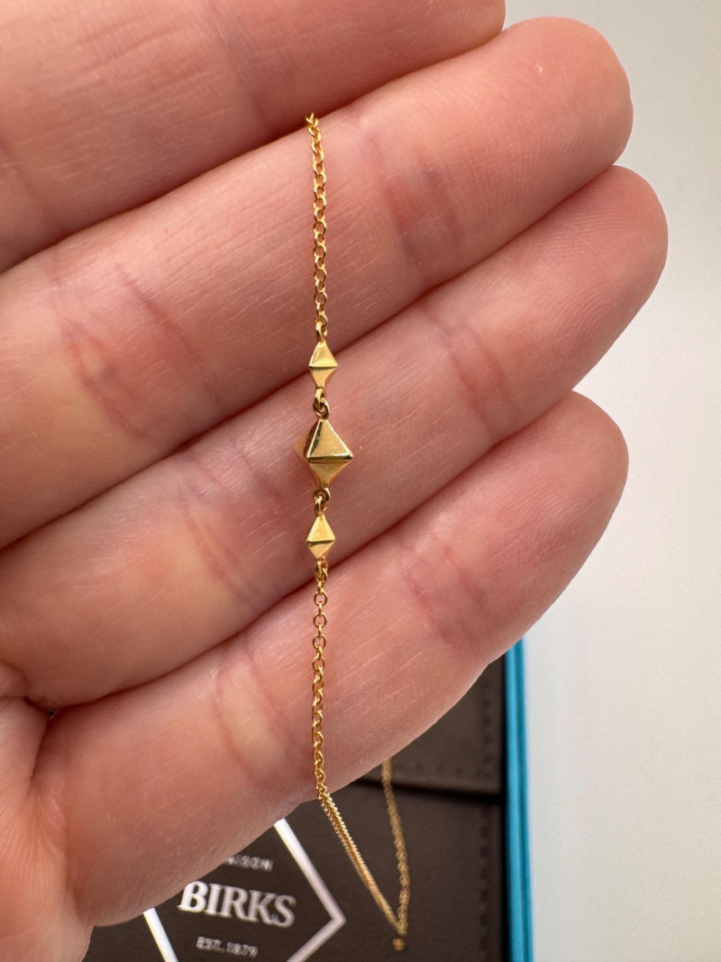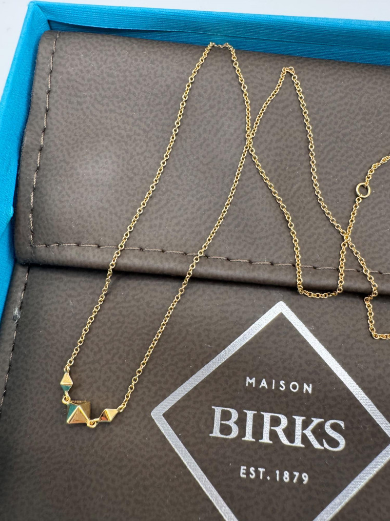 18K Gold Birks Geometric Station Necklace – Adjustable, 2.39g. Brand: Maison Birks Material: 18K yellow gold (marked 750) Design: Geometric pyramid station necklace Length: Adjustable Weight: Approx. 2.39 grams