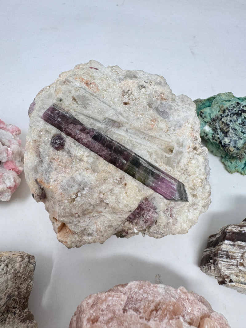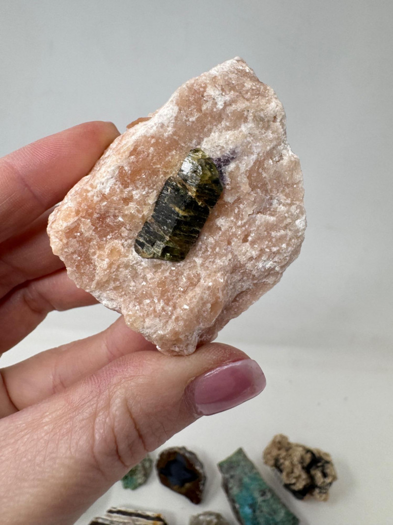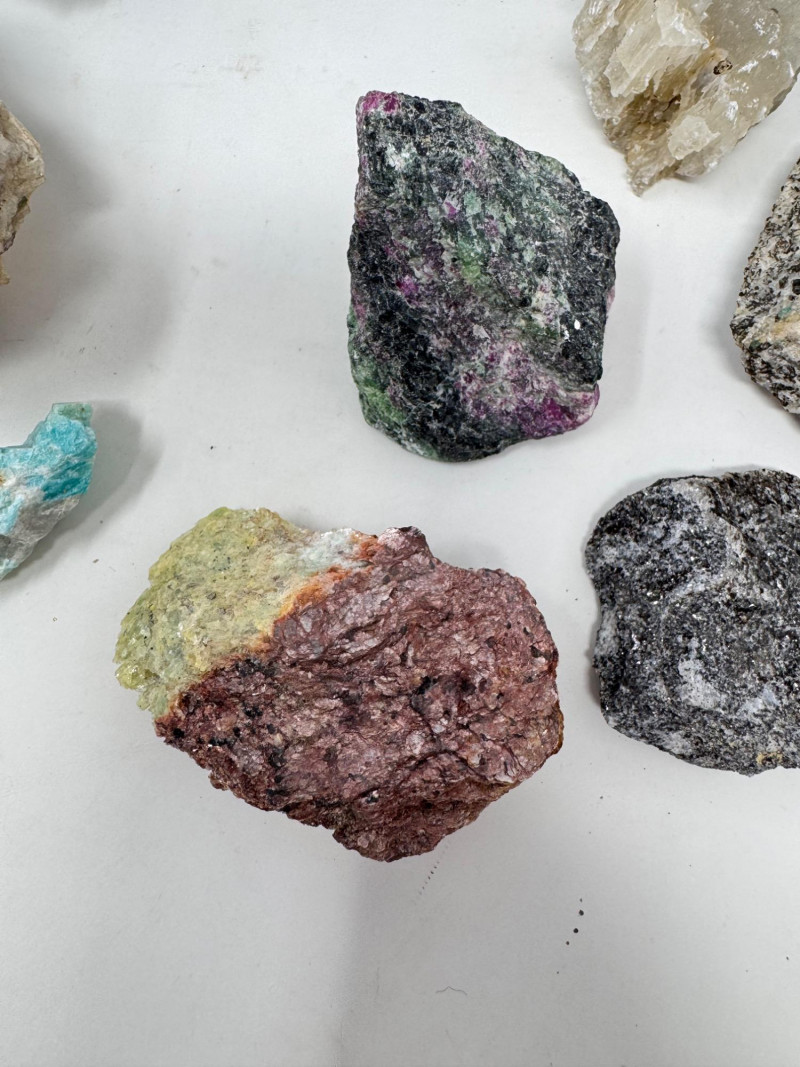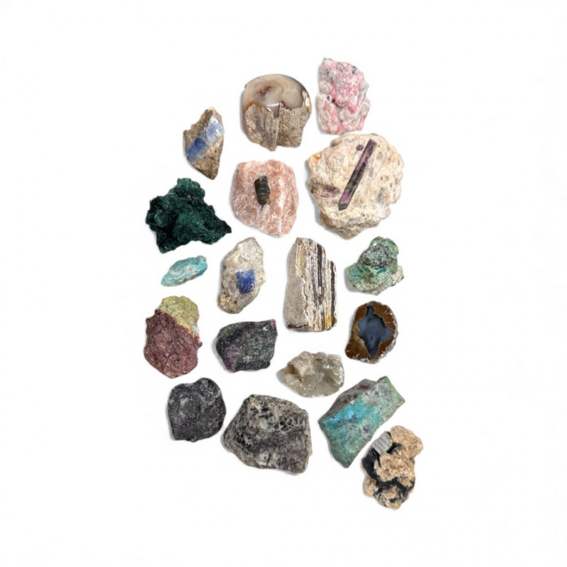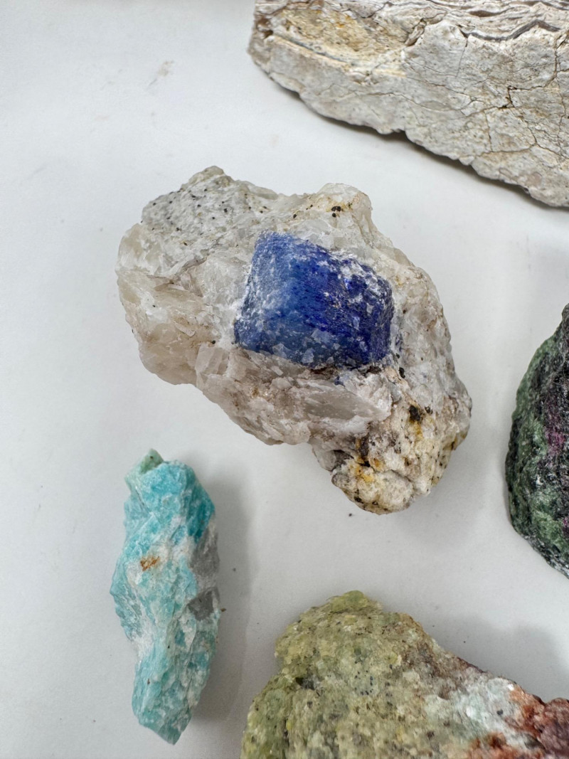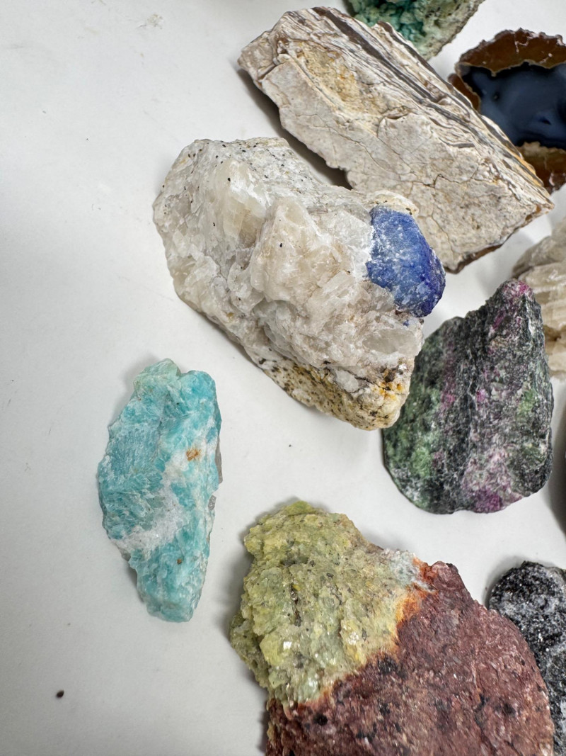 18 Pcs Mixed Mineral Lot – Tourmaline, Amazonite, Apatite, Lapis + Mixed lot of mineral and crystal specimens. Includes identified pieces such as: Amazonite in matrix & loose Apatite (tagged “Yates Otter Lake, Quebec”) Tourmaline & Scheelite (tagged “Near Whitehall, Montana”) Additional visible minerals may include: Tourmaline (pink, green, black) Chrysocolla / copper ore pieces Malachite cluster Agate slice Lepidolite / mica-rich stones Quartz and calcite pieces Blue apatite-type specimen Variety of raw, natural, and matrix specimens.