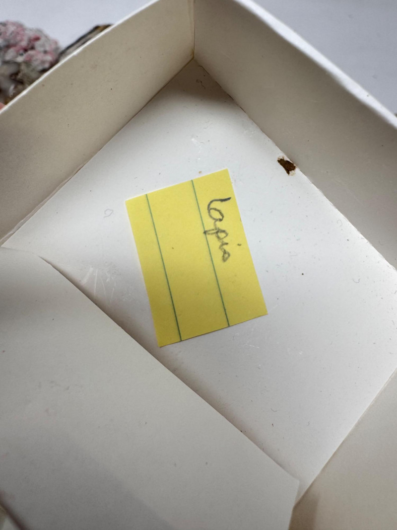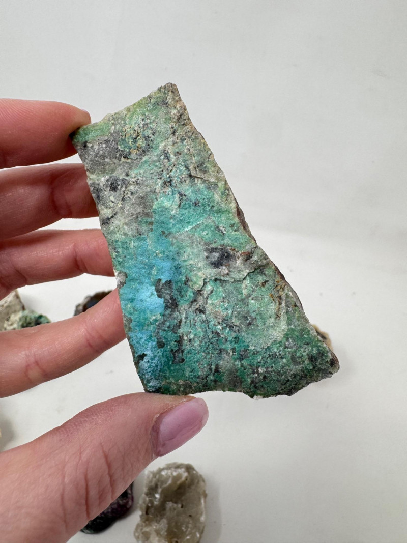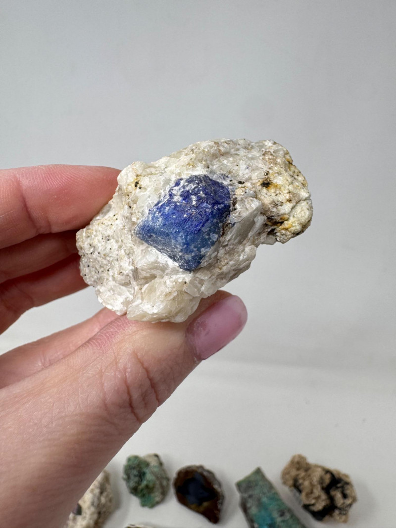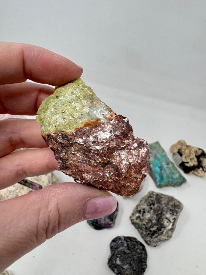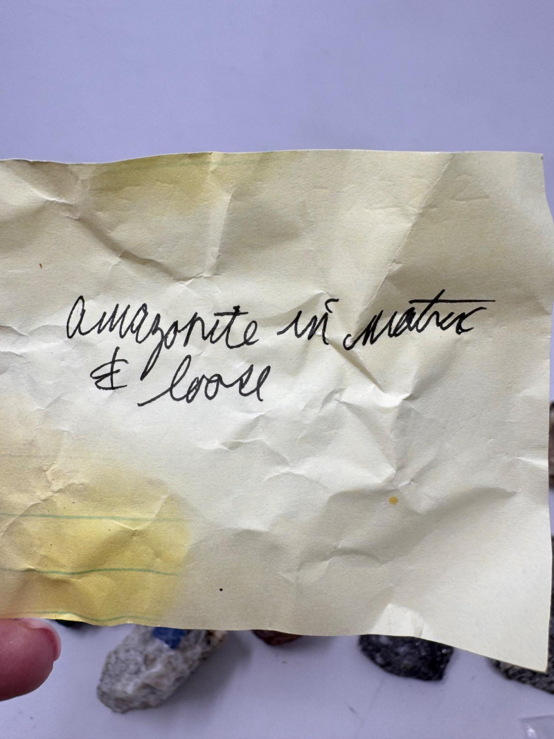 18 Pcs Mixed Mineral Lot – Tourmaline, Amazonite, Apatite, Lapis + Mixed lot of mineral and crystal specimens. Includes identified pieces such as: Amazonite in matrix & loose Apatite (tagged “Yates Otter Lake, Quebec”) Tourmaline & Scheelite (tagged “Near Whitehall, Montana”) Additional visible minerals may include: Tourmaline (pink, green, black) Chrysocolla / copper ore pieces Malachite cluster Agate slice Lepidolite / mica-rich stones Quartz and calcite pieces Blue apatite-type specimen Variety of raw, natural, and matrix specimens.