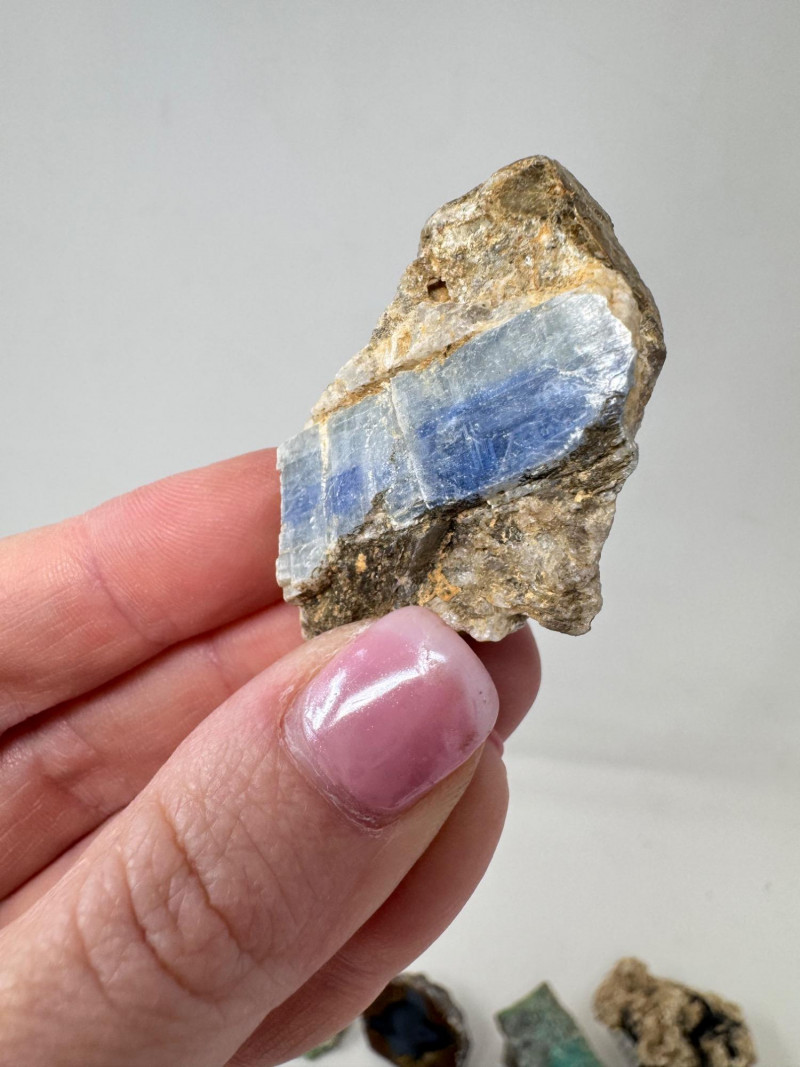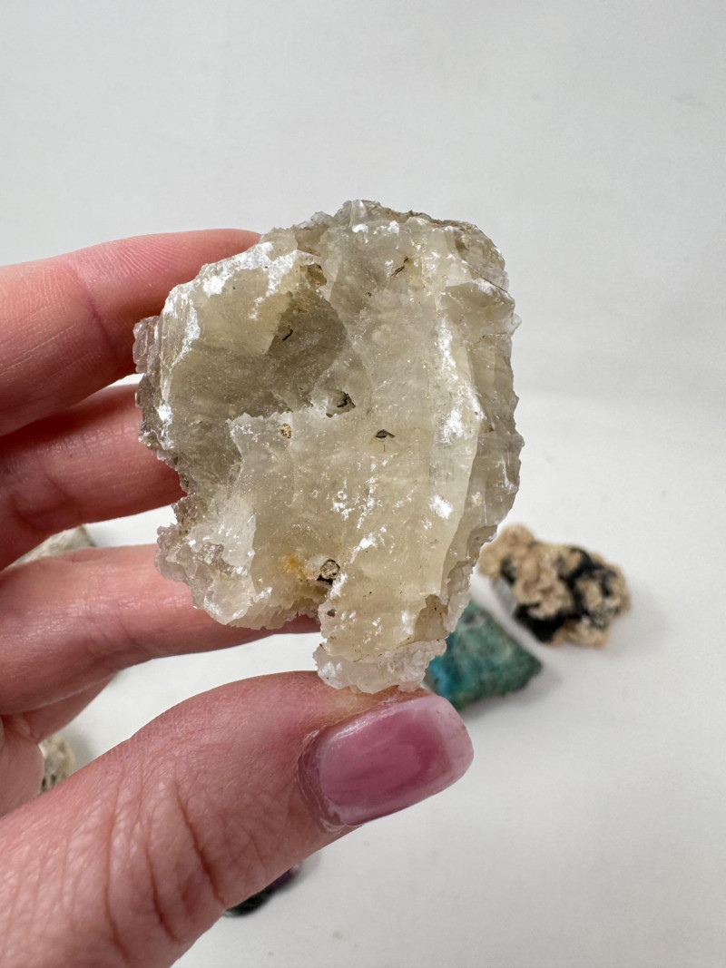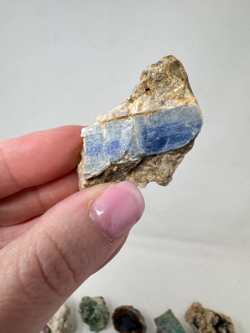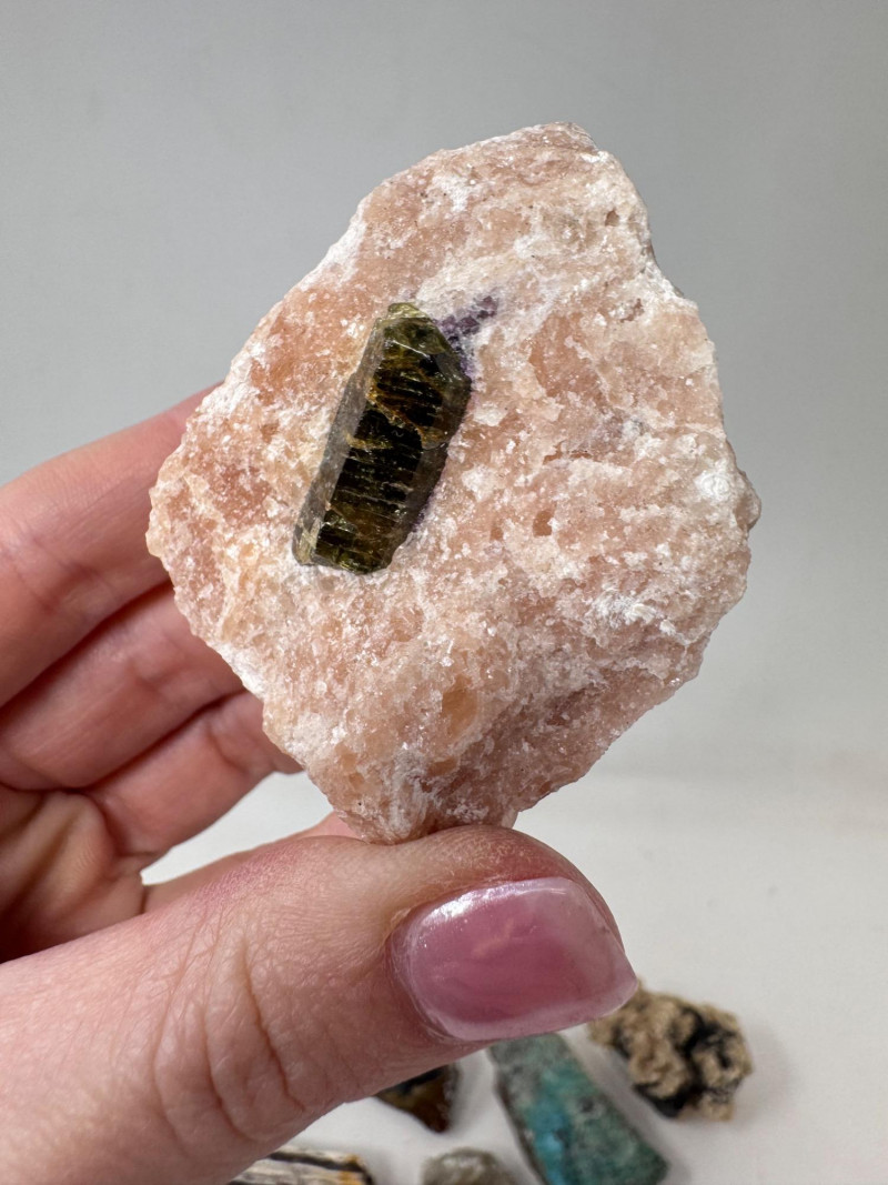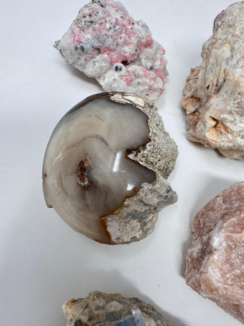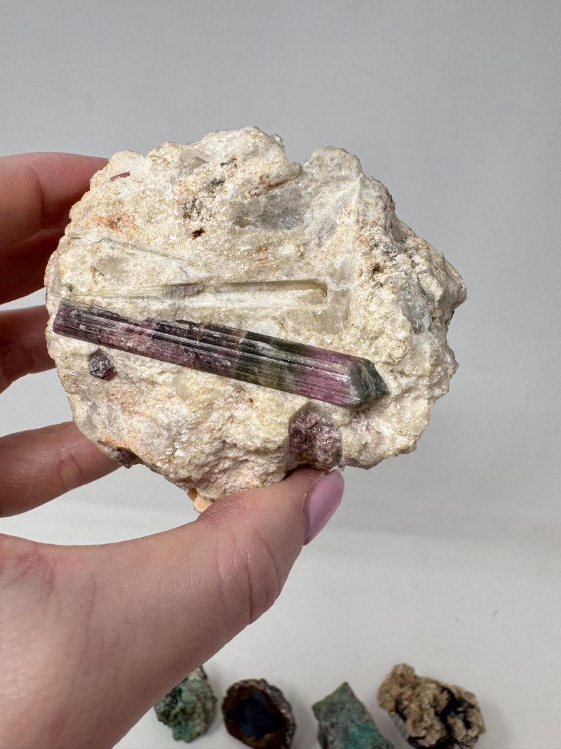18 Pcs Mixed Mineral Lot – Tourmaline, Amazonite, Apatite, Lapis + Mixed lot of mineral and crystal specimens. Includes identified pieces such as: Amazonite in matrix & loose Apatite (tagged “Yates Otter Lake, Quebec”) Tourmaline & Scheelite (tagged “Near Whitehall, Montana”) Additional visible minerals may include: Tourmaline (pink, green, black) Chrysocolla / copper ore pieces Malachite cluster Agate slice Lepidolite / mica-rich stones Quartz and calcite pieces Blue apatite-type specimen Variety of raw, natural, and matrix specimens.