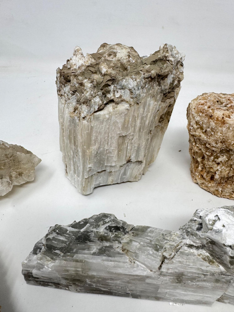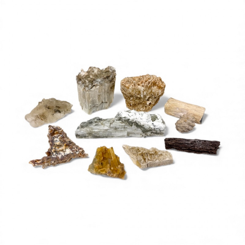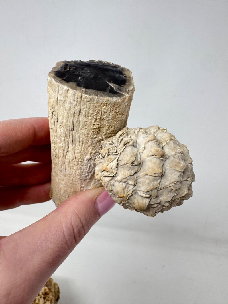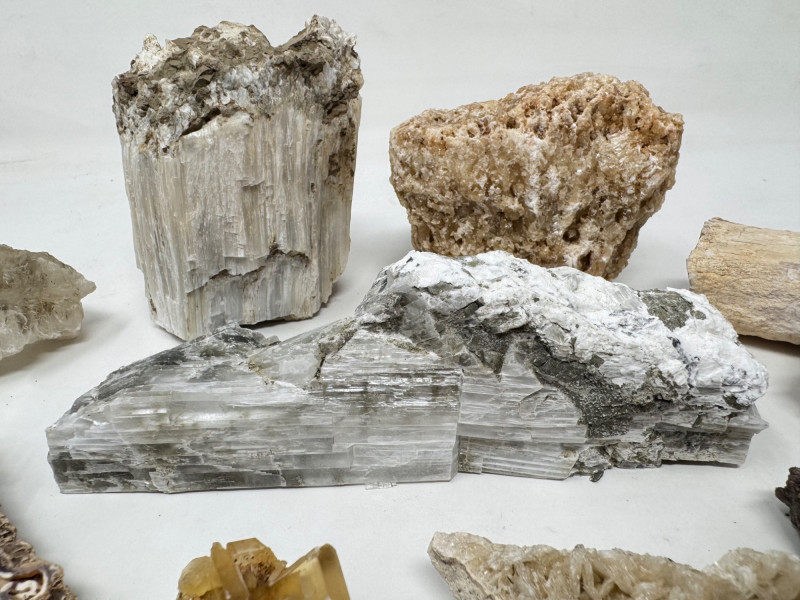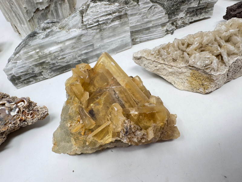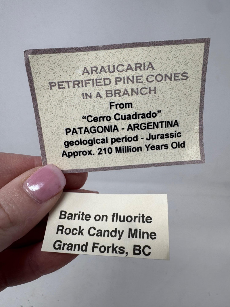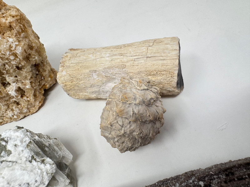 9pcs Mixed Fossil & Mineral Lot – Petrified Wood, Barite, Araucaria + Largest piece approx. 7” long Includes: Araucaria petrified pine cone in branch (Patagonia, Argentina – Jurassic, ~210mya) Barite on fluorite – Rock Candy Mine, Grand Forks, BC Fossilized wood (Czech Republic, with certificate) Metaline Formation fossils (Washington) – includes trilobite material Large clear selenite/gypsum blade specimens Golden barite crystal cluster Additional mixed mineral & fossilized pieces