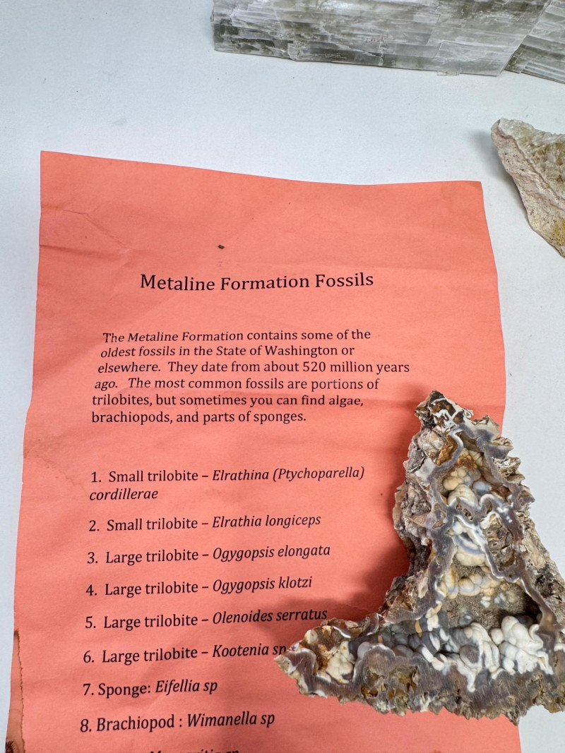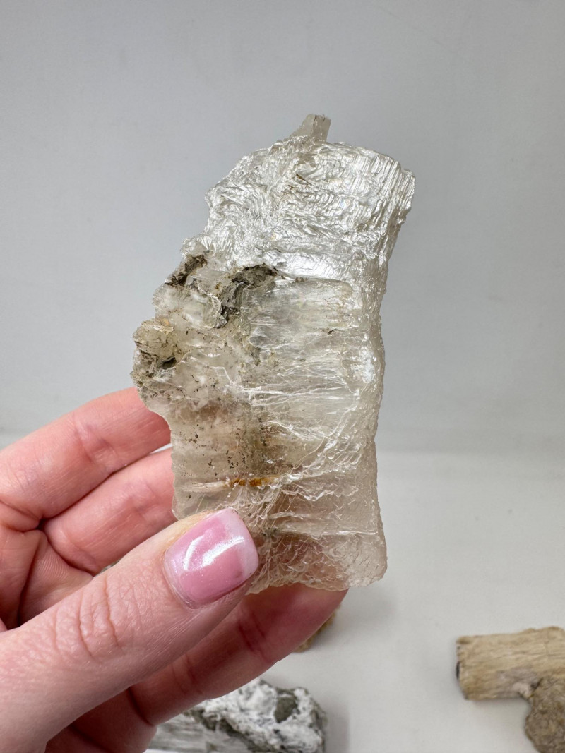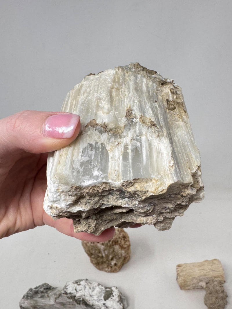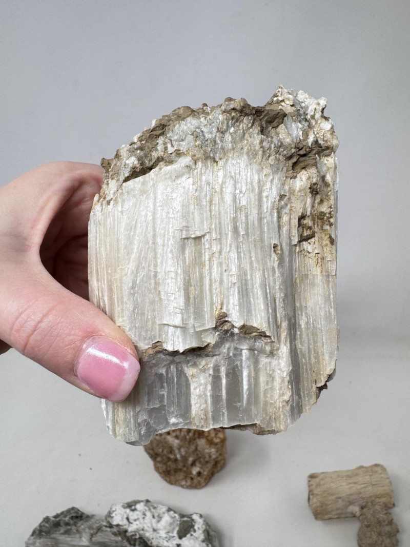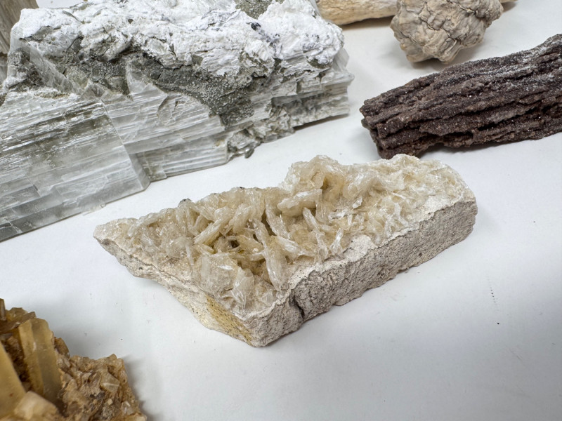 9pcs Mixed Fossil & Mineral Lot – Petrified Wood, Barite, Araucaria + Largest piece approx. 7” long Includes: Araucaria petrified pine cone in branch (Patagonia, Argentina – Jurassic, ~210mya) Barite on fluorite – Rock Candy Mine, Grand Forks, BC Fossilized wood (Czech Republic, with certificate) Metaline Formation fossils (Washington) – includes trilobite material Large clear selenite/gypsum blade specimens Golden barite crystal cluster Additional mixed mineral & fossilized pieces