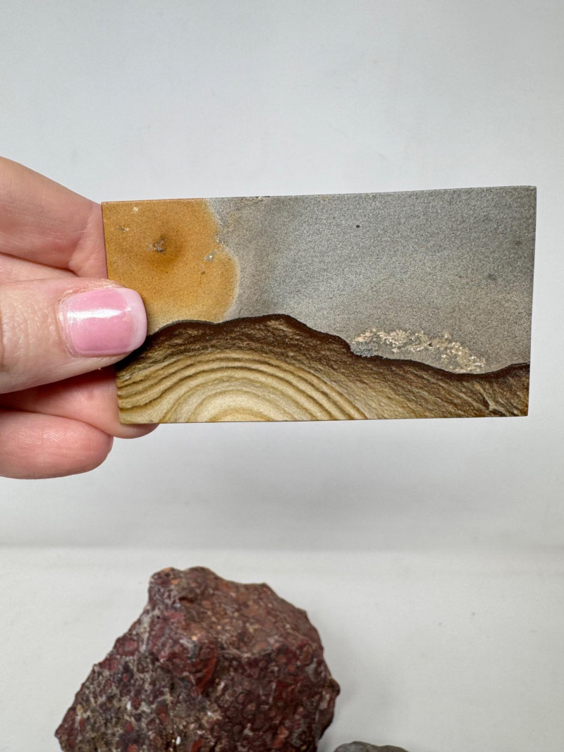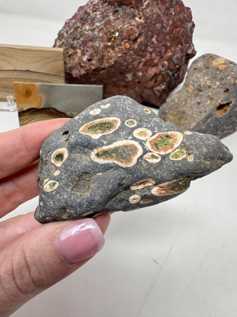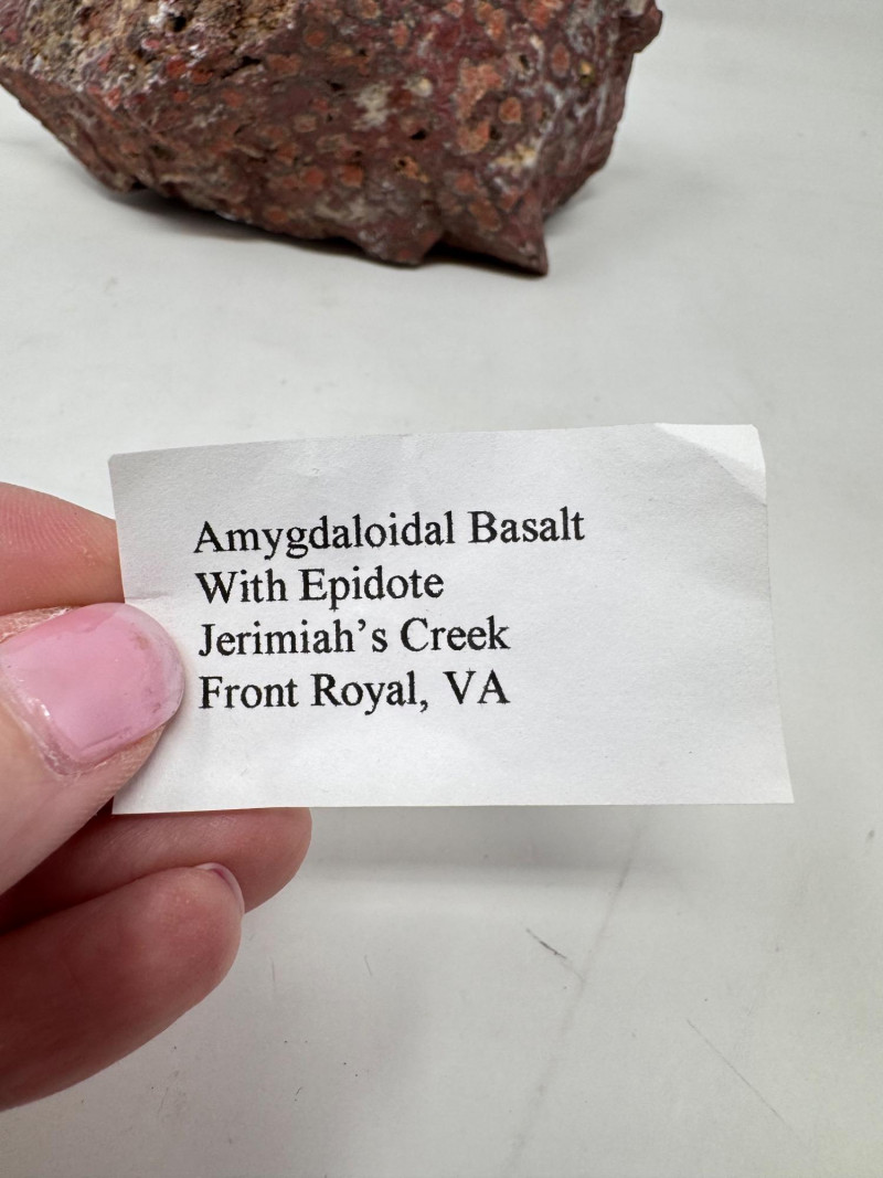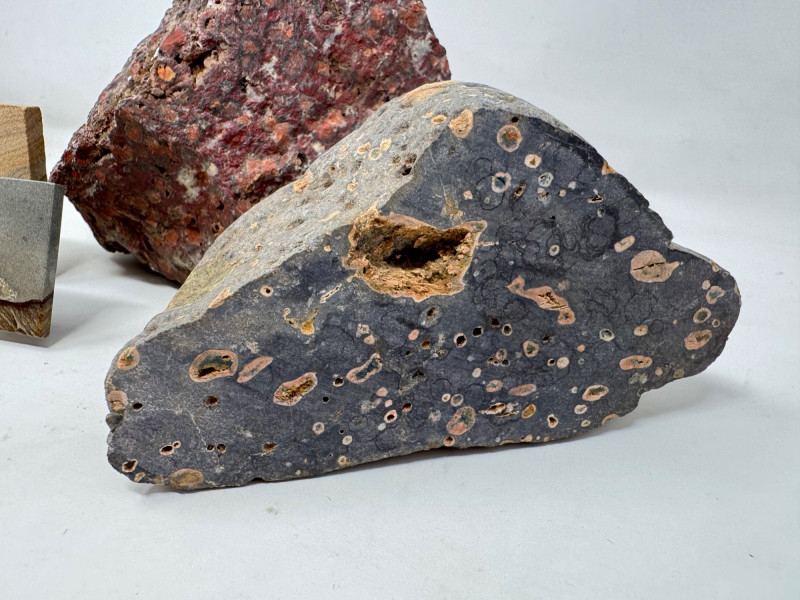 Amygdaloidal Basalt w/ Epidote, Picture Stone Slabs & Red Concretion. Amygdaloidal basalt with epidote, collected from Jerimiah’s Creek, Front Royal, VA Basalt piece features distinct amygdules throughout Large red concretion stone, approx. 5.5" tall × 7" wide Includes two polished Picture Stone slabs from Kanab, Utah Triassic Period (~150 million years old) Additional natural stone specimens with varied texture and color.