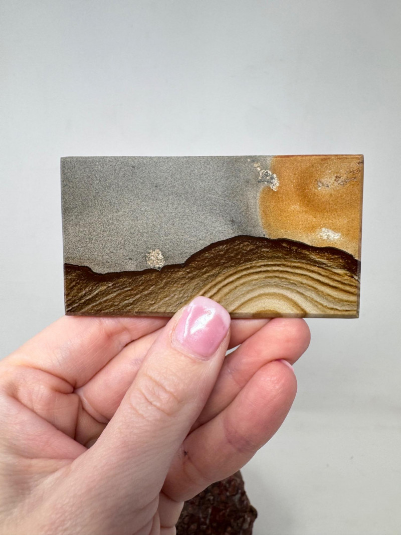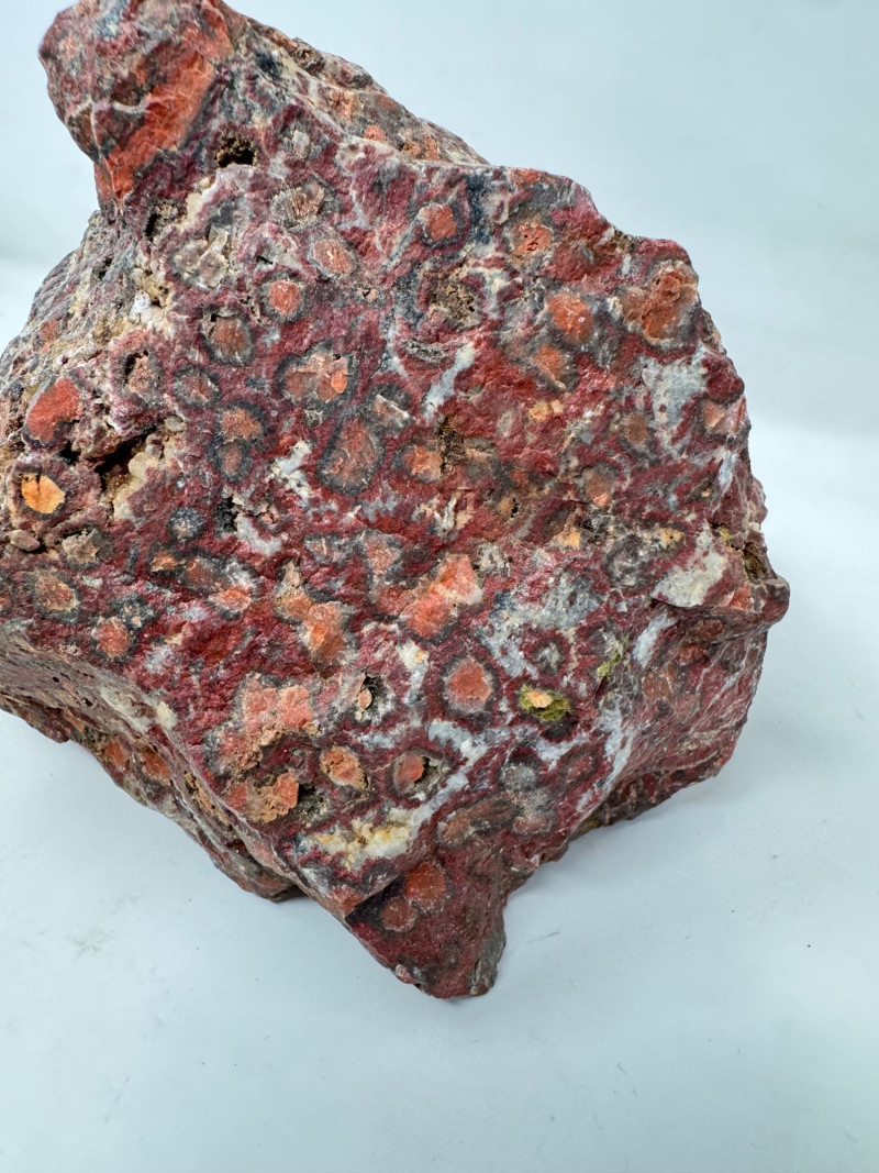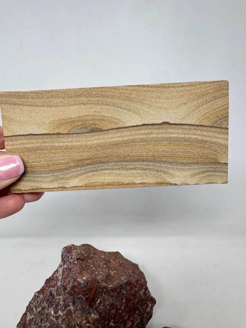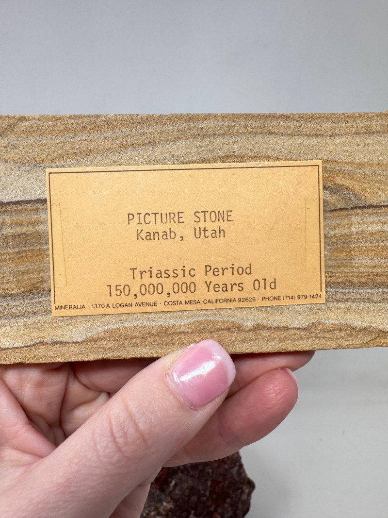 Amygdaloidal Basalt w/ Epidote, Picture Stone Slabs & Red Concretion. Amygdaloidal basalt with epidote, collected from Jerimiah’s Creek, Front Royal, VA Basalt piece features distinct amygdules throughout Large red concretion stone, approx. 5.5" tall × 7" wide Includes two polished Picture Stone slabs from Kanab, Utah Triassic Period (~150 million years old) Additional natural stone specimens with varied texture and color.
