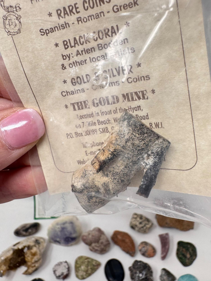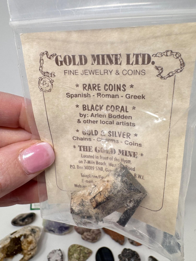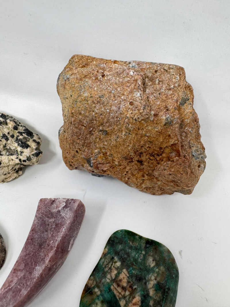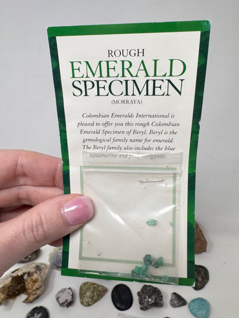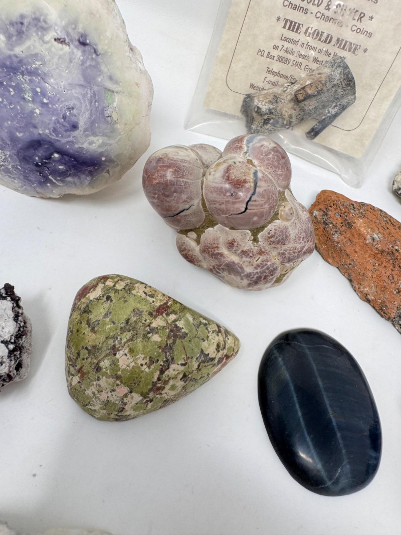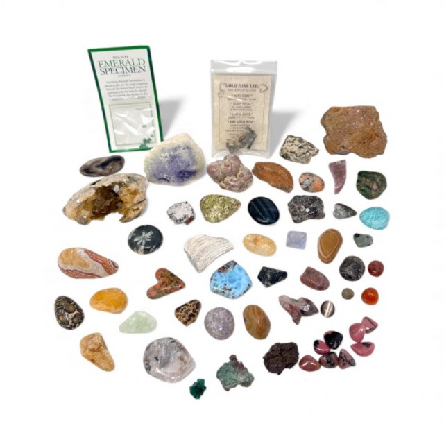 Large Assorted Mineral & Gemstone – Rough, Polished & Tumbled 50+ pcs. Rough Colombian Emerald (Beryl) specimen in original labeled packet “Gold Mine Ltd.” souvenir packet containing a small black coral piece Large rough crystal cluster with honey-gold points Variety of tumbled stones, including examples resembling: Amazonite Rhodonite Larimar-type stone (blue patterned) Carnelian Red jasper