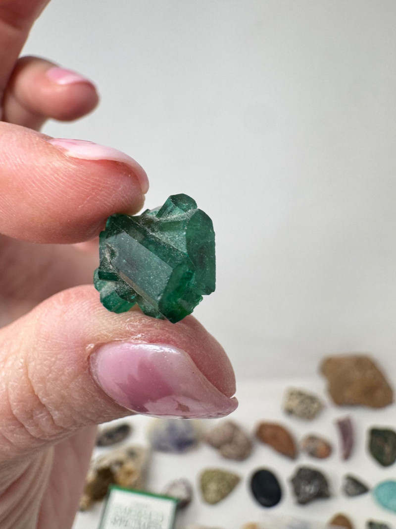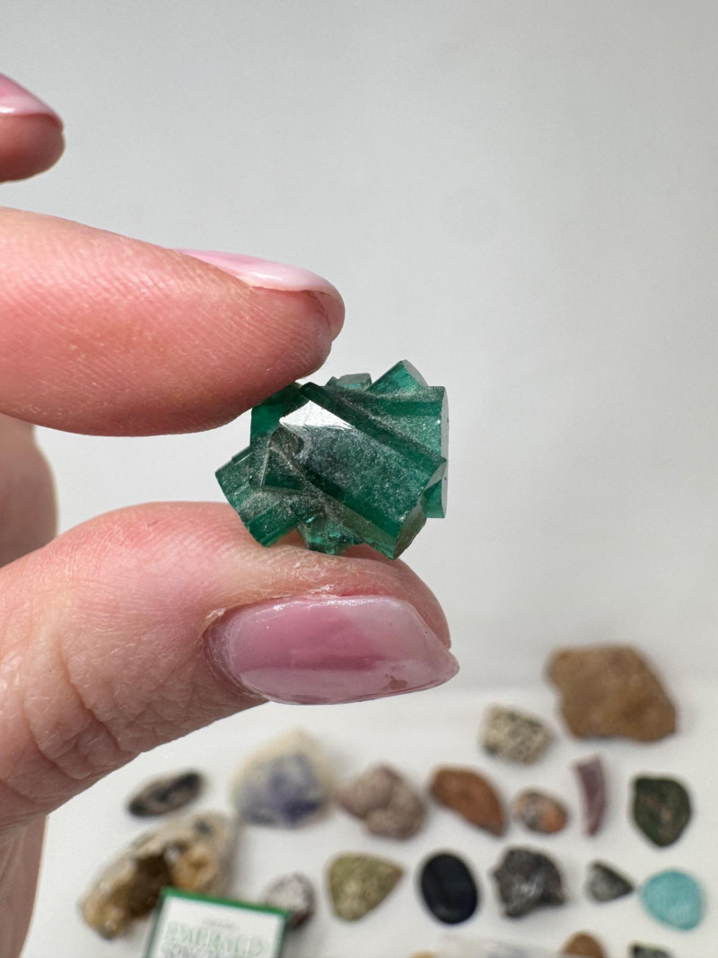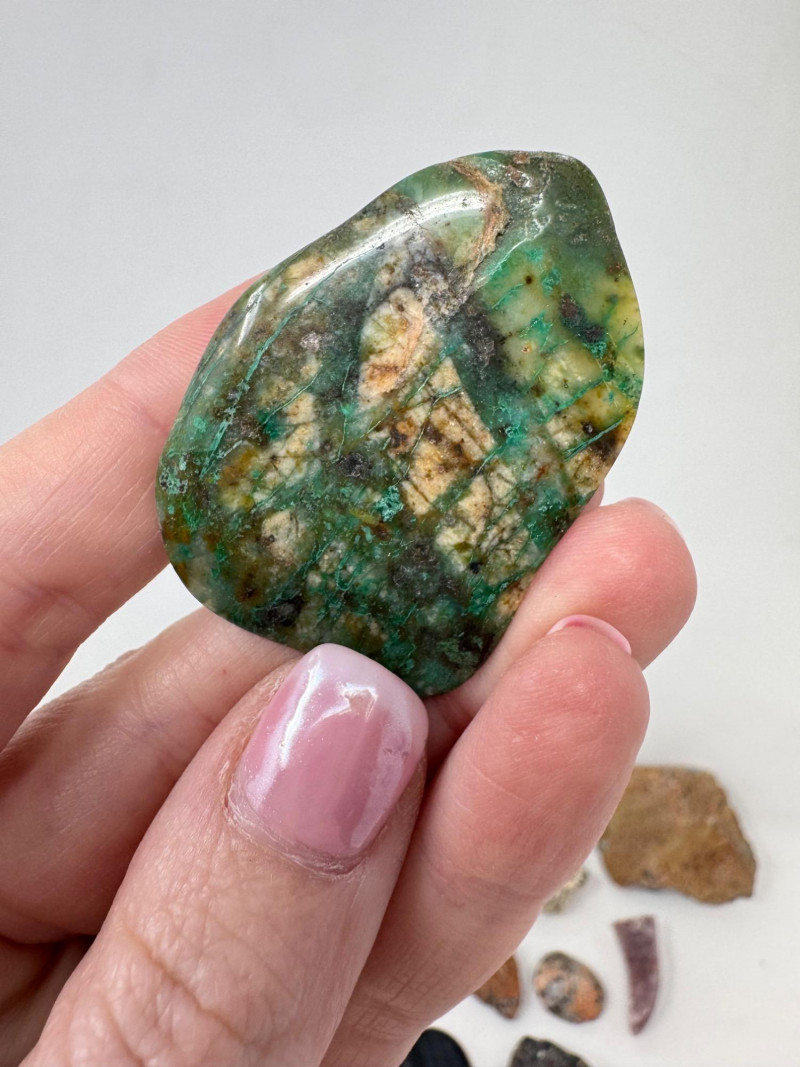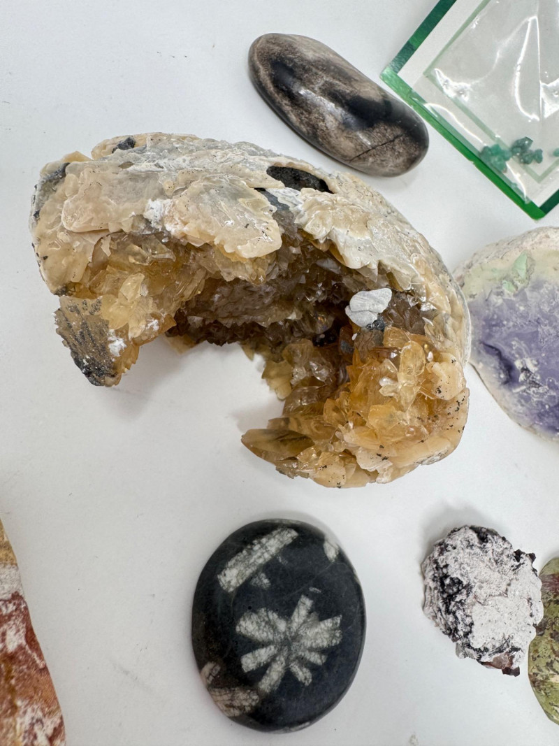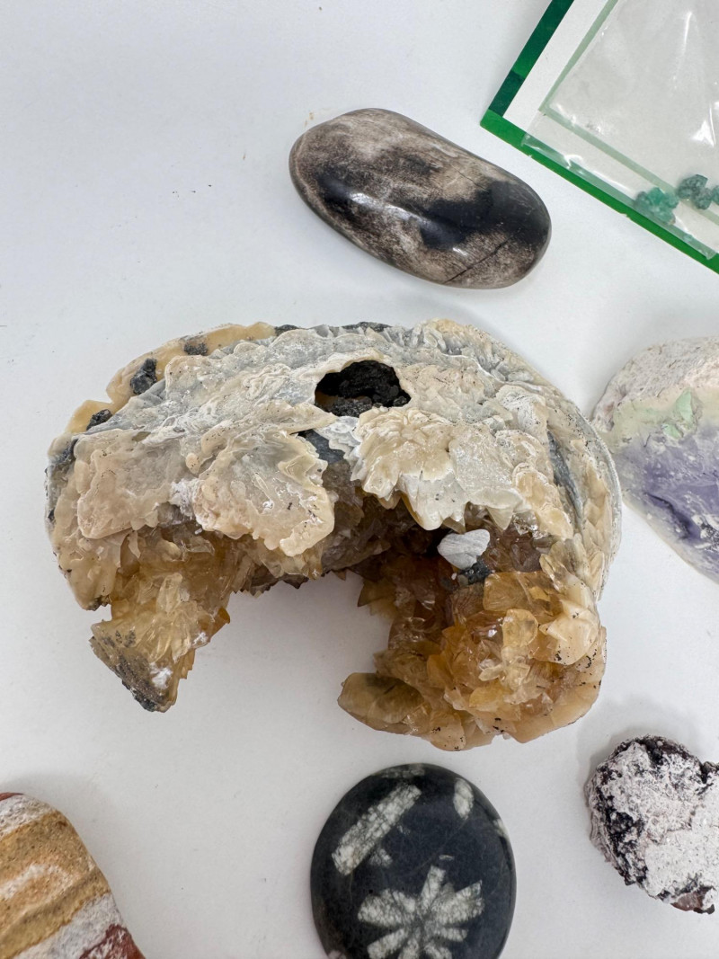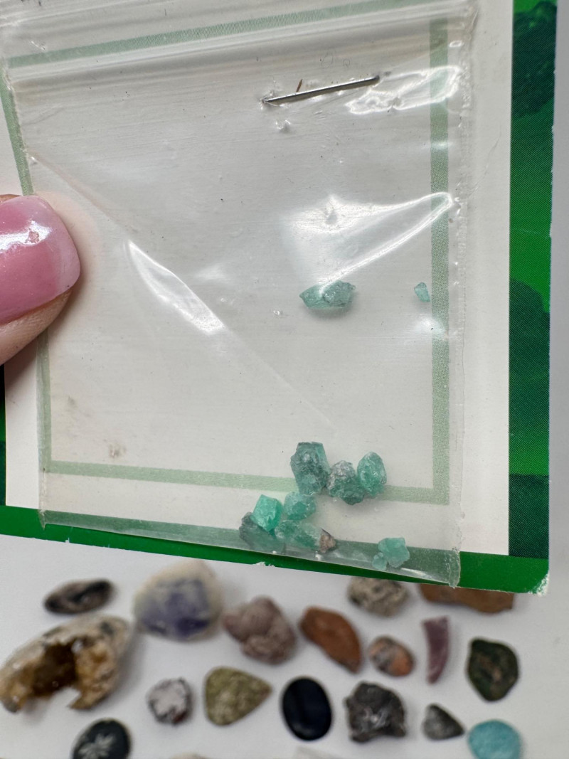 Large Assorted Mineral & Gemstone – Rough, Polished & Tumbled 50+ pcs. Rough Colombian Emerald (Beryl) specimen in original labeled packet “Gold Mine Ltd.” souvenir packet containing a small black coral piece Large rough crystal cluster with honey-gold points Variety of tumbled stones, including examples resembling: Amazonite Rhodonite Larimar-type stone (blue patterned) Carnelian Red jasper