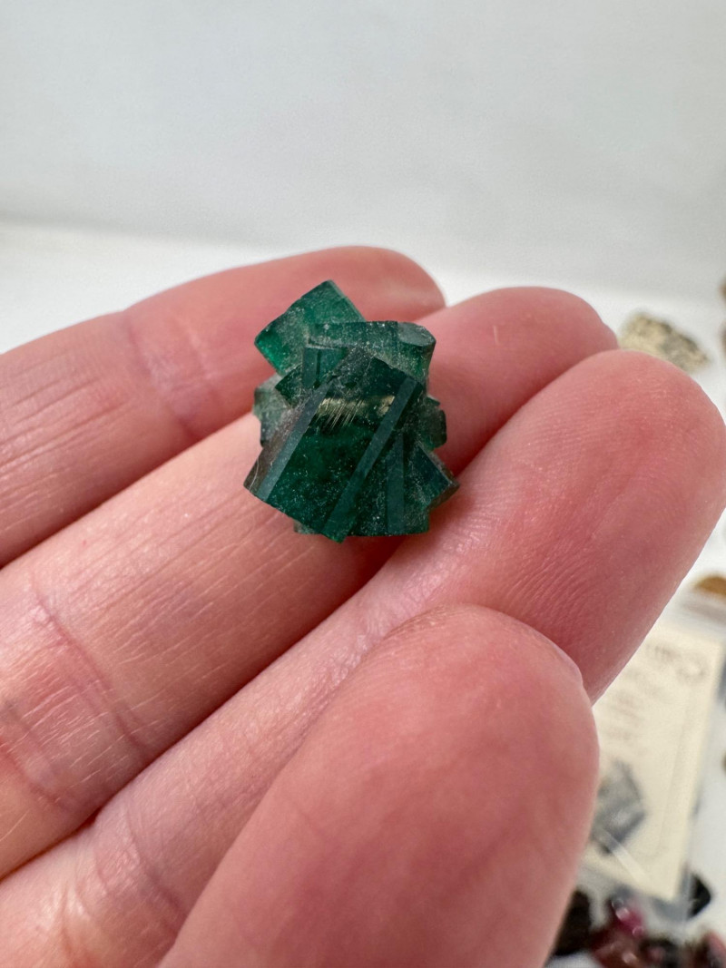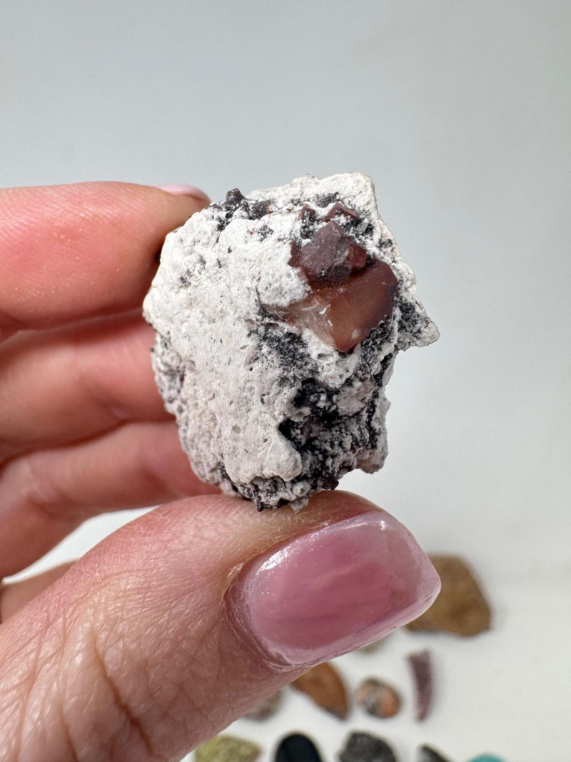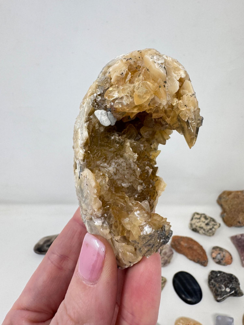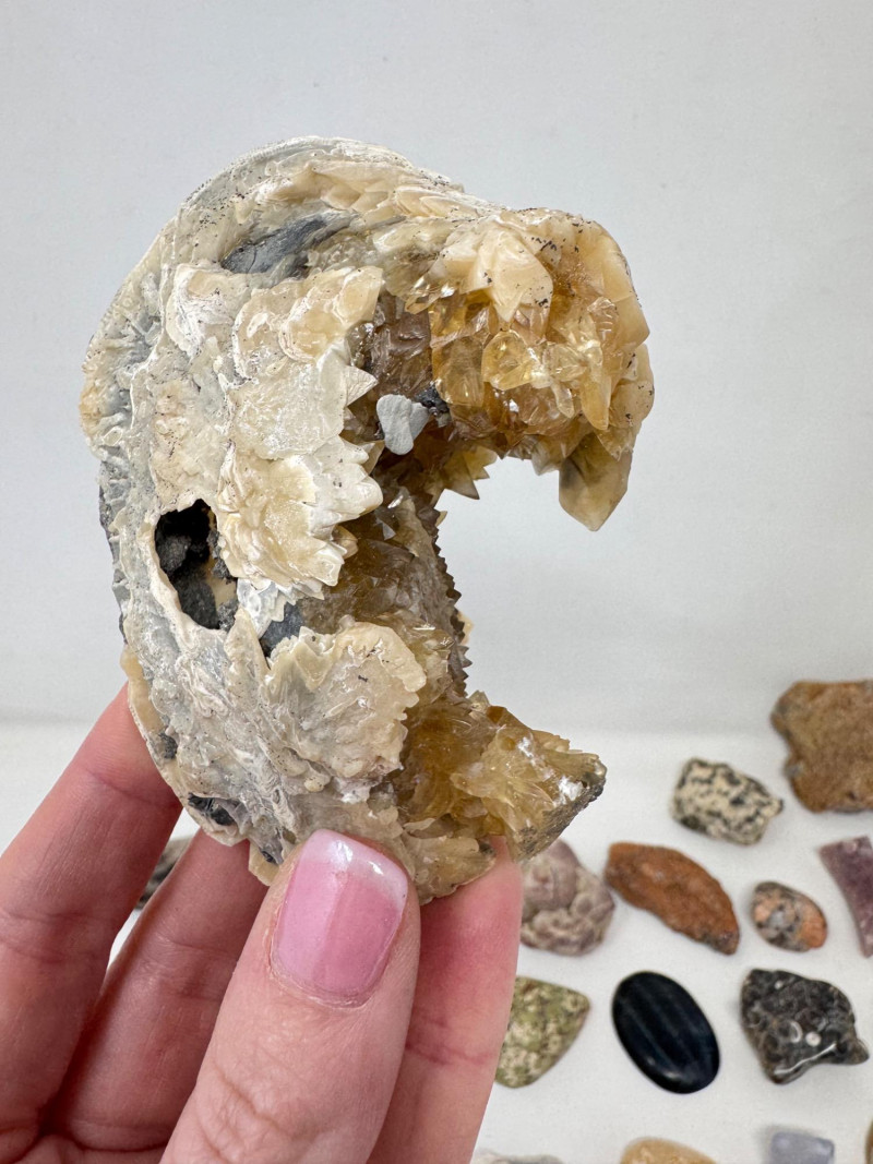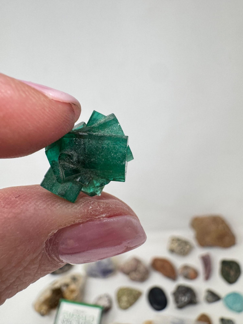 Large Assorted Mineral & Gemstone – Rough, Polished & Tumbled 50+ pcs. Rough Colombian Emerald (Beryl) specimen in original labeled packet “Gold Mine Ltd.” souvenir packet containing a small black coral piece Large rough crystal cluster with honey-gold points Variety of tumbled stones, including examples resembling: Amazonite Rhodonite Larimar-type stone (blue patterned) Carnelian Red jasper