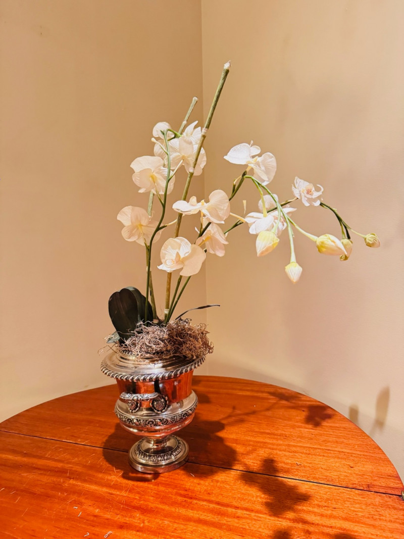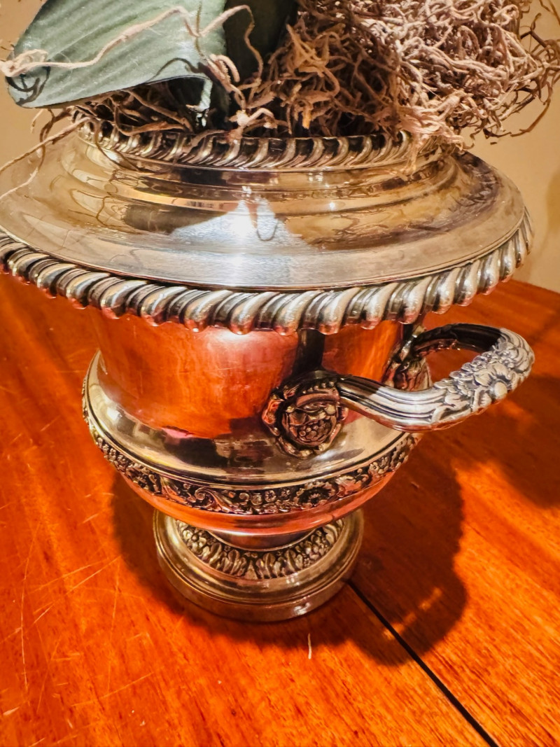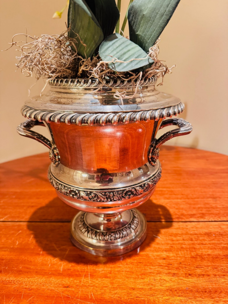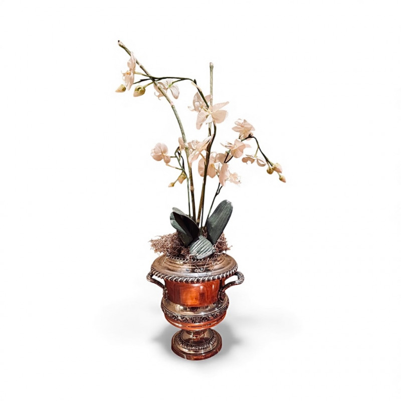 Regency Style Silver Plated Urn Vase w/ White Orchid Arrangement.