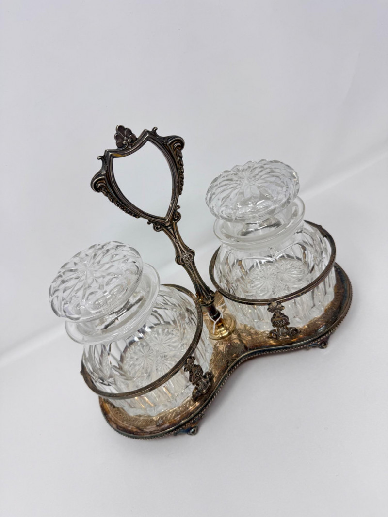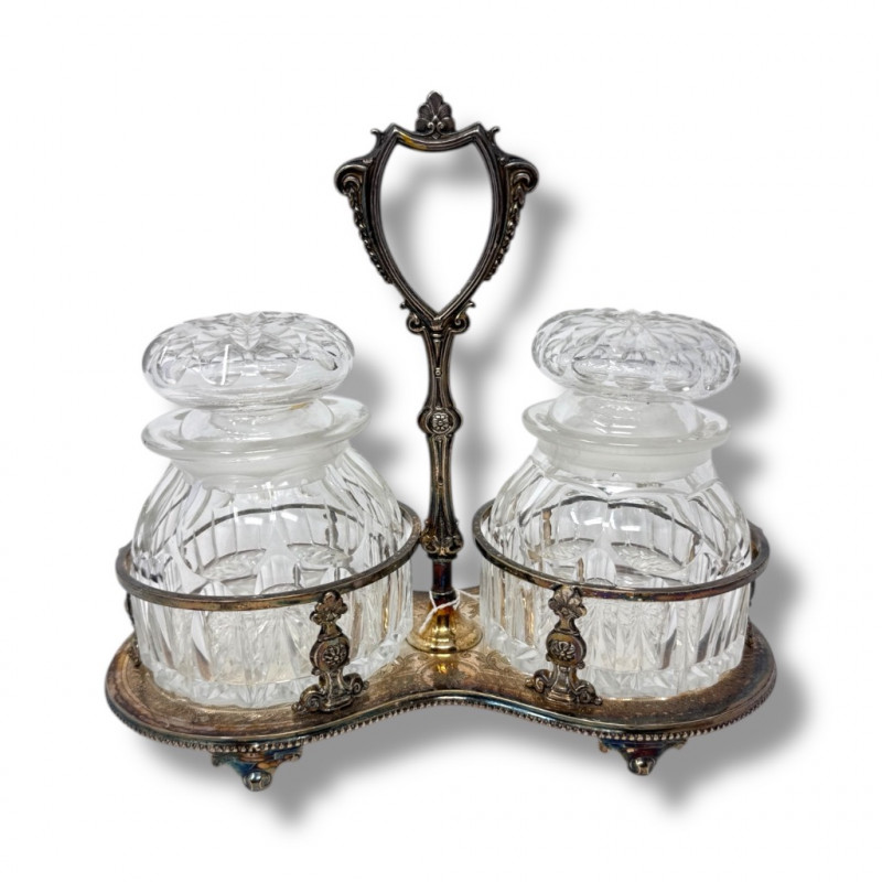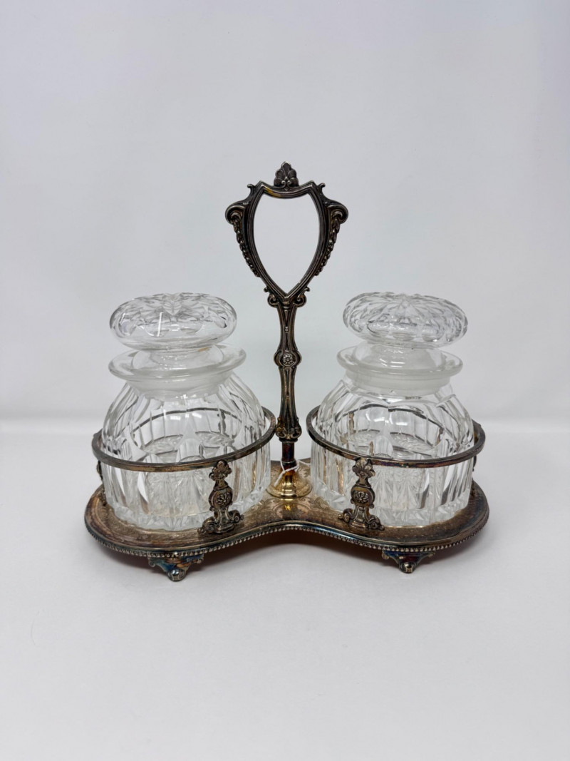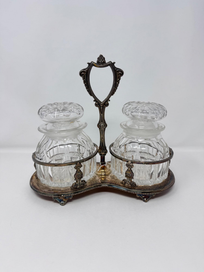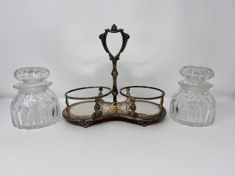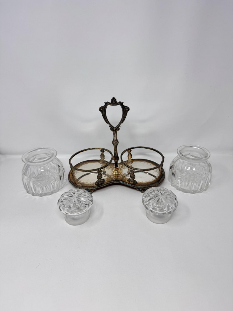 Antique Silver Plate Double Jam Stand w/ Cut Crystal Jars.