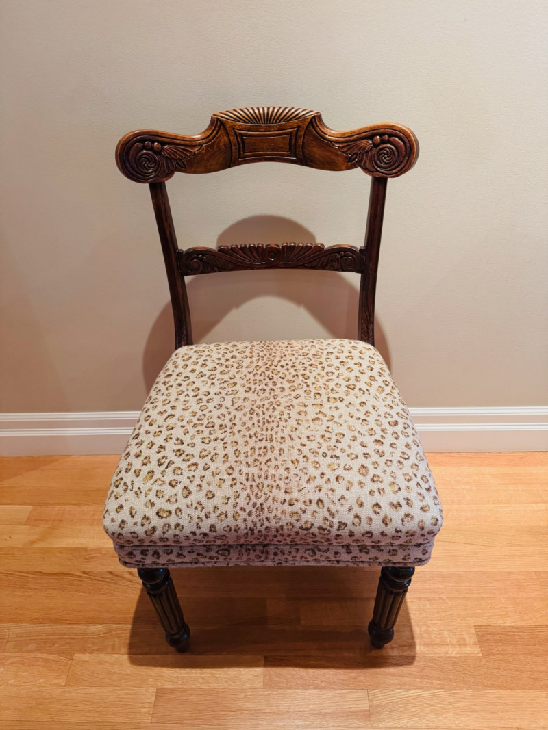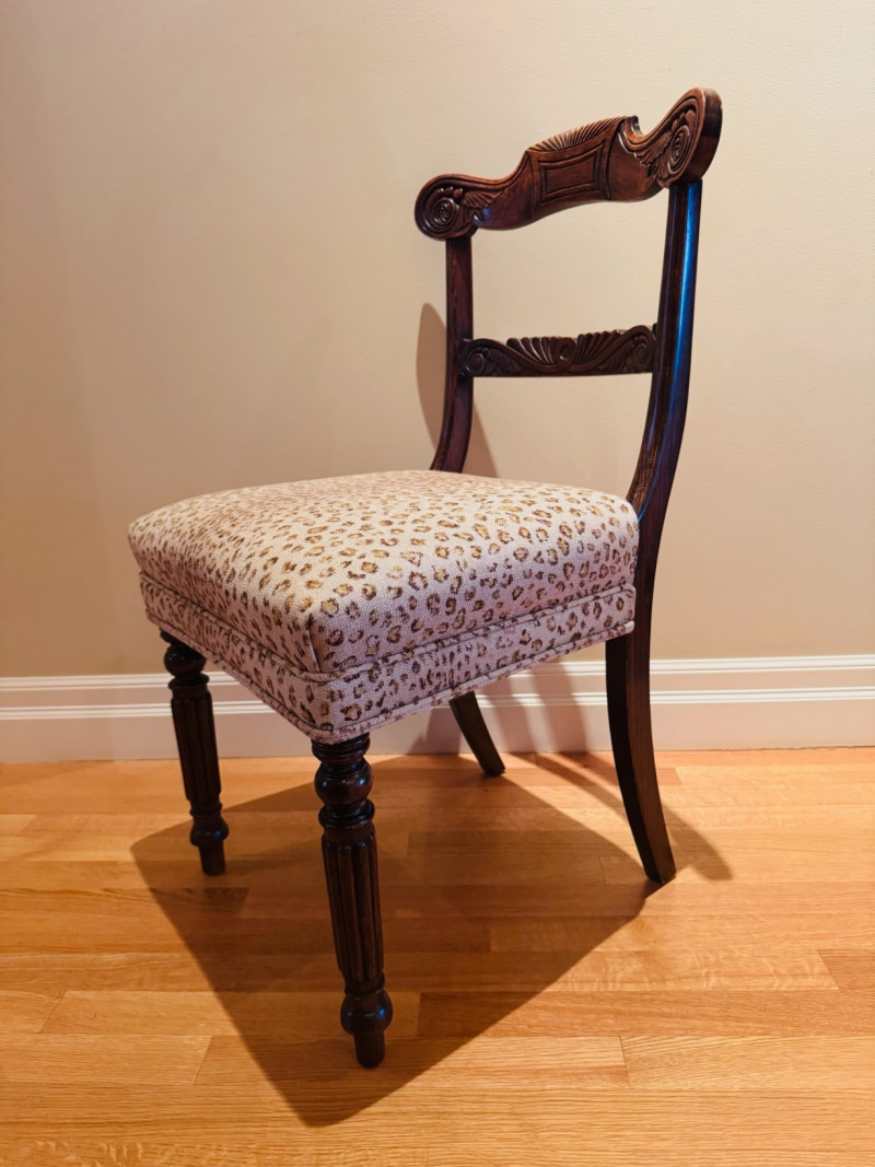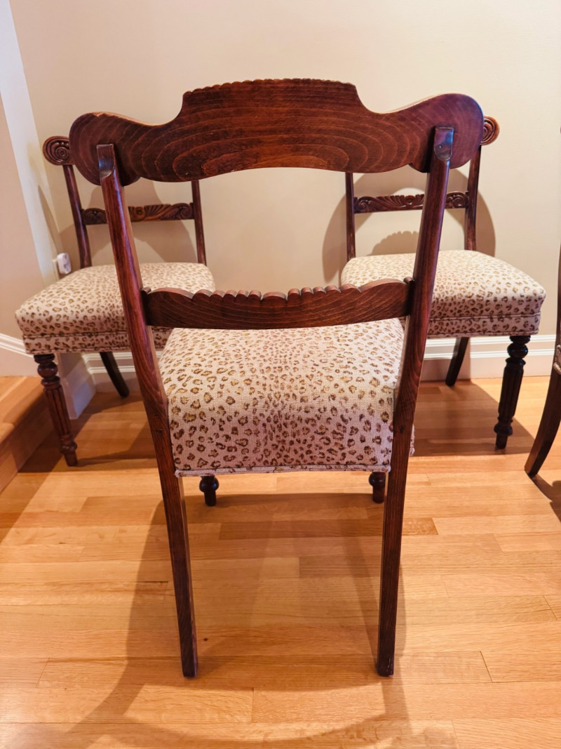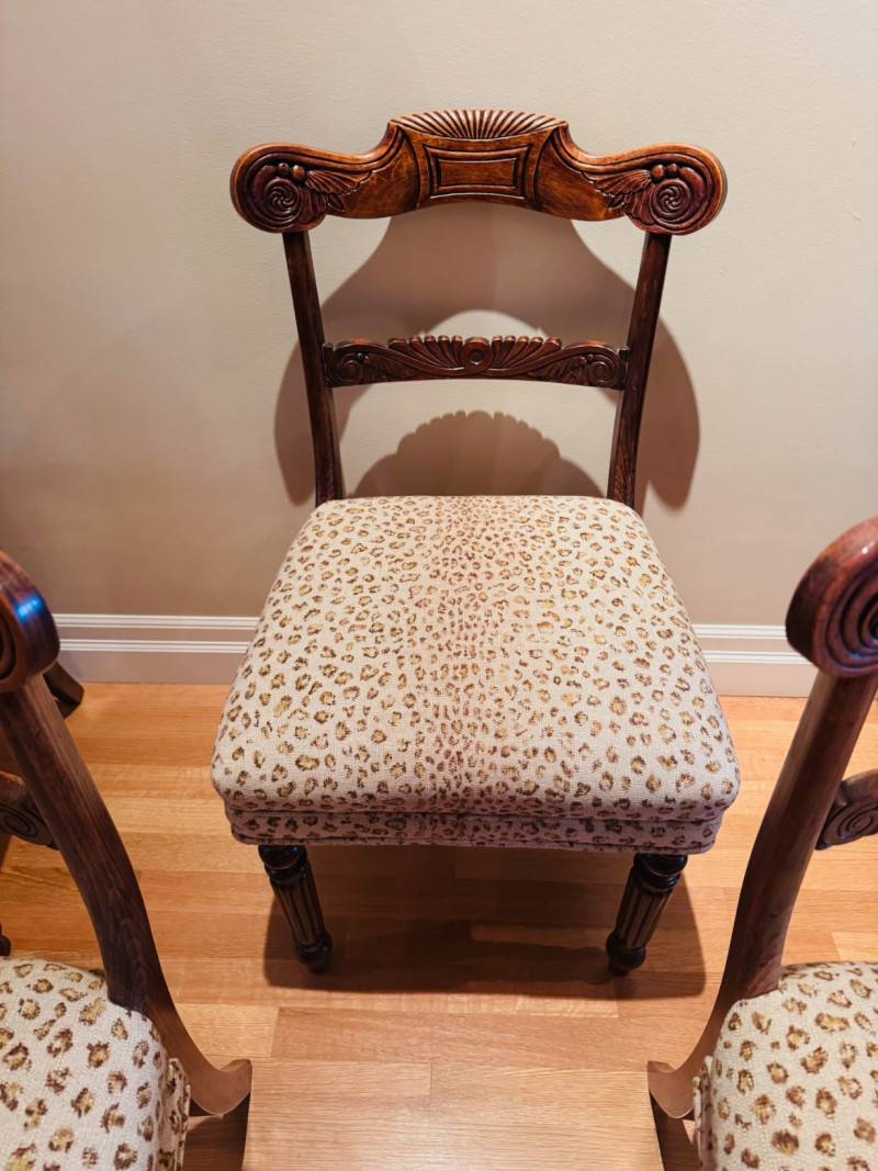 4 Decorative Carved Wood Dining Chairs w/ Leopard Upholstery. Dimensions (each chair): Overall: 18.5” W x 17” D x 32” H Seat area: 18” W x 17” D x 15” seat height