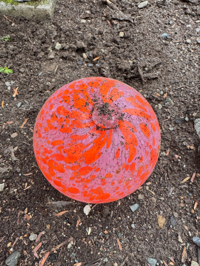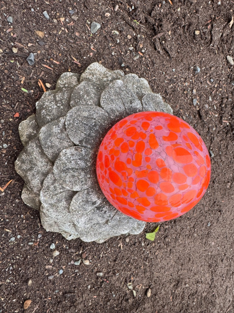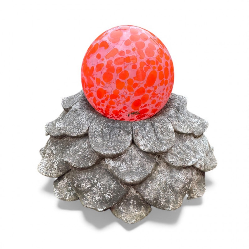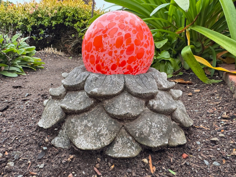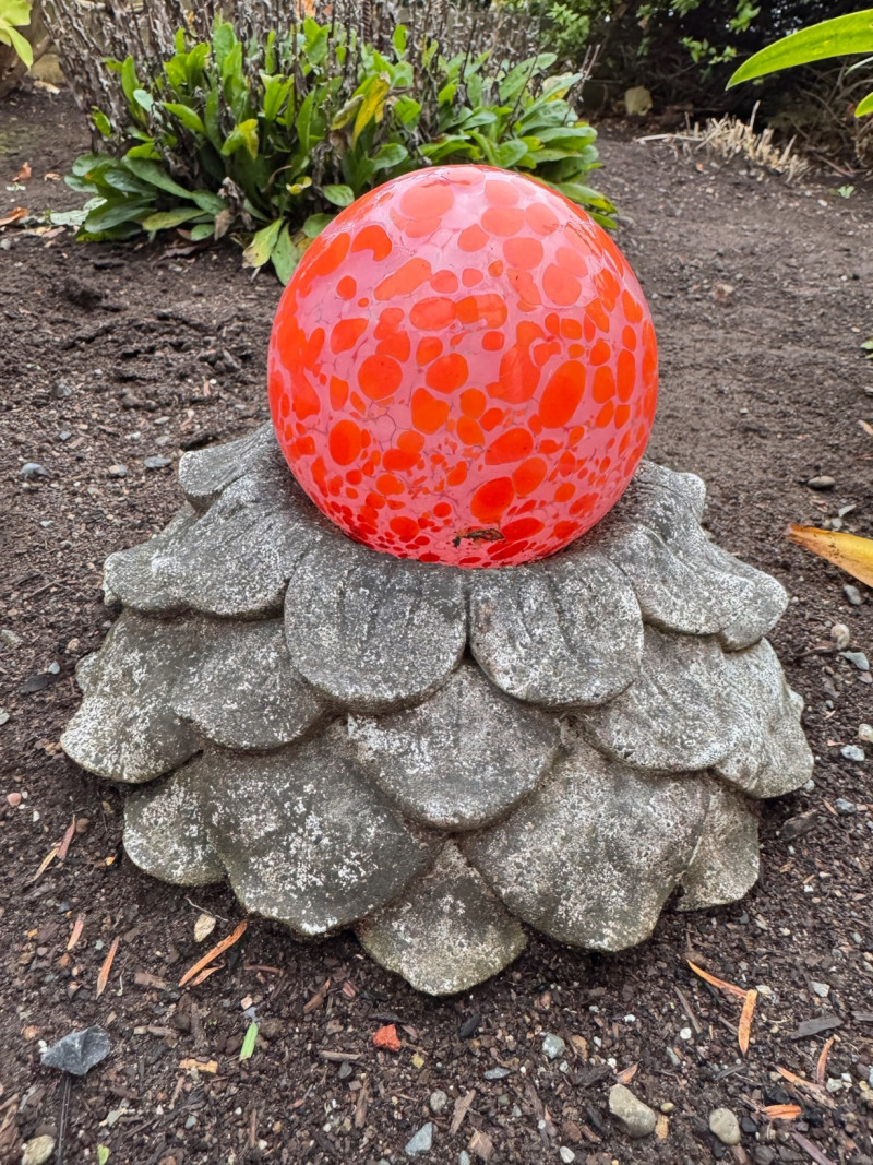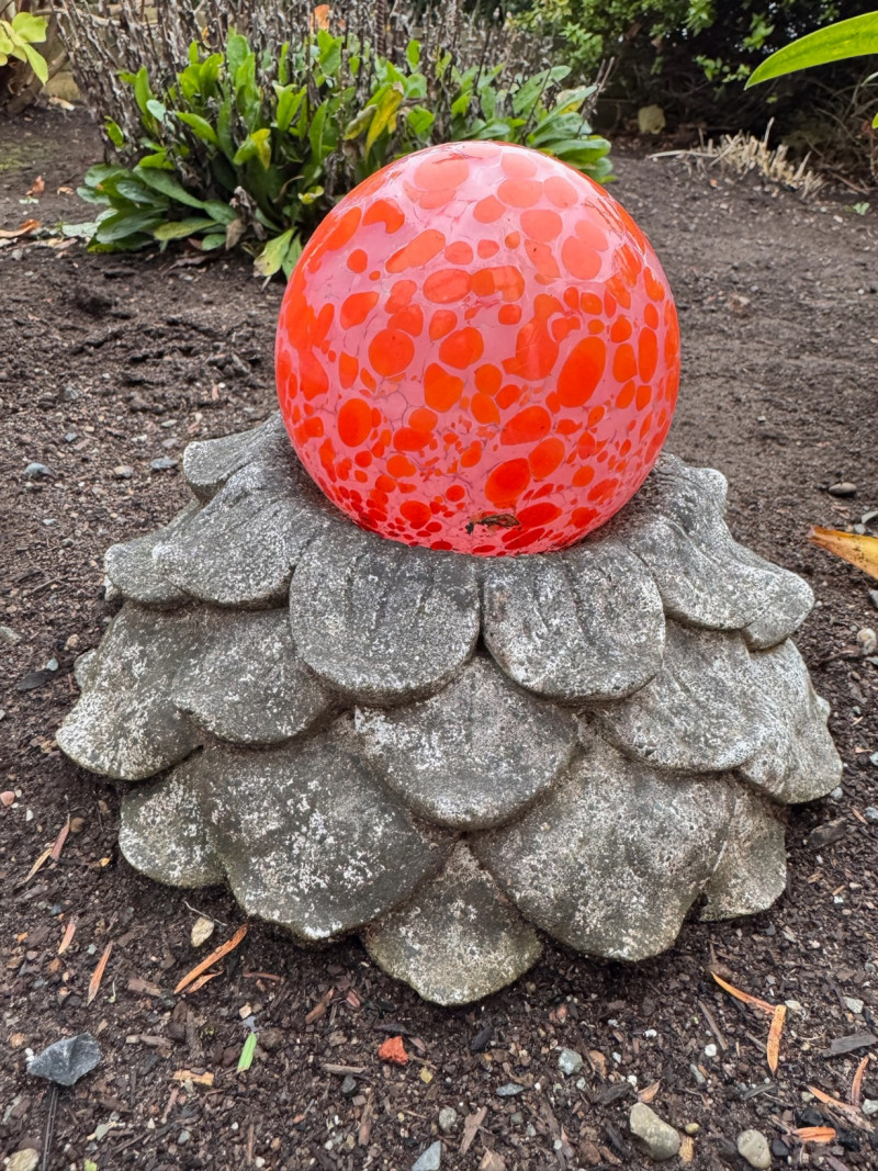 Orange Blown-Glass Garden Ball w/ Concrete Flower Base.