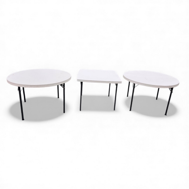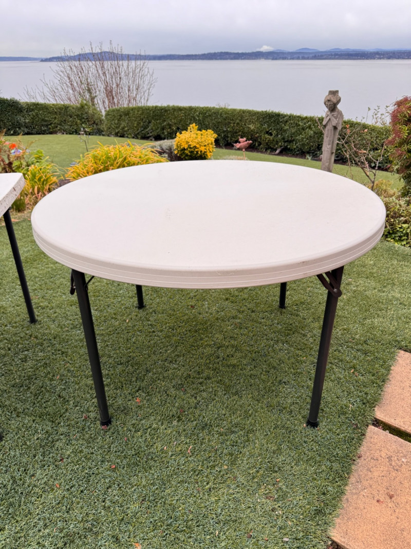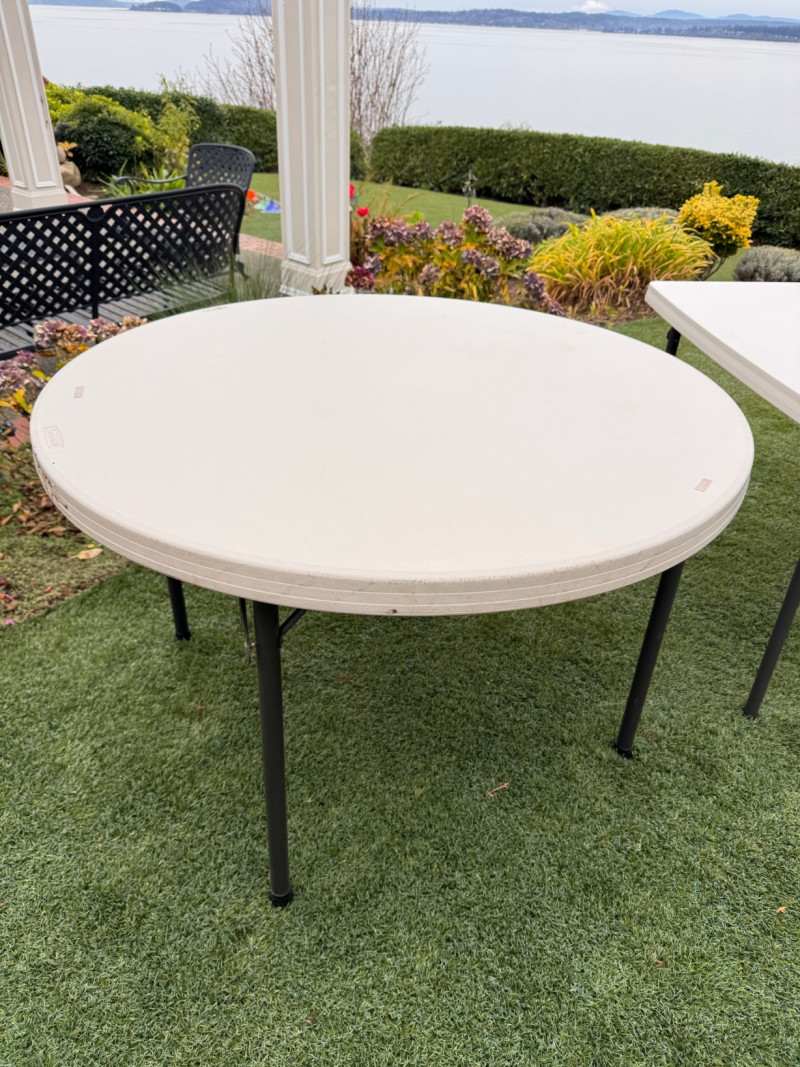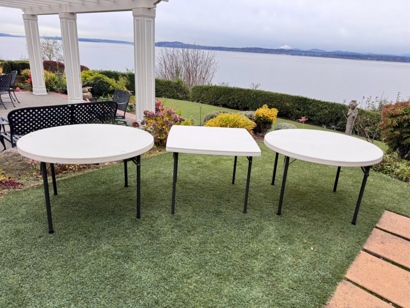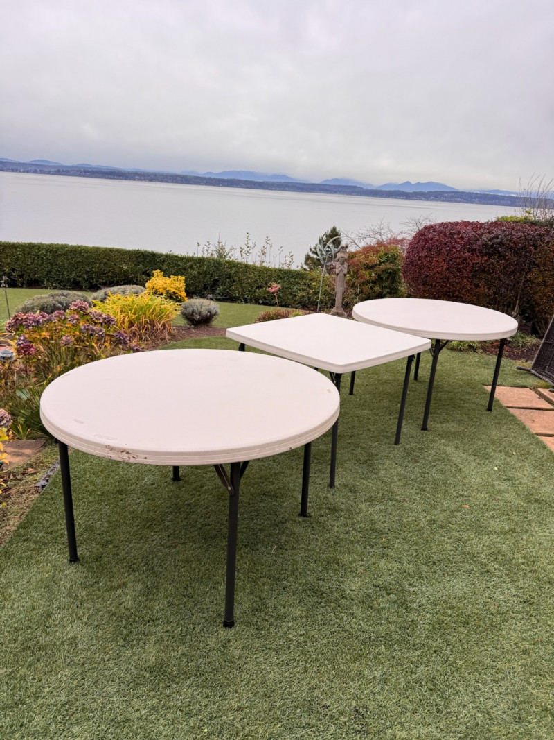 3 Lifetime Folding Tables – 2 Round + 1 Square. Set of three durable outdoor/indoor Lifetime-brand folding tables. Includes: Two round tables – 45" diameter × 29" H One square table – 36" × 36" × 29" H