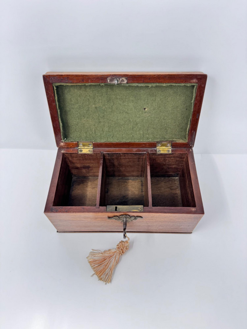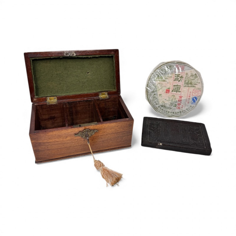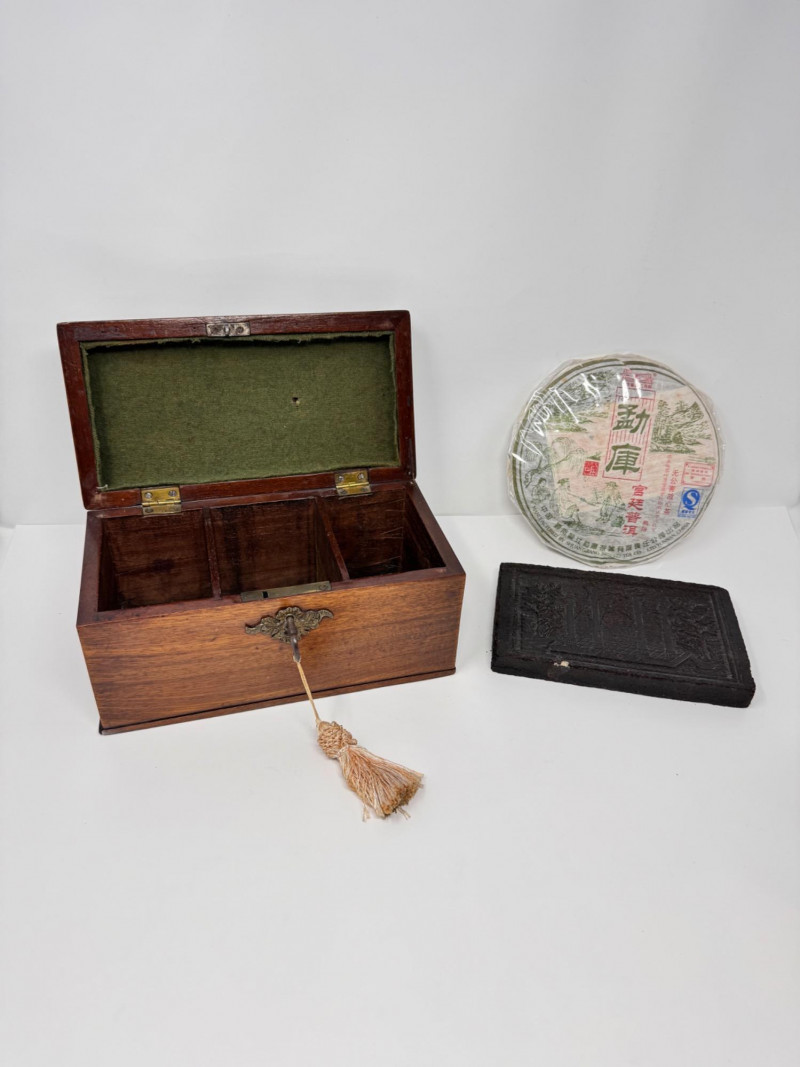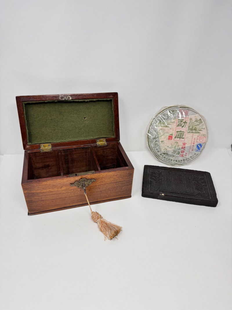 Wooden Tea Caddy, Chinese Tea Brick, & Mengku Pu-erh Tea Cake. Wooden tea caddy with brass hardware and tassel key Approx. 10" x 5" x 5" Green felt-lined interior with three compartments Chinese pressed tea brick Approx. 7" x 4½" Decorative molded pattern on both sides Mengku Rongshi Pu-erh tea cake Produced by Shuangjiang Mengku Tea Co., Yunnan, China Still sealed in original wrapper
