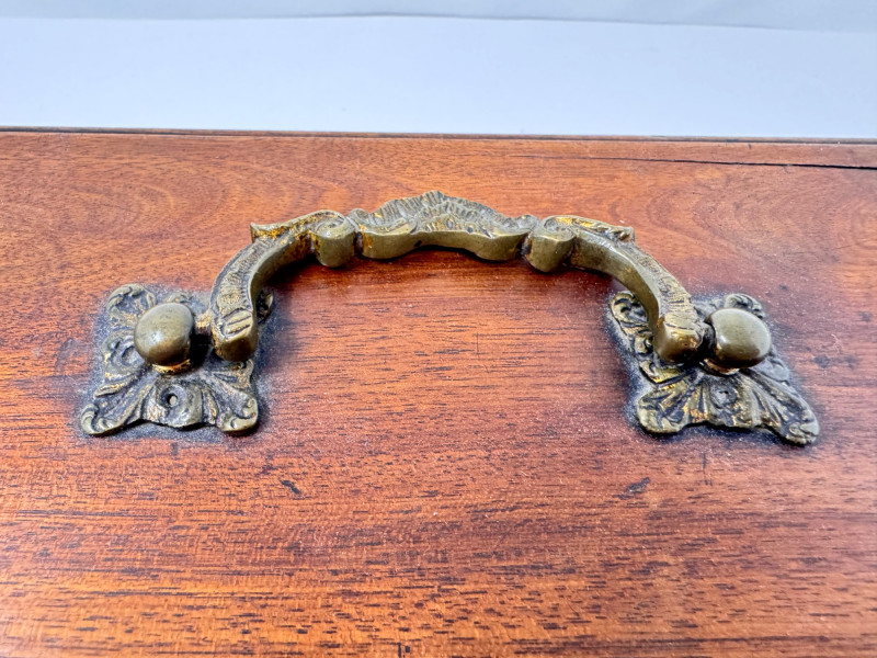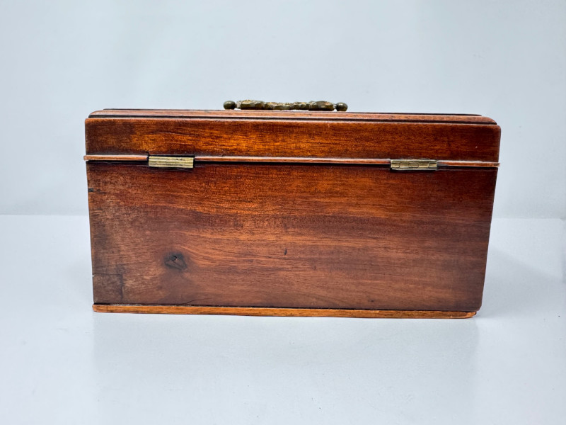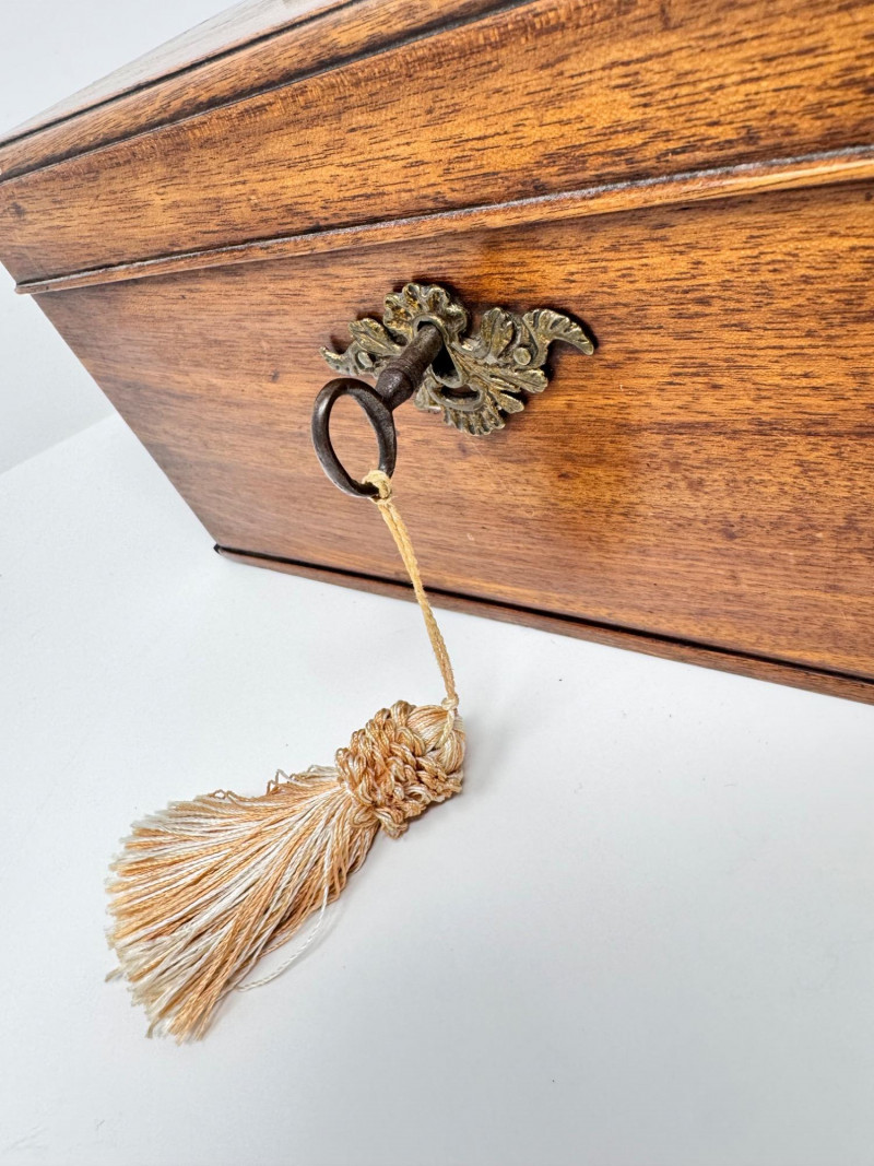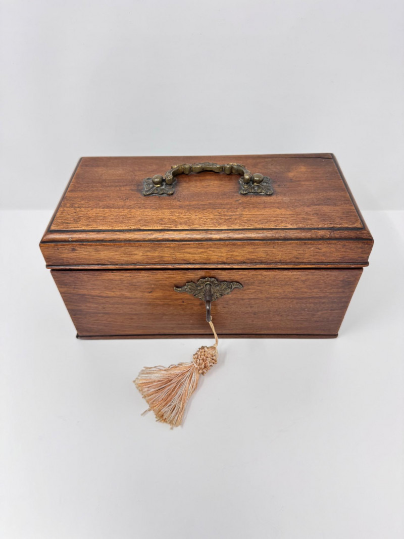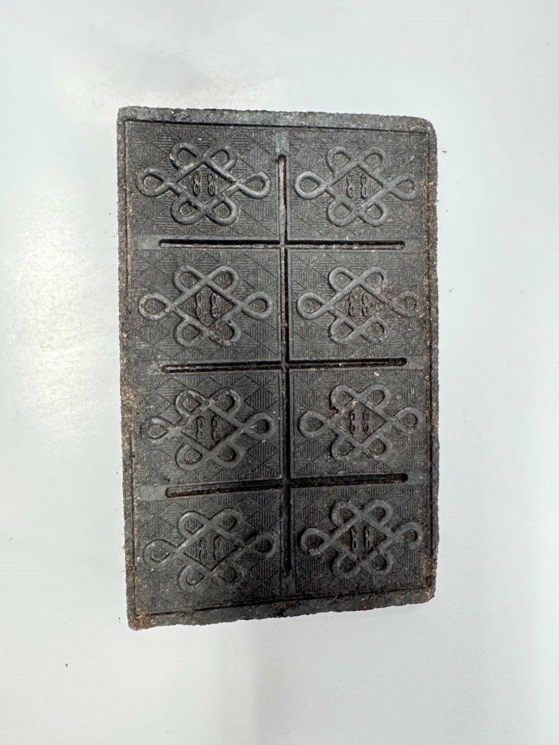 Wooden Tea Caddy, Chinese Tea Brick, & Mengku Pu-erh Tea Cake. Wooden tea caddy with brass hardware and tassel key Approx. 10" x 5" x 5" Green felt-lined interior with three compartments Chinese pressed tea brick Approx. 7" x 4½" Decorative molded pattern on both sides Mengku Rongshi Pu-erh tea cake Produced by Shuangjiang Mengku Tea Co., Yunnan, China Still sealed in original wrapper