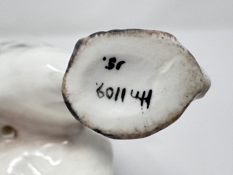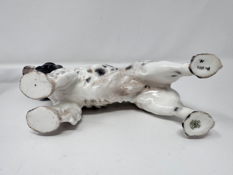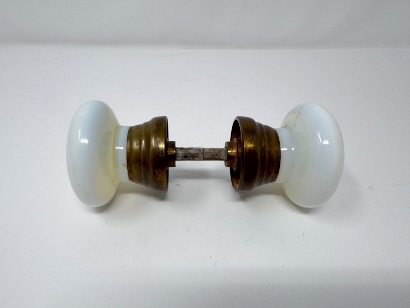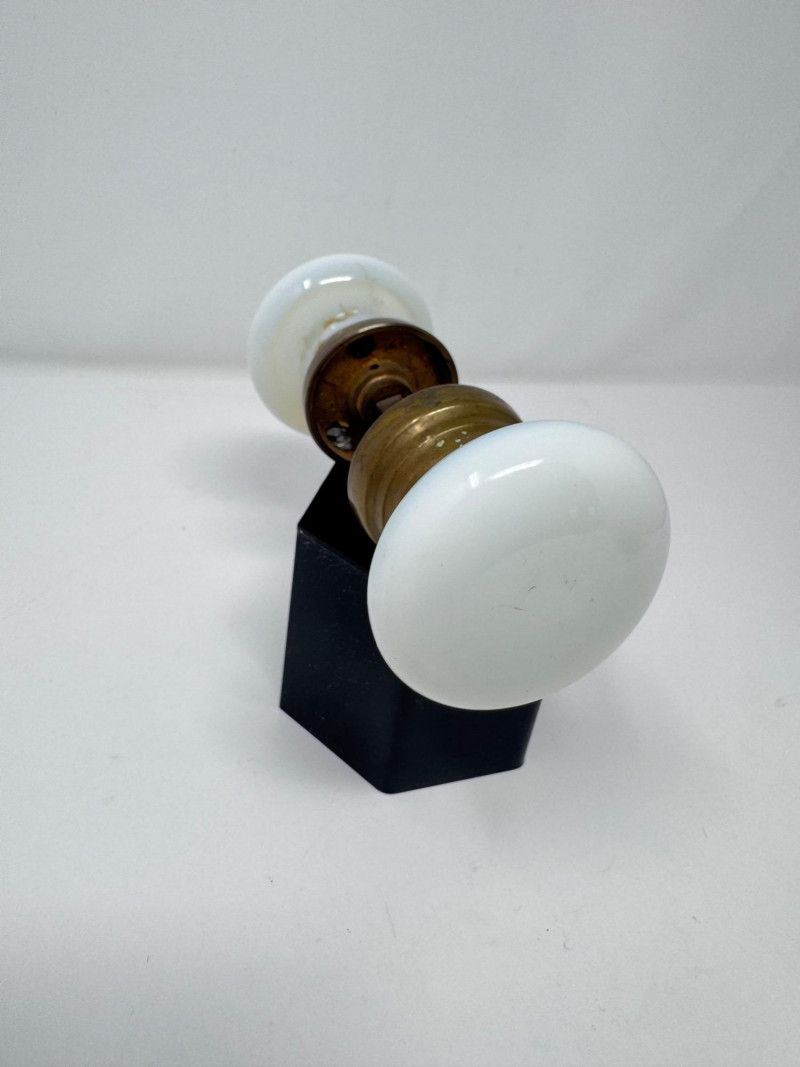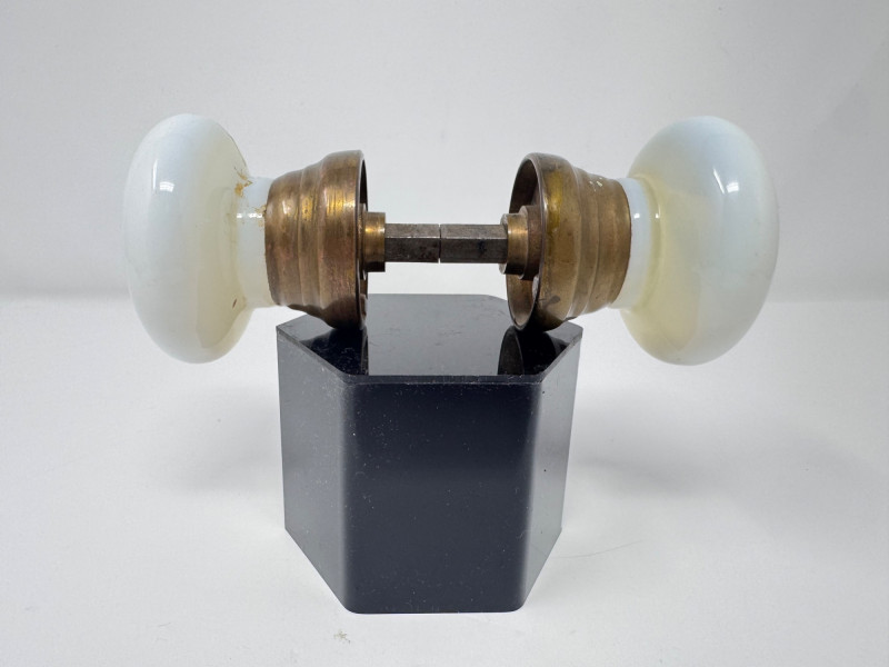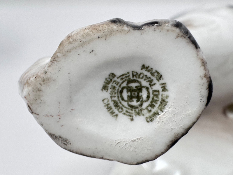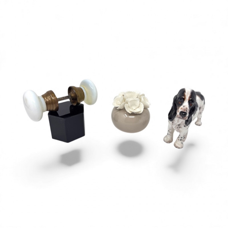 Porcelain Decor Trio: Royal Doulton Dog, Floral Vase & Glass Door Knob. Dog Figurine: Marked Royal Doulton England – Bone China Approx. height: 6" Floral Vase: Stamped on base (maker’s mark shown in photos) Approx. size: 3–4" Glass Door Knobs: Vintage milk-glass style with brass hardware Approx. width: 5–6" overall