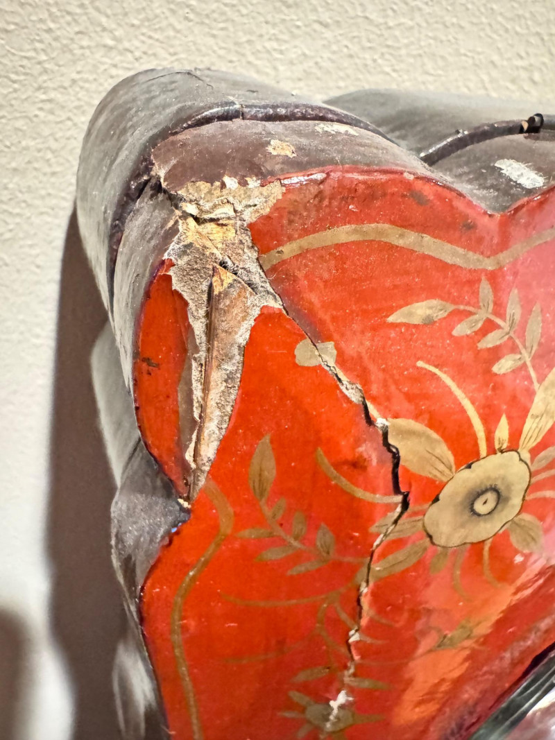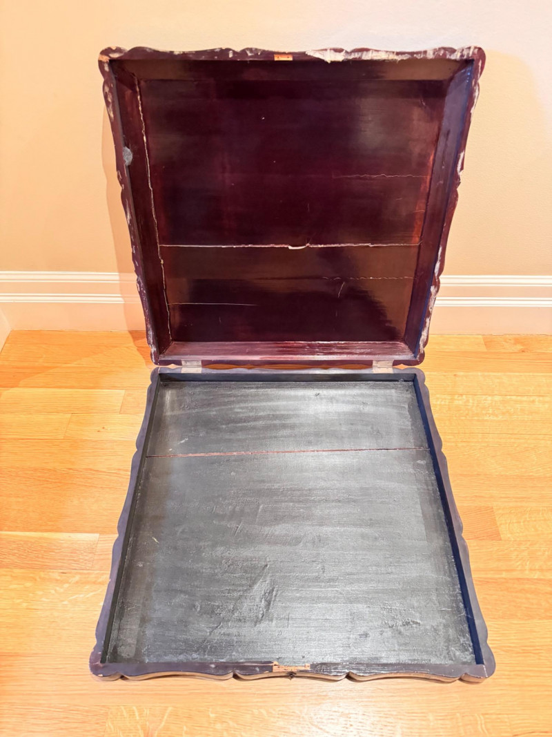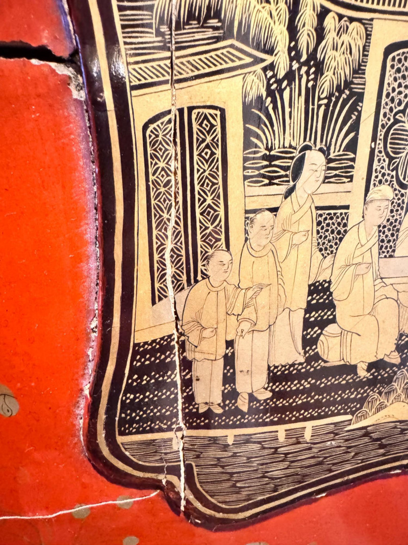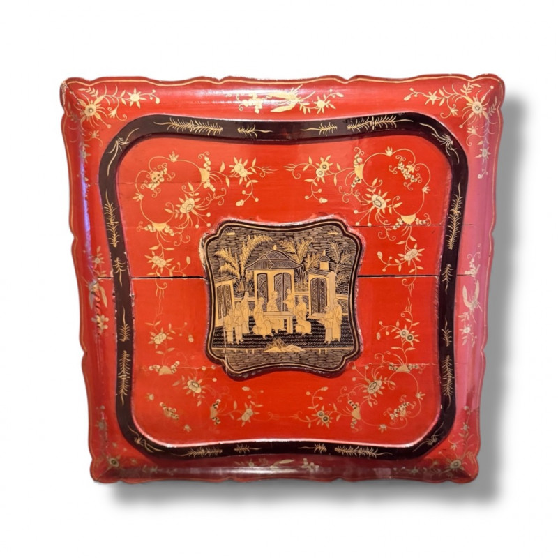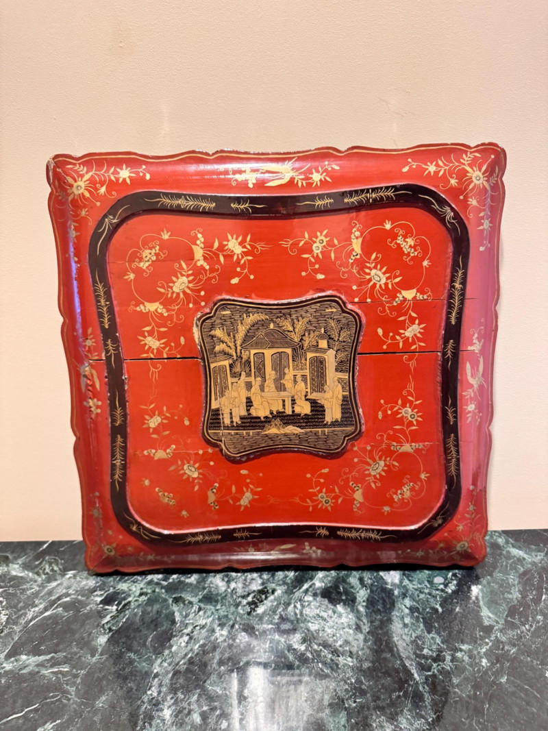 Antique Chinese Red Lacquer Box w/ Gold/Black Motifs.