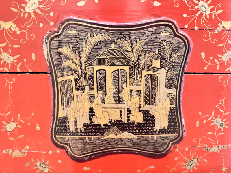 Lot # 148 - Antique Chinese Red Lacquer Box w/ Gold/Black Motifs
