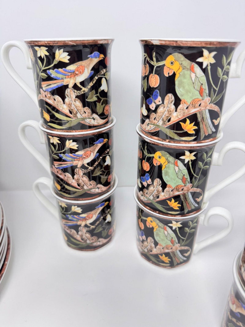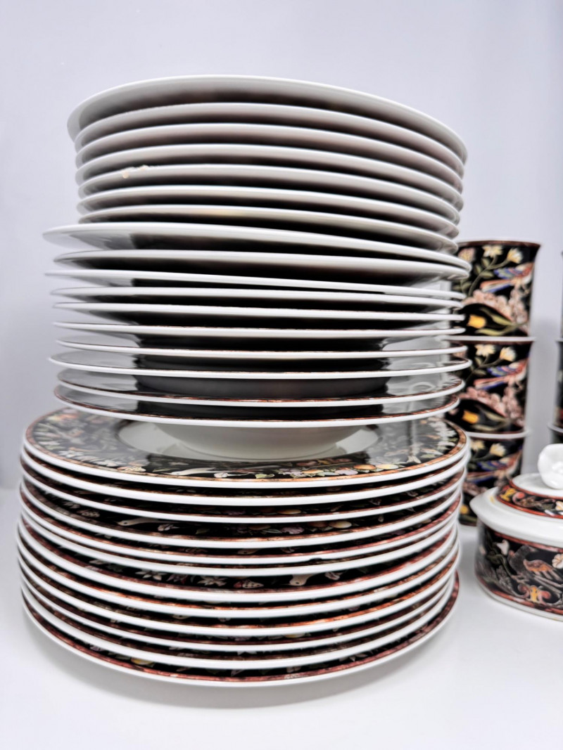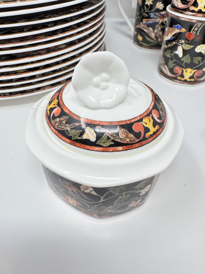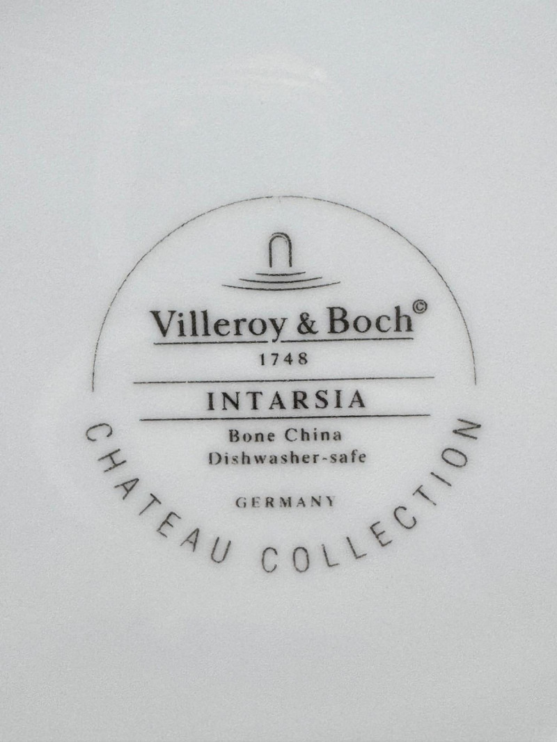 Villeroy & Boch “Intarsia” Bone China – 40-Piece Set. Pattern: Intarsia, by Villeroy & Boch Design Collection (Germany) 40 pieces total Includes: 12 dinner plates (1 plate has a chip) 10 salad plates 8 dessert plates 8 cups 1 creamer 1 covered sugar bowl