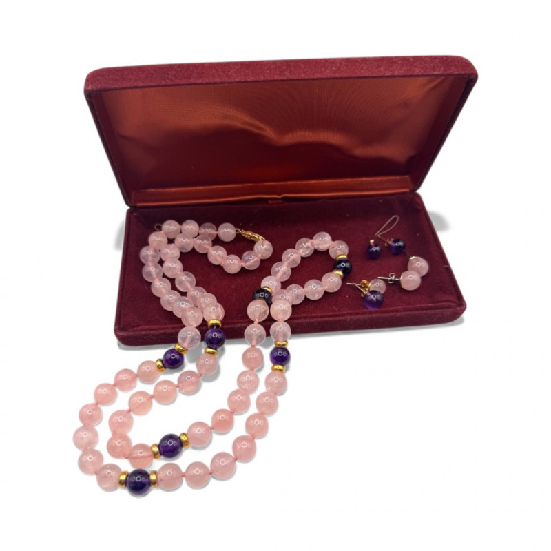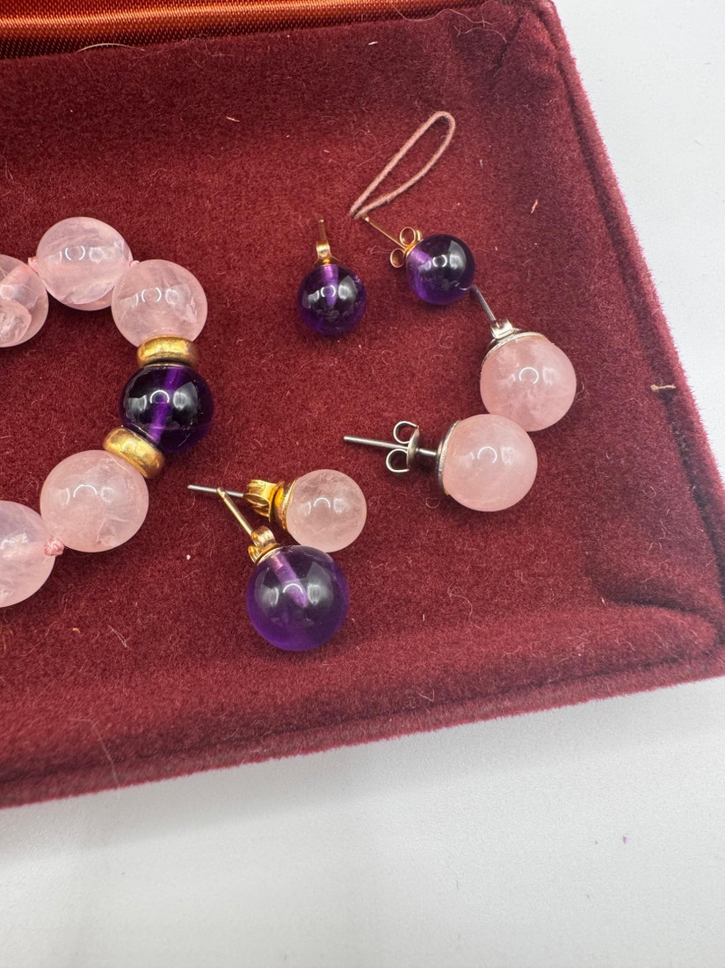 Rose Quartz & Amethyst Necklace Set w/ 14K Accents & Earrings. Includes 2 complete pairs of matching stone earrings Plus 2 additional mismatched earrings Three earring backs marked 14K Comes with velvet presentation box. General Disclaimer:All items are sold as-is. Jewelry, metals, gemstones, and other minerals have not been tested unless specifically noted. No guarantees are made regarding metal content, gemstone type, or origin. Refunds will not be issued based on identification, classification, or perceived quality.