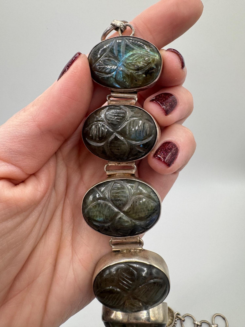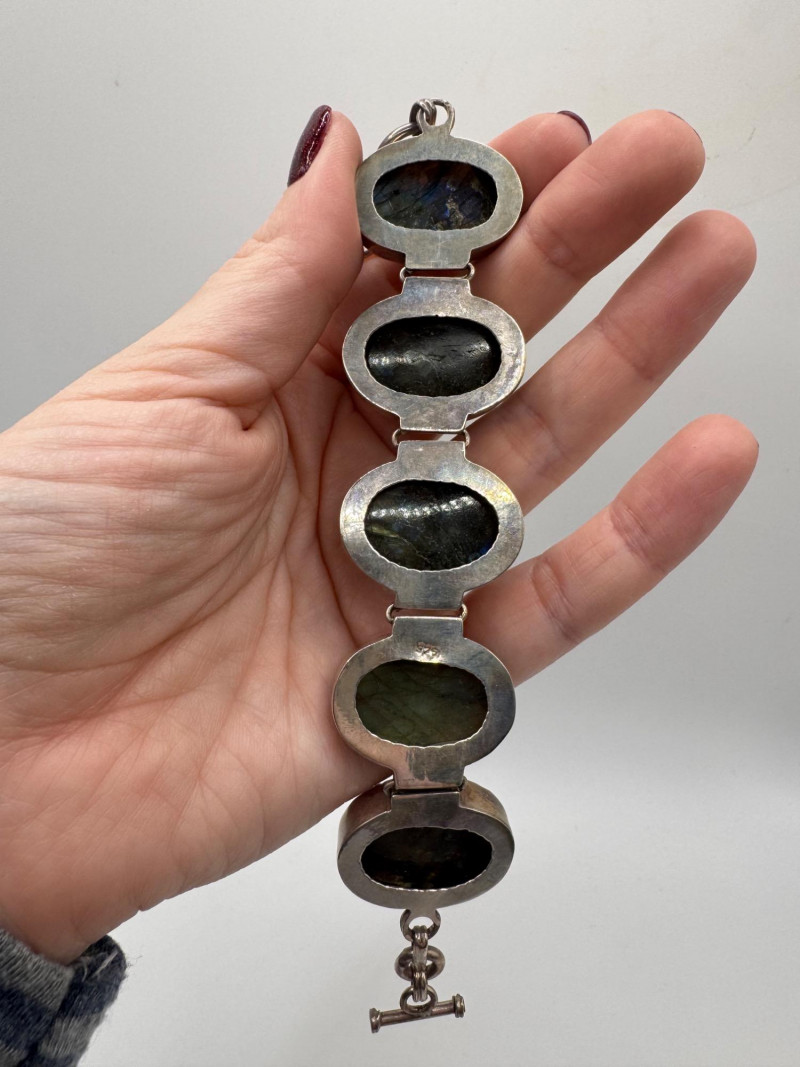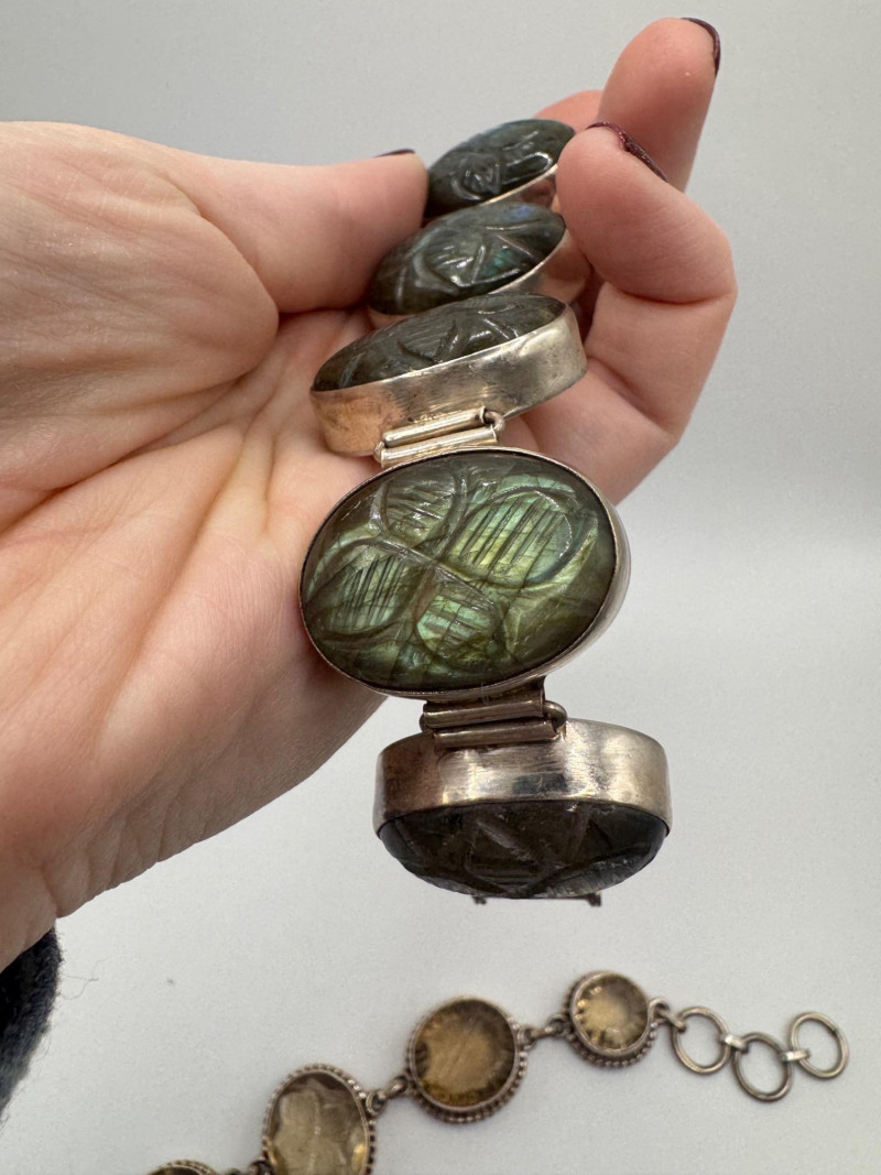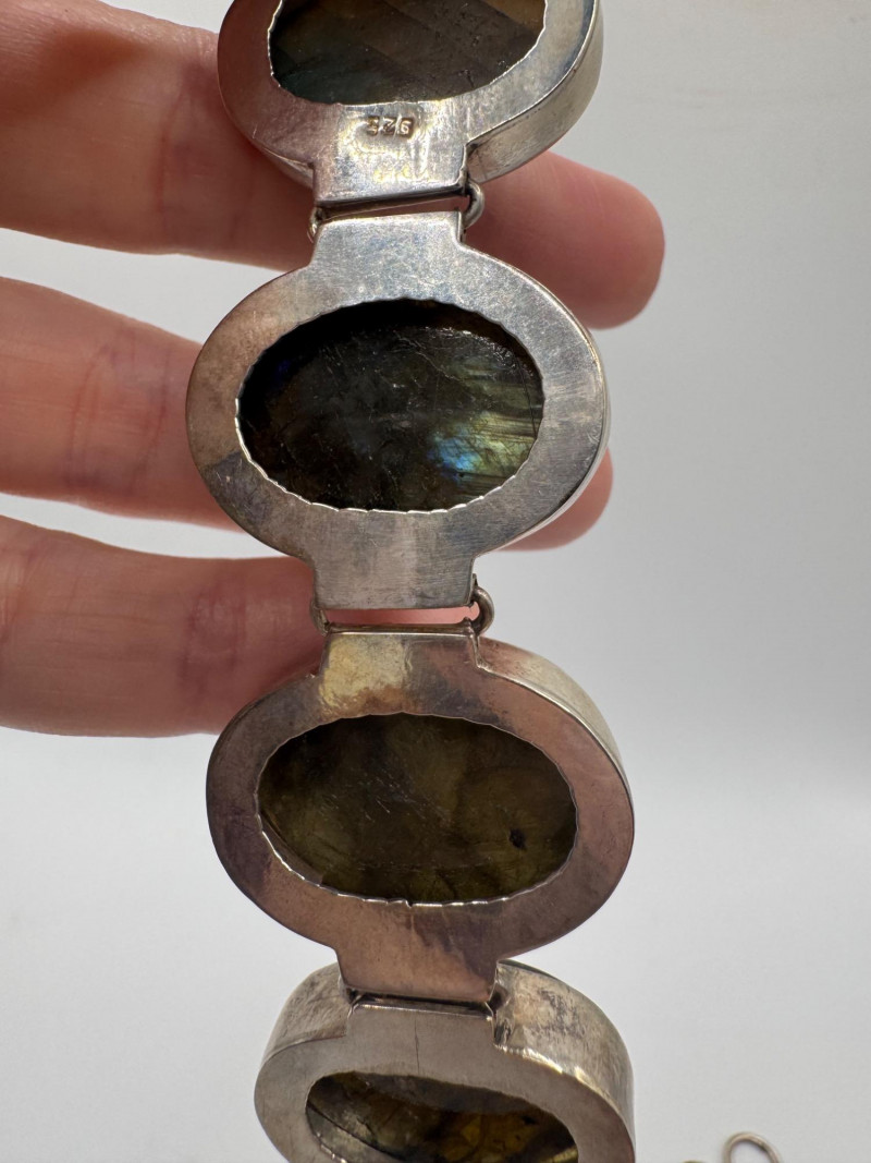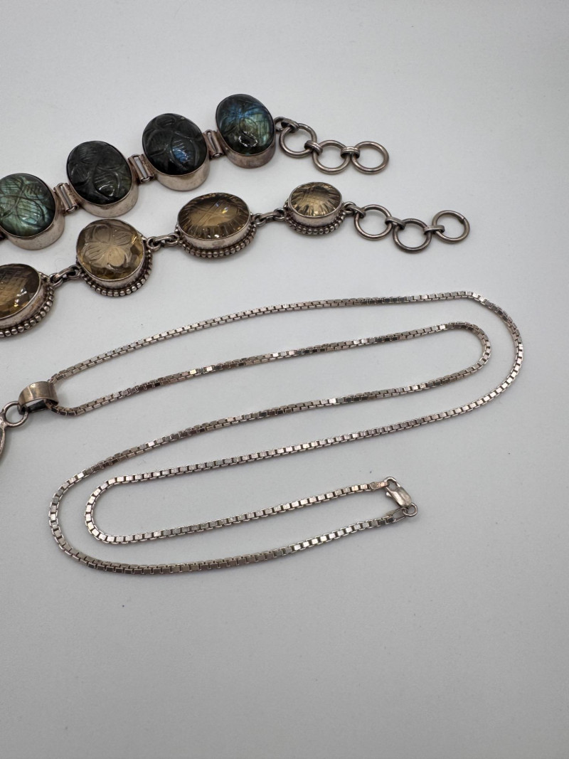 Sterling Labradorite & Smoky Glass Bracelet + Pendant 143.17g.