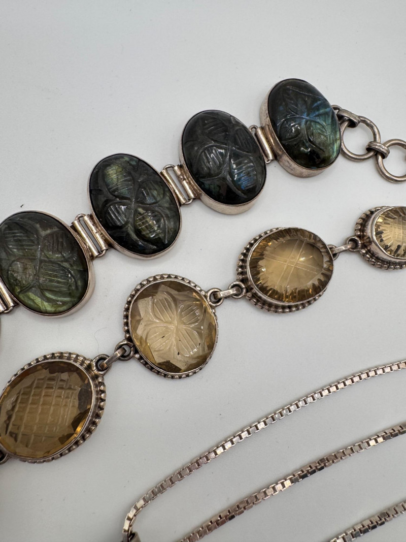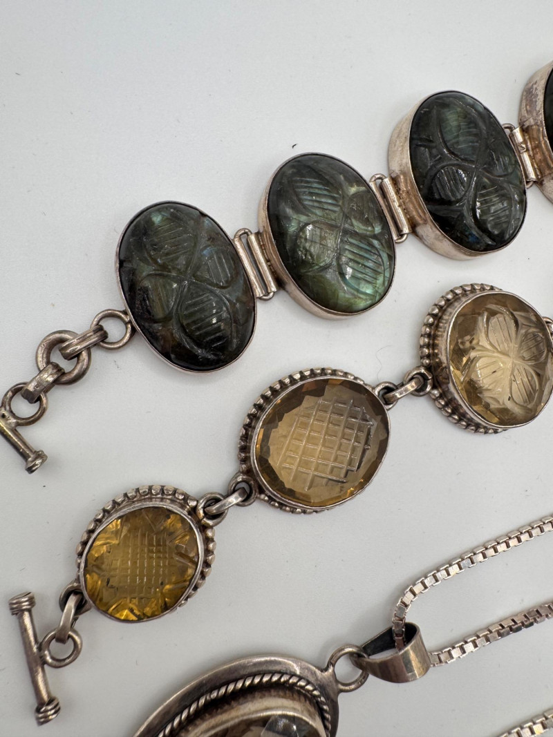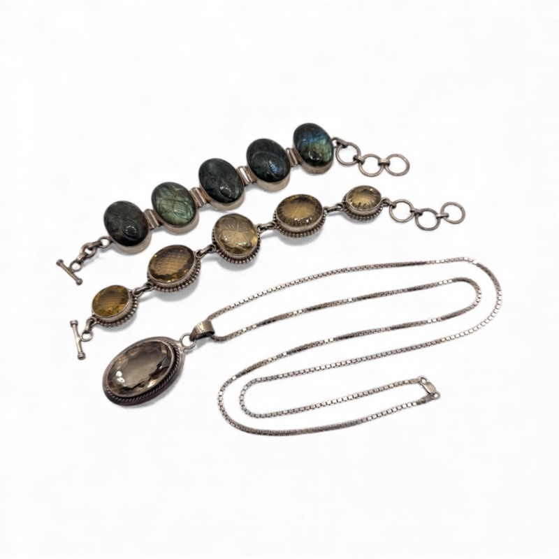 Lot # 12 - Sterling Labradorite & Smoky Glass Bracelet + Pendant 143.17g