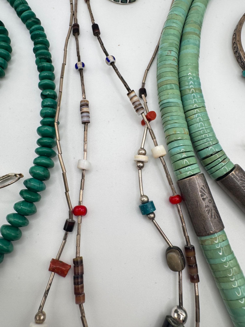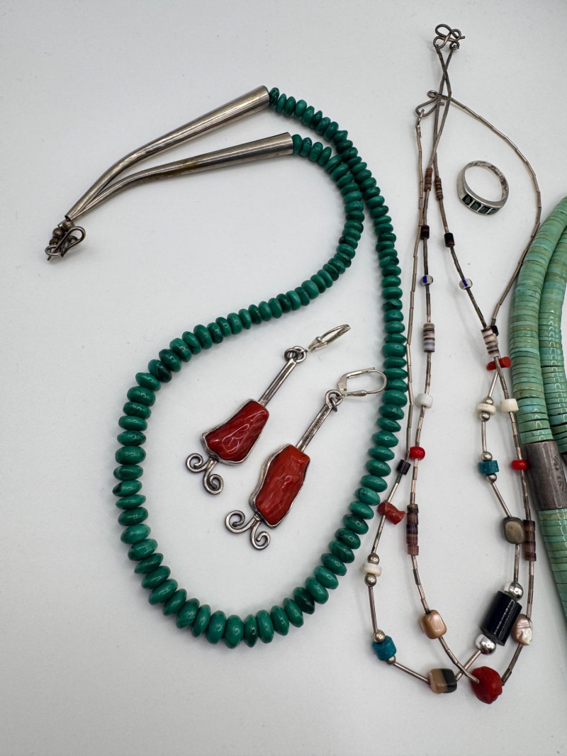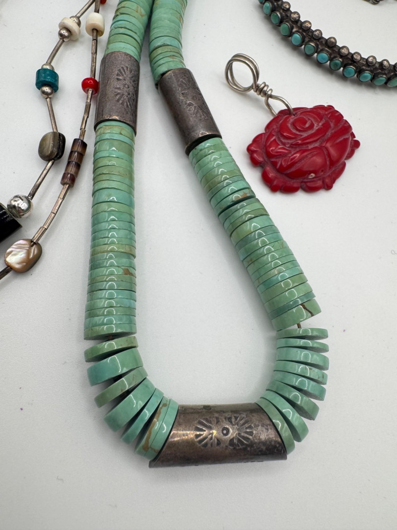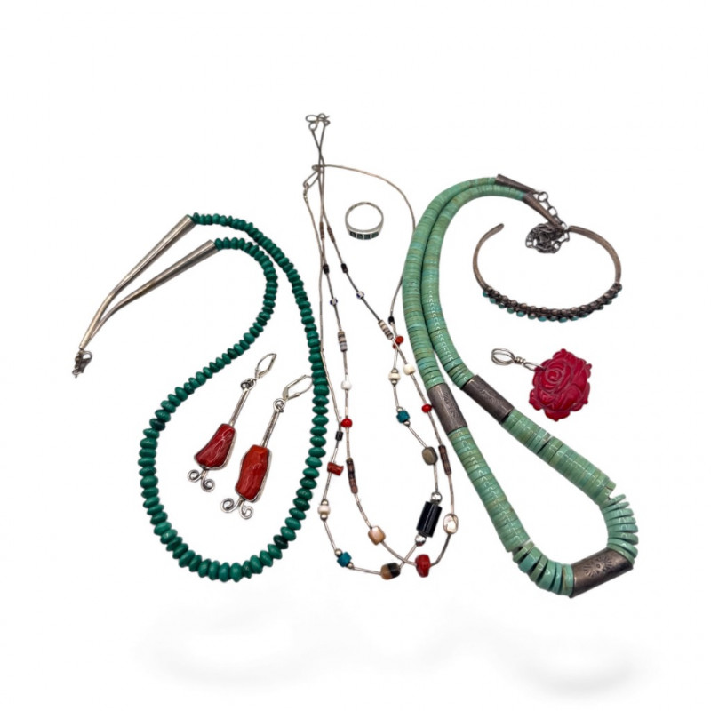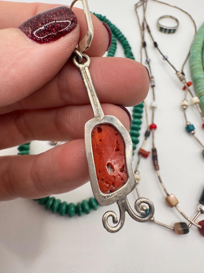 Green Lapis Pendant, Rose Pendant & Sterling Silver Earrings. Note: Only the earrings are marked sterling. All other metals are untested and sold as unknown. General Disclaimer:All items are sold as-is. Jewelry, metals, gemstones, and other minerals have not been tested unless specifically noted. No guarantees are made regarding metal content, gemstone type, or origin. Refunds will not be issued based on identification, classification, or perceived quality.