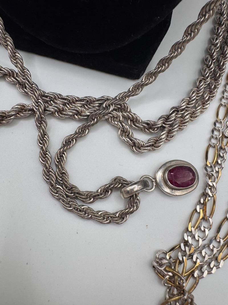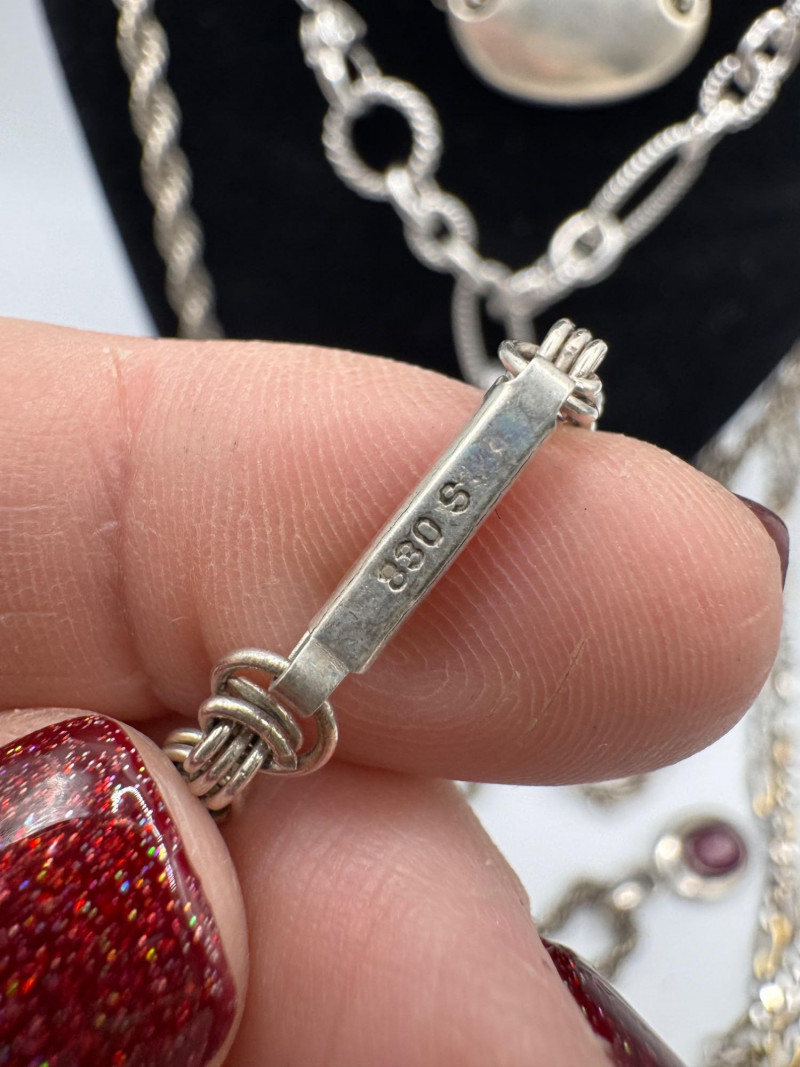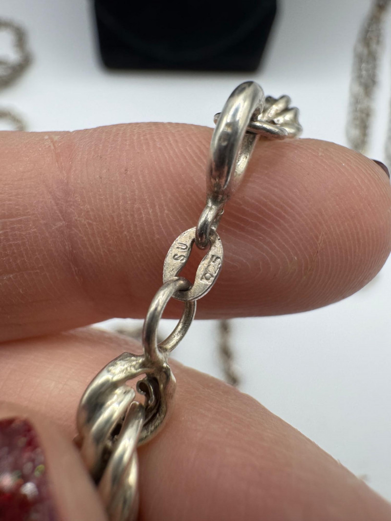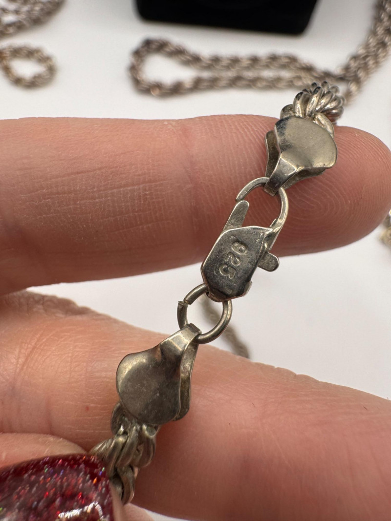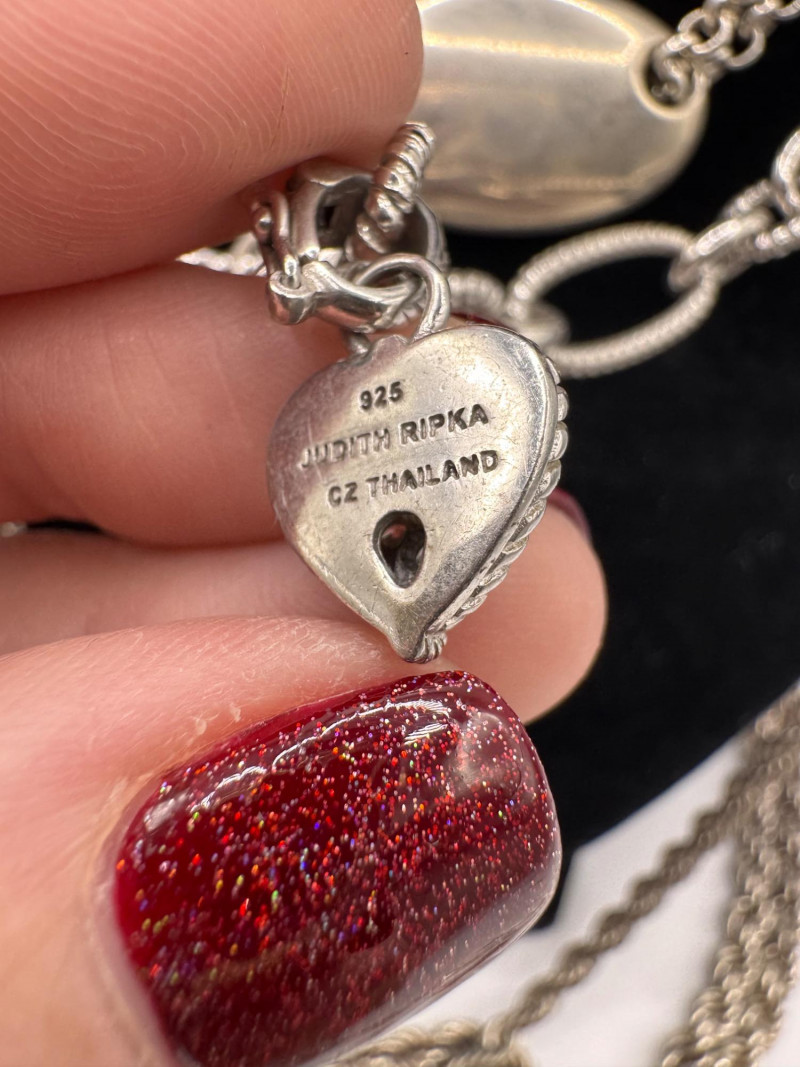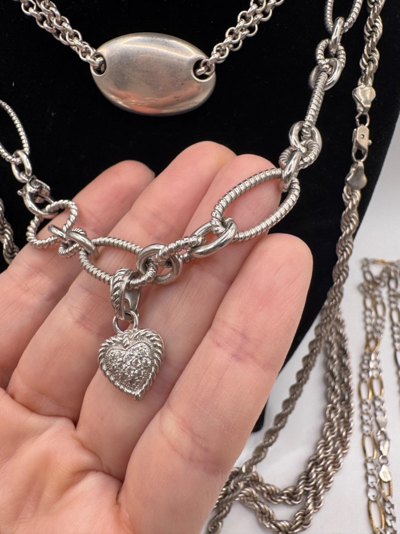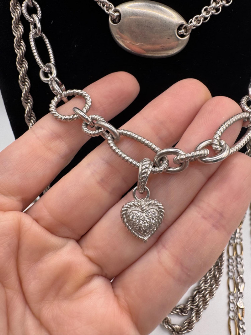 Mixed Sterling Silver Necklace Chains w/ Judith Ripka Pendant 269.59g. Total weight: 269.59 grams (all pieces marked silver) Mix of sterling silver chains in various styles and lengths Includes: One chain marked 830 silver (heavier tarnish) Judith Ripka 925 piece with textured heart pendant (CZ Thailand) Oval tag pendant marked 925 Pink stone pendant (cabochon style) in 925 setting. General Disclaimer:All items are sold as-is. Jewelry, metals, gemstones, and other minerals have not been tested unless specifically noted. No guarantees are made regarding metal content, gemstone type, or origin. Refunds will not be issued based on identification, classification, or perceived quality.