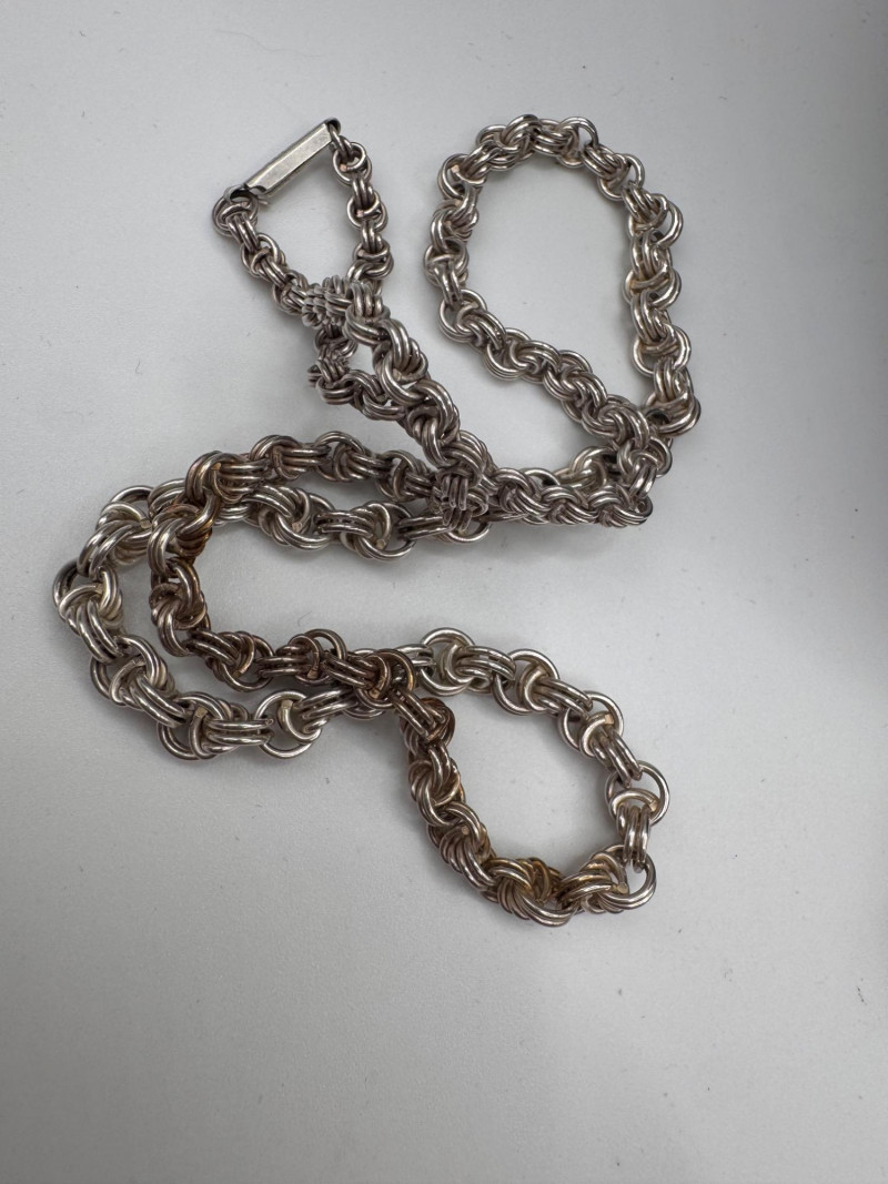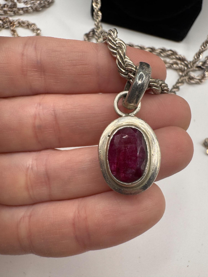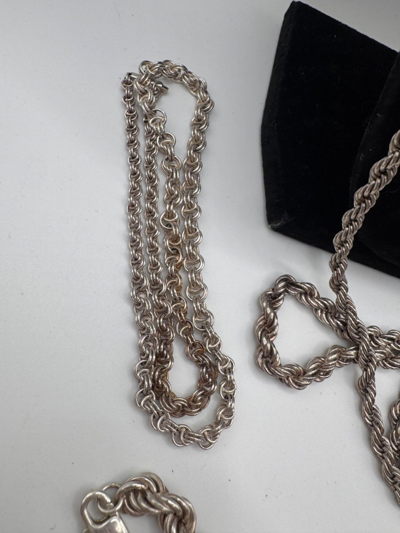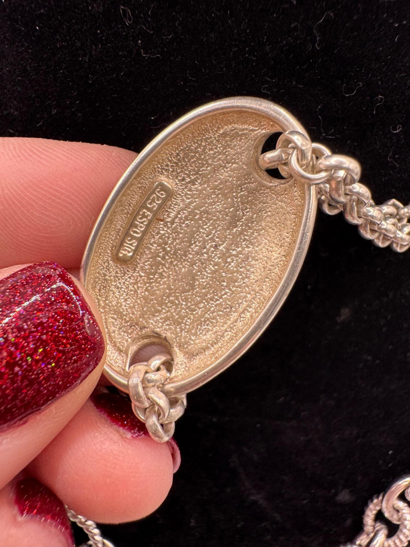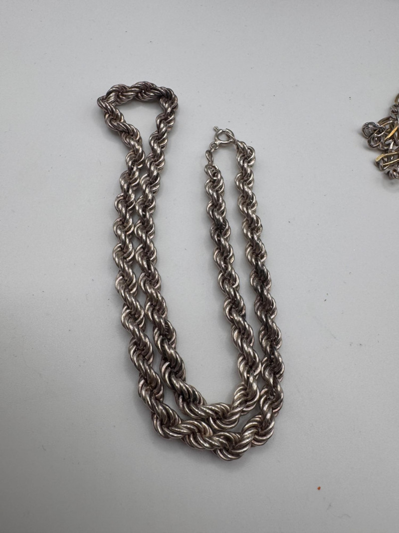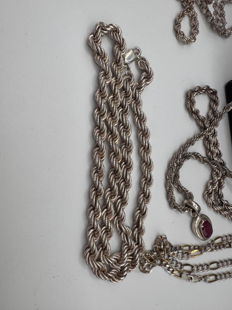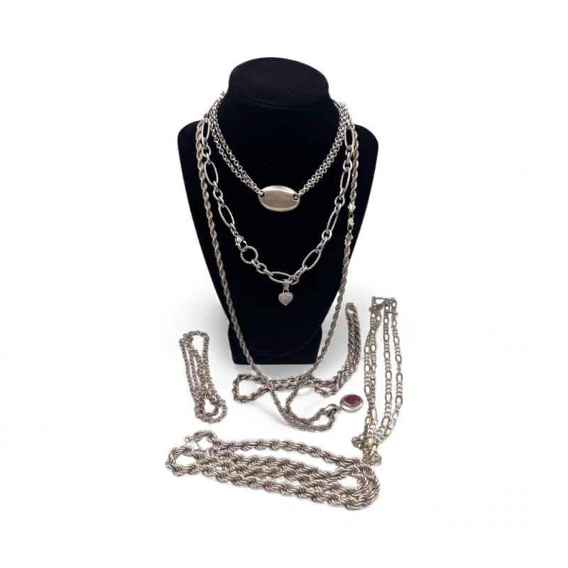 Mixed Sterling Silver Necklace Chains w/ Judith Ripka Pendant 269.59g. Total weight: 269.59 grams (all pieces marked silver) Mix of sterling silver chains in various styles and lengths Includes: One chain marked 830 silver (heavier tarnish) Judith Ripka 925 piece with textured heart pendant (CZ Thailand) Oval tag pendant marked 925 Pink stone pendant (cabochon style) in 925 setting. General Disclaimer:All items are sold as-is. Jewelry, metals, gemstones, and other minerals have not been tested unless specifically noted. No guarantees are made regarding metal content, gemstone type, or origin. Refunds will not be issued based on identification, classification, or perceived quality.