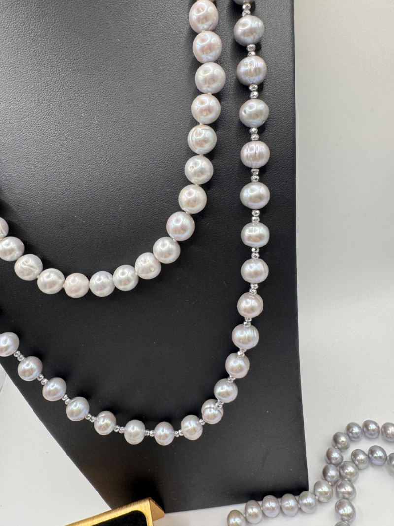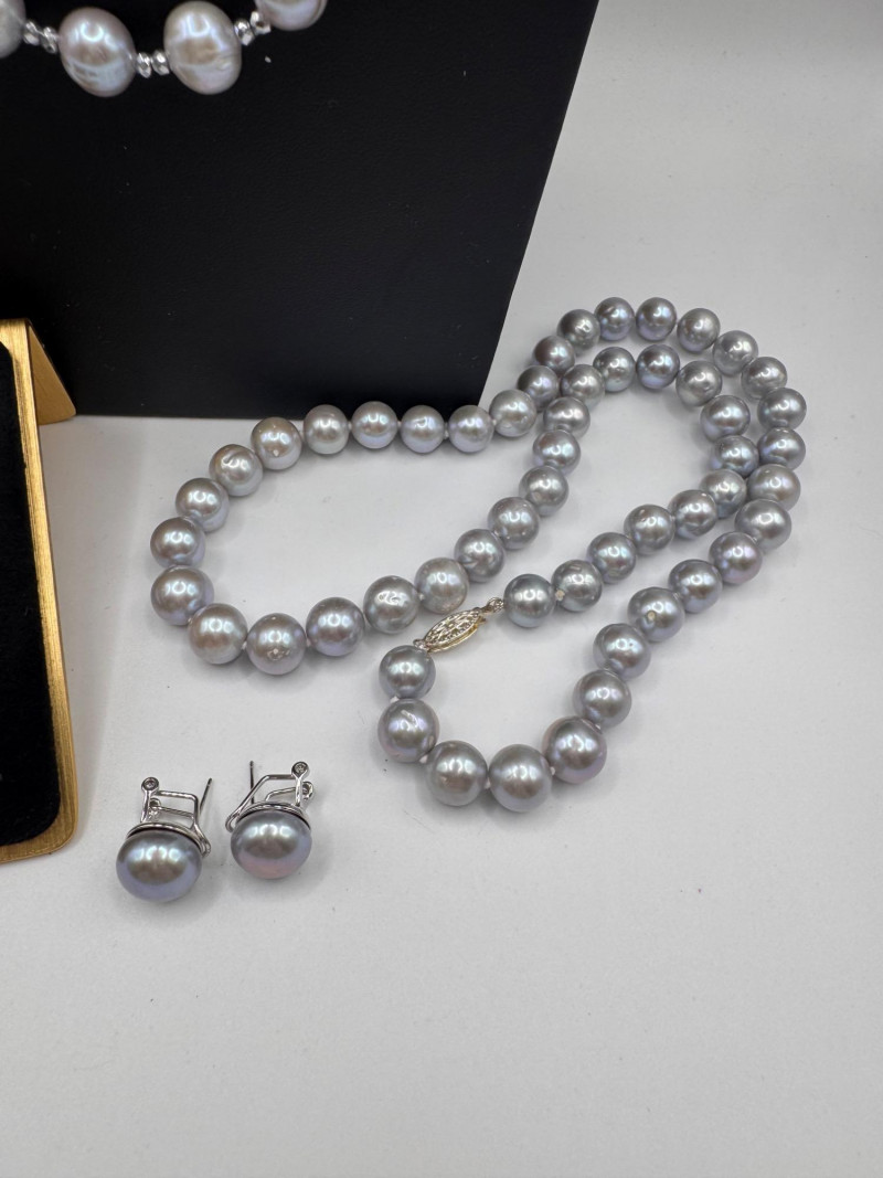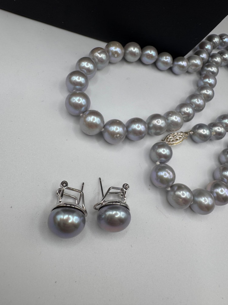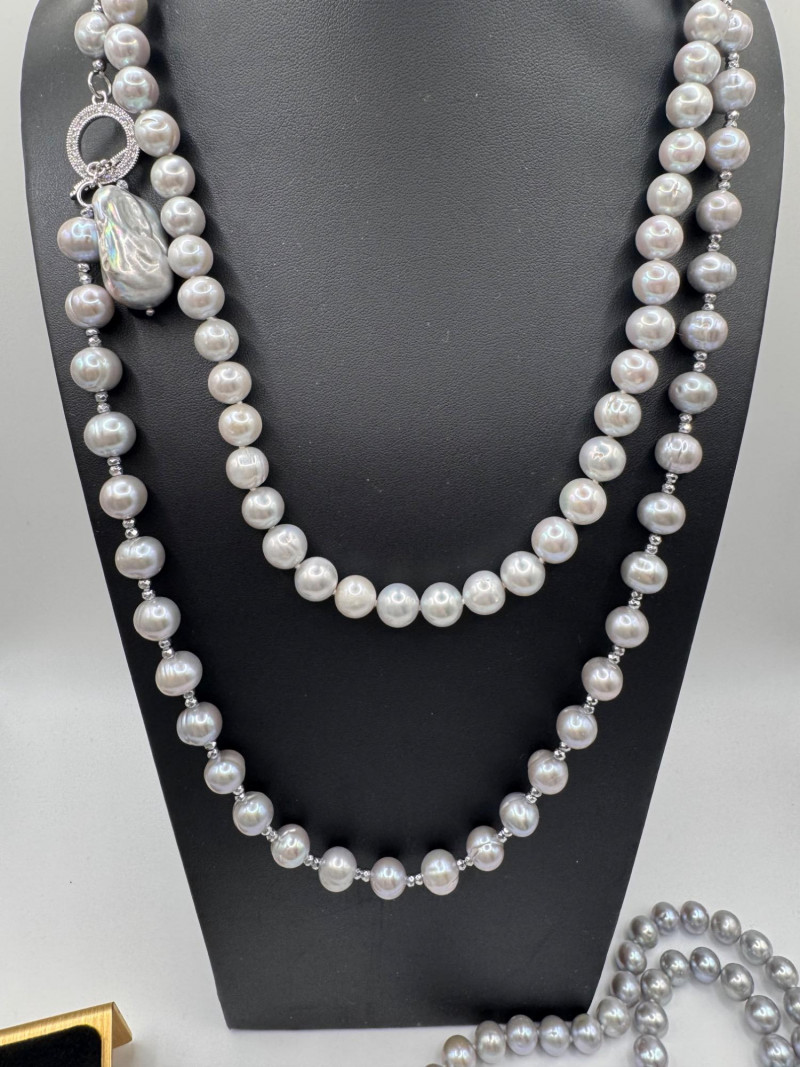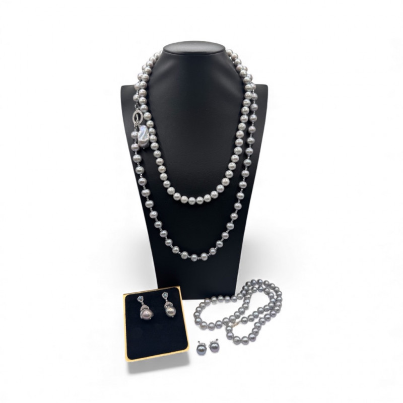 Silver Freshwater Pearl Jewelry Set – Necklaces, Earrings & Pendant. JTV pieces with tags: PWP324B-22 – 9–10mm silver cultured freshwater pearls, 22" sterling silver strand CPL967D – 11–12mm silver cultured freshwater pearl earrings, rhodium over sterling, made in Canada One long strand with silver-gray round pearls and decorative clasp Pair of dangle earrings with large baroque pearls and crystal accents Pendant features a large baroque pearl with crystal-set bail General Disclaimer:All items are sold as-is. Jewelry, metals, gemstones, and other minerals have not been tested unless specifically noted. No guarantees are made regarding metal content, gemstone type, or origin. Refunds will not be issued based on identification, classification, or perceived quality.